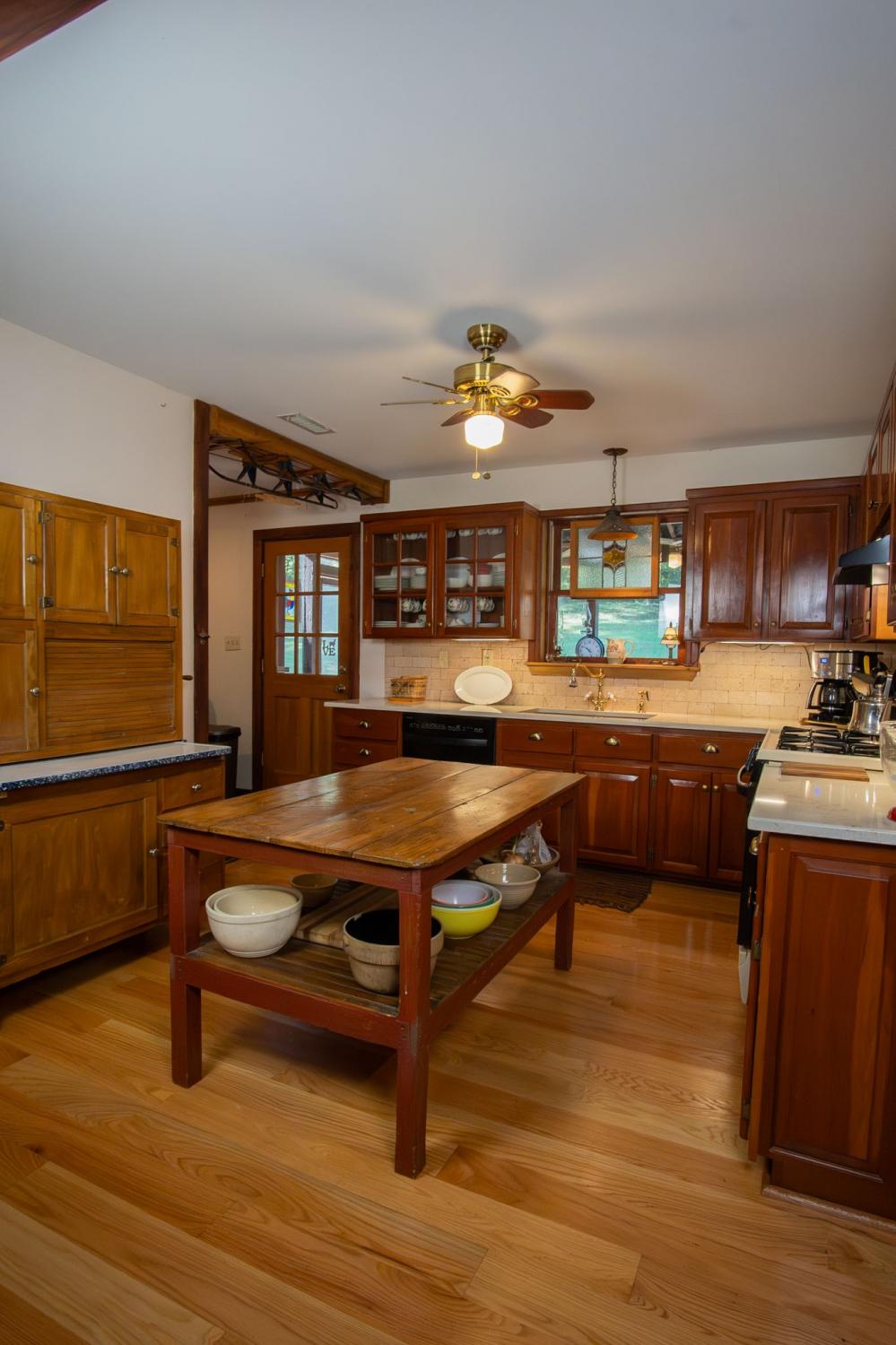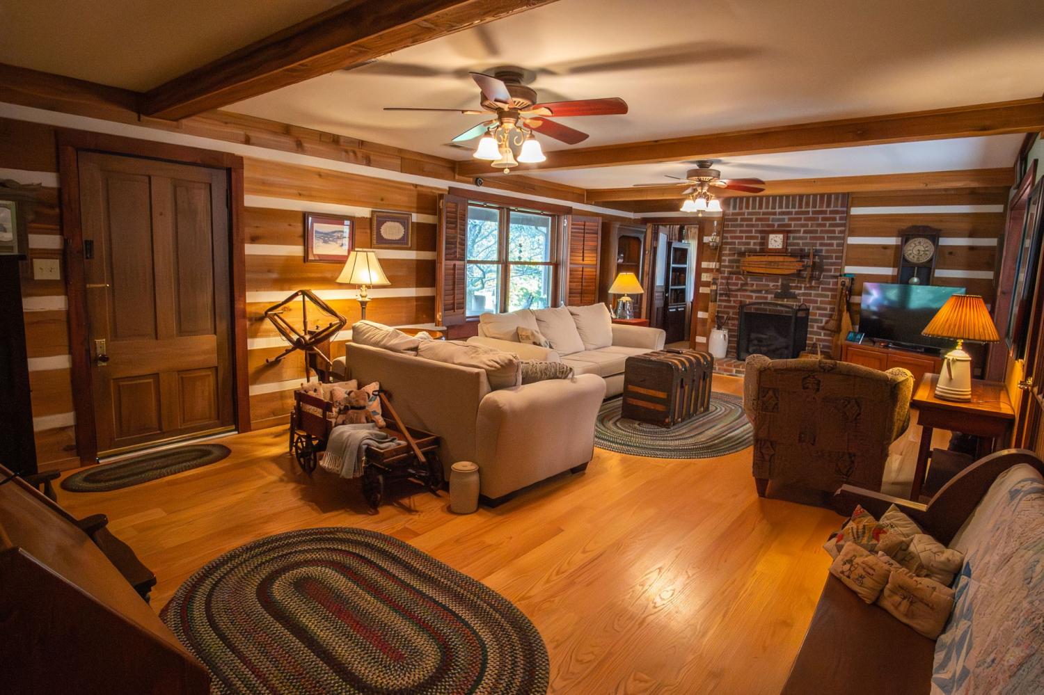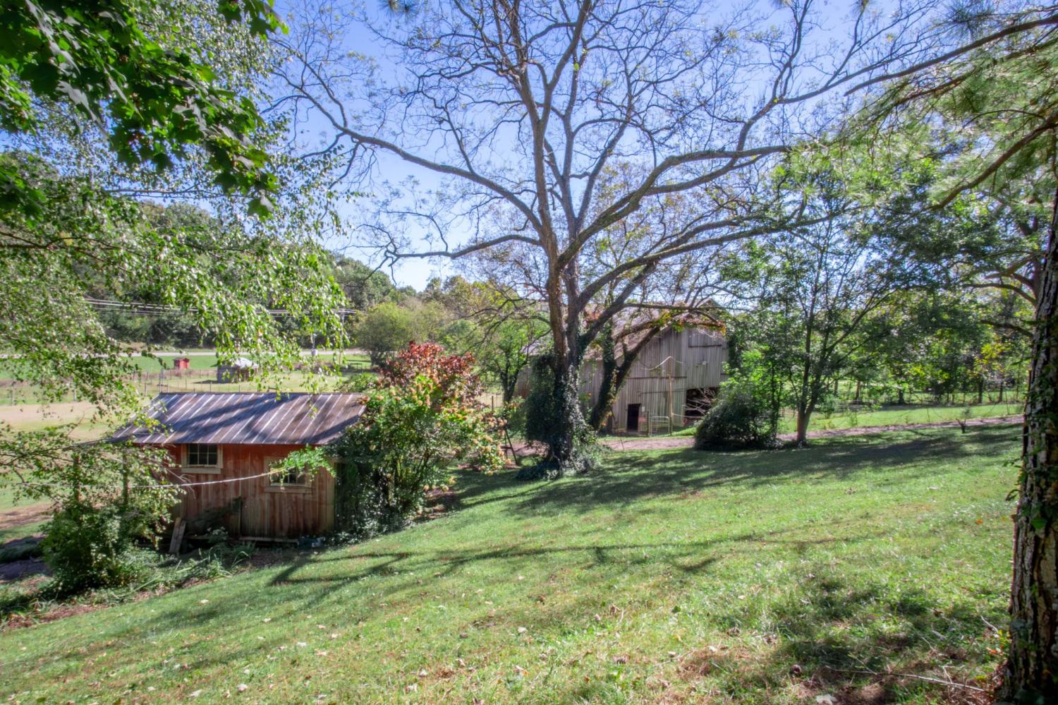 This charming 3-bedroom, 2-bath 2200+ sq ft ranch home with an office on 5 acres blends rustic style with modern comfort. Originally built in 1959 as a two-bedroom, one-bath home, it was expanded in 2000 with a spacious primary suite, a full new roof, and the addition of wide board siding with hand-finished chinking—capturing timeless cabin appeal with the strength of traditional framing. A large, welcoming front porch is perfect for rocking chairs and a swing and offers peaceful views of the grounds and pastures. The spacious family room has a gas fireplace and opens to the kitchen and dining room. French doors in the dining room lead to the large screened porch and deck overlooking the backyard. The kitchen was remodeled in 2019 with custom cherry cabinets built by the homeowner, quartz countertops, and a subway tile backsplash. The primary suite features a gas log fireplace, sitting area with vaulted ceiling, and a large bathroom with vaulted ceiling, a clawfoot tub and roomy shower. Bedrooms two and three are located on the opposite side of the home and share a hall bath (updated 2013). Outbuildings include a Chestnut-planked tobacco barn built in the late 1800s with stalls, tack area, electricity, and water; a 30×60 detached garage/shop (built in 2004) wired for 120V and 220V with four 12-foot-wide garage doors (three on the front, one on the end), concrete floor, aluminum roof, and fluorescent lighting; a 47×16 open-air equipment shed; and a carport with attached shed for lawn equipment. Two wells serve the property—one spring-fed for the barn and one near the home for gardening. Previously an active alpaca farm, this property is ideal for horses, alpacas, sheep, goats, or other livestock and offers the perfect blend of functionality, history, and peaceful country living—an ideal homestead just a short drive to Franklin, Nolensville, Nashville and all that Middle Tennessee has to offer.