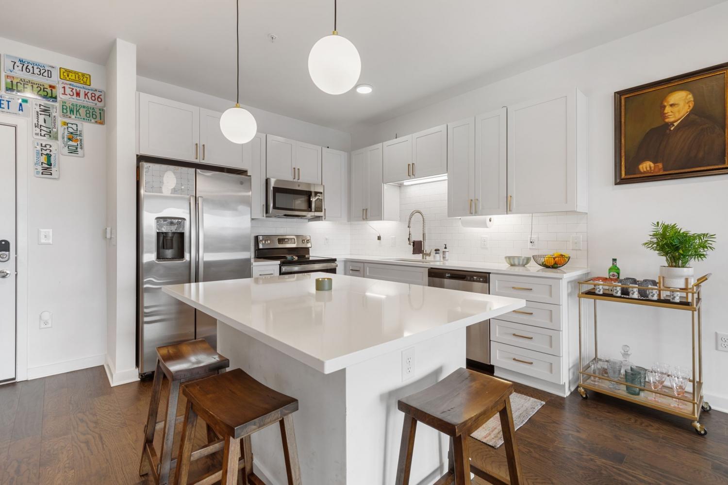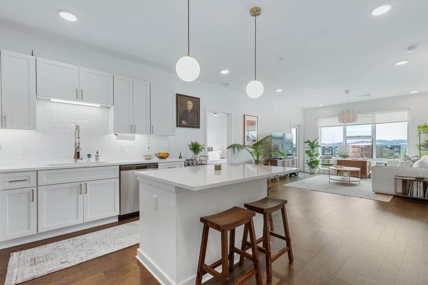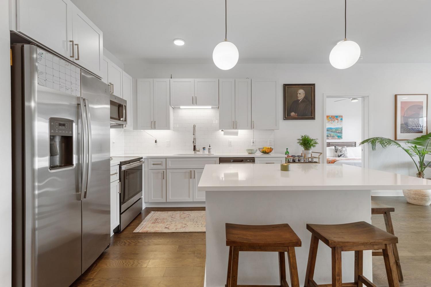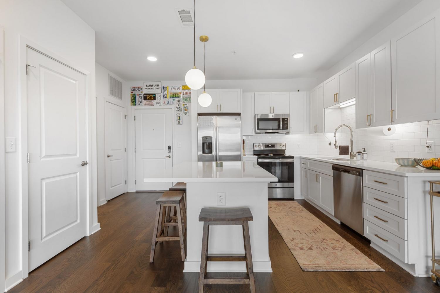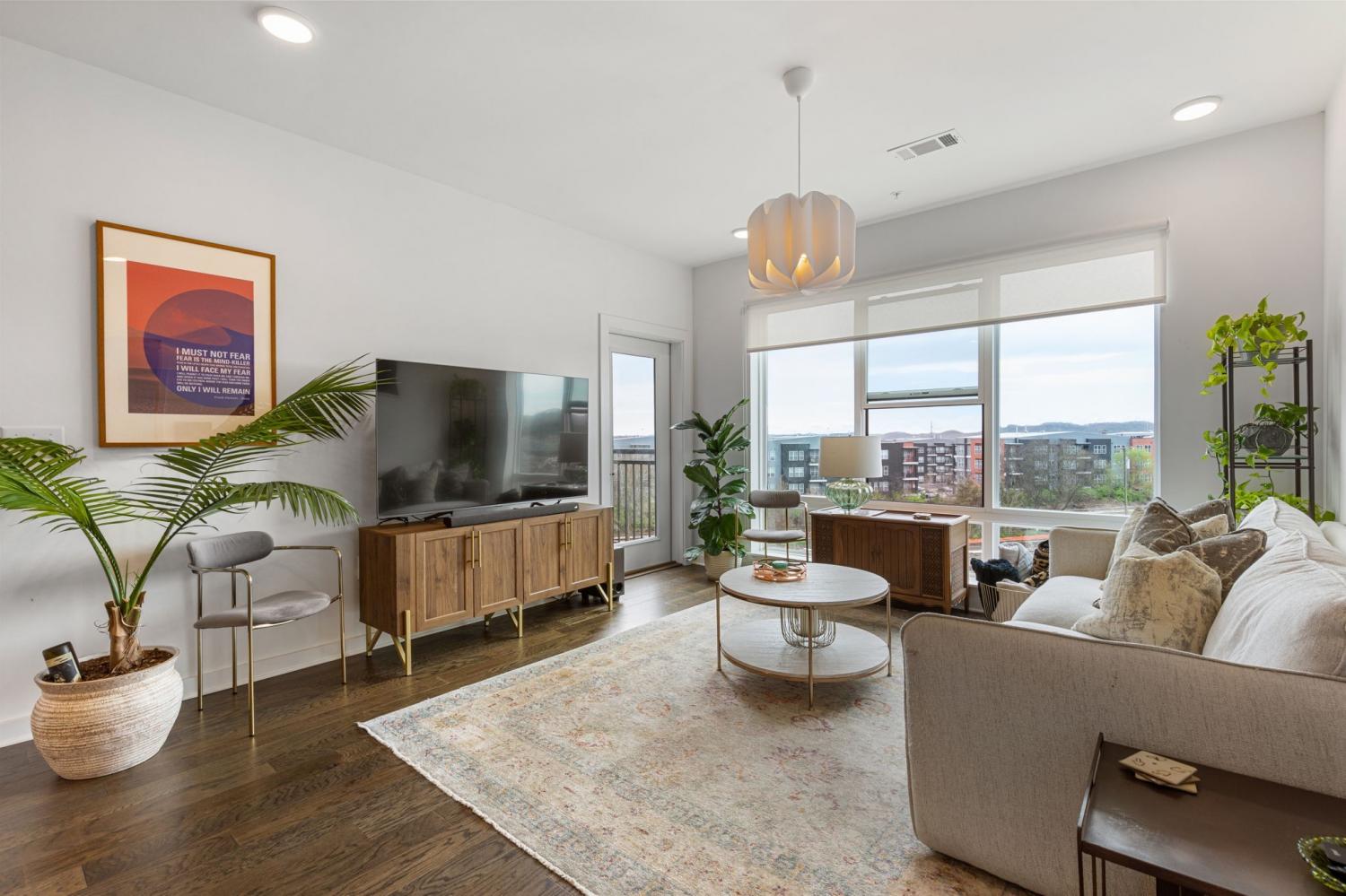 Rare top-floor residence in Silo West, offering 2 bedrooms, 2 full baths, and 1,136 sq ft of modern, light-filled living space. This like-new condo blends style and function with soaring ceilings, hardwood floors, and an open-concept layout that connects the living room to a spacious kitchen. The gourmet kitchen boasts stainless steel appliances (including a built-in oven and range), and the in-unit washer/dryer also convey, making it move-in ready. Both bedrooms are spacious, each with its own bath, including a primary suite with a walk-in shower and double vanities. Large windows and the top-floor location provide extra privacy, abundant natural light, and no neighbors above. Located in the heart of The Nations—a fast-growing neighborhood—Silo West offers unmatched convenience. Walk to coffee shops, breweries, and on-site Silo Market, or enjoy amenities including a pool, fitness center, community lounge, and secure package hub. Two assigned parking spaces are included, and nearby developments like Modera Nations and Camden Nashville are adding new dining, retail, and park spaces—bringing even more energy and long-term value to this vibrant community. Perfectly maintained, this condo delivers upscale finishes, a prime location, and turn-key convenience—offering immediate comfort and future growth potential in one of Nashville’s most dynamic neighborhoods. Ideal for first-time buyers and investors alike, this home embodies elevated urban living. Schedule your showing today.