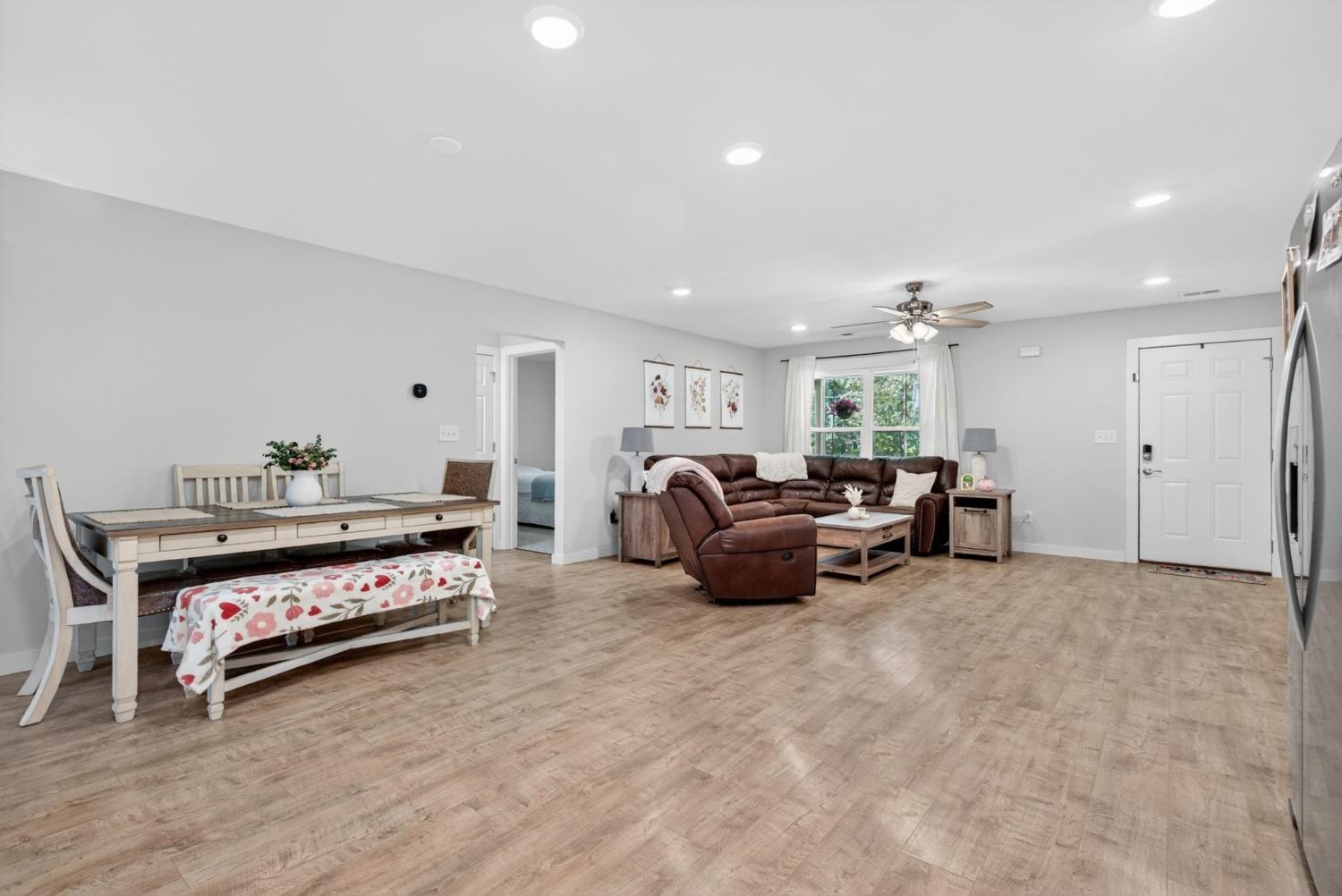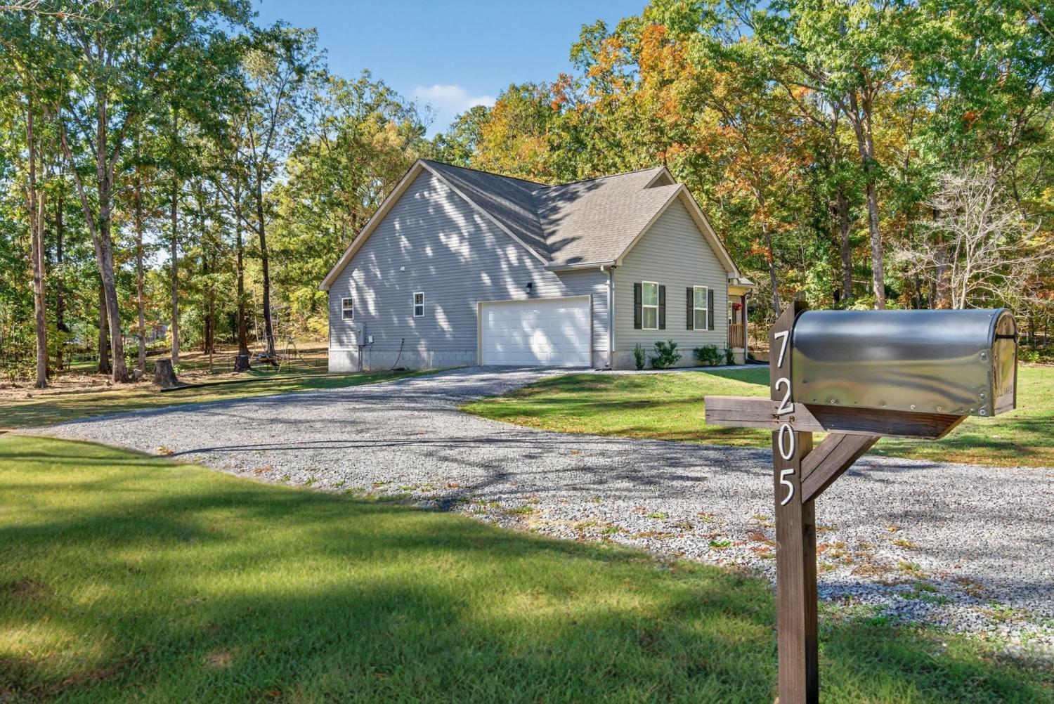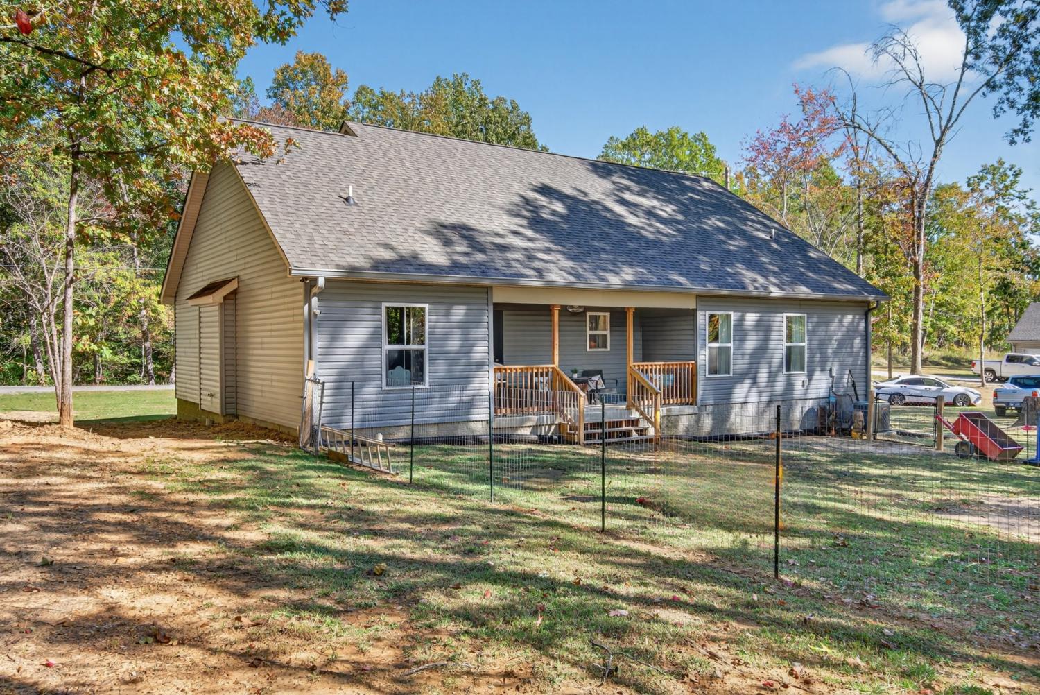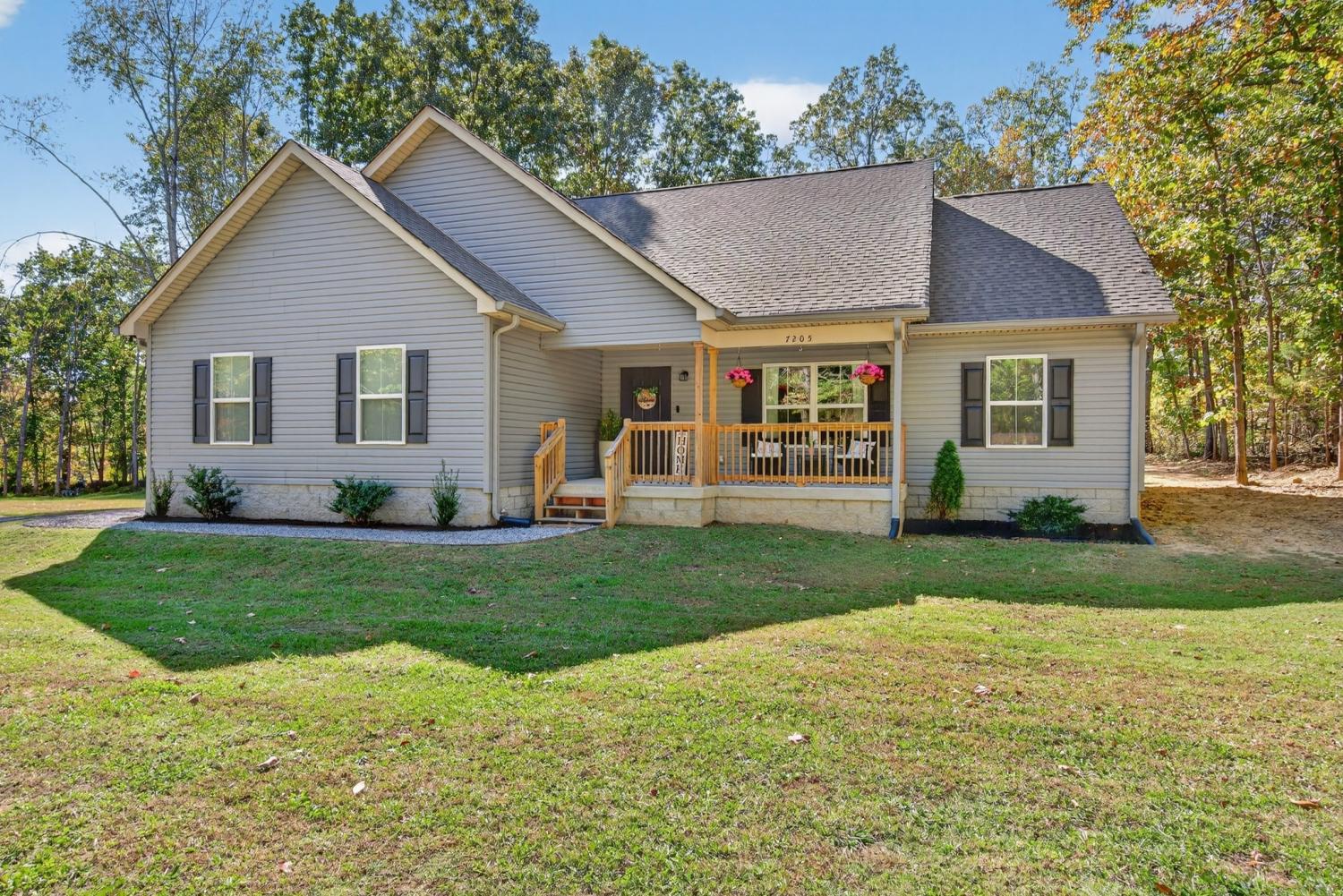 Like-new construction home just an hour from downtown Nashville. This beautiful home sits on over an acre of level, wooded land and features an open-concept floor plan with custom white cabinetry, granite countertops, and waterproof laminate flooring in the main living areas and primary suite. Enjoy spacious walk-in closets, a large laundry room with extra storage, and a handy entry nook off the garage. The exterior offers low-maintenance vinyl siding, covered front and back porches, convenient two-car side-entry garage, and a partially-fenced backyard with plenty of additional room for a shop, garden, etc—perfect for outdoor living! No HOA. New gravel on driveway 6/25. Fiber Internet available as well. Conveniently located less than 30 minutes to Dickson, Fairview, and Centerville! *Seller Concessions Offered*