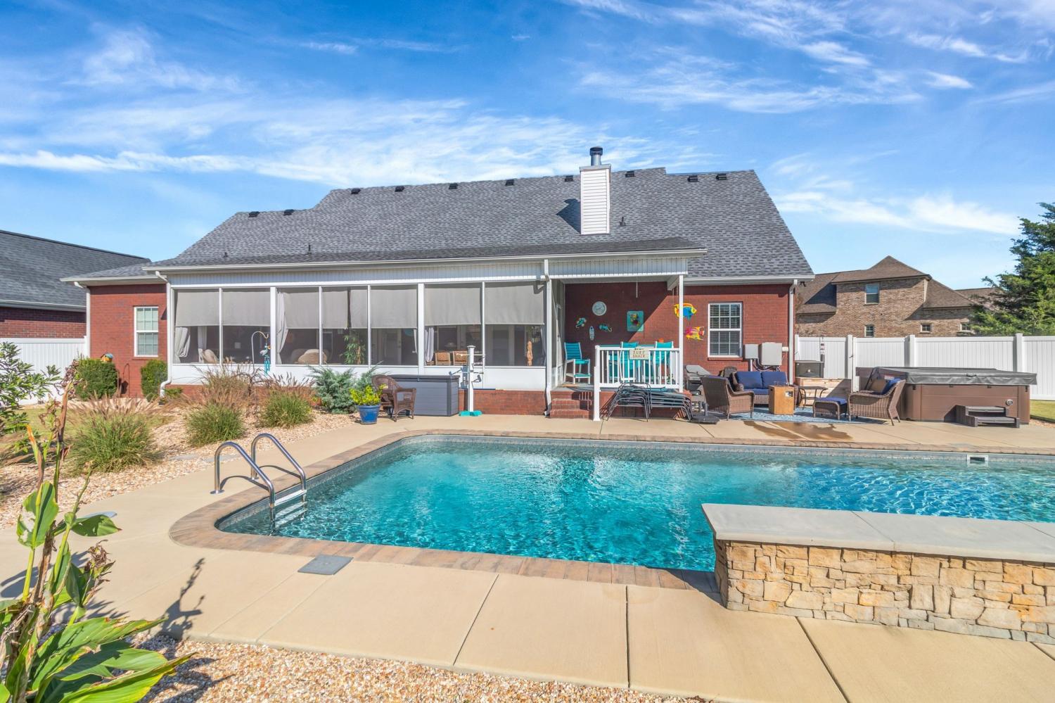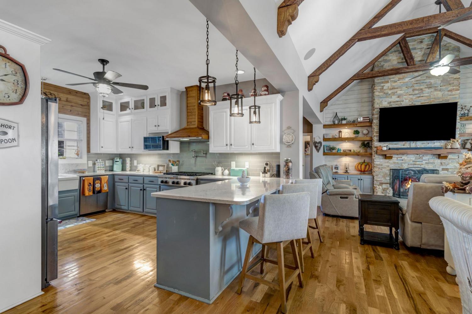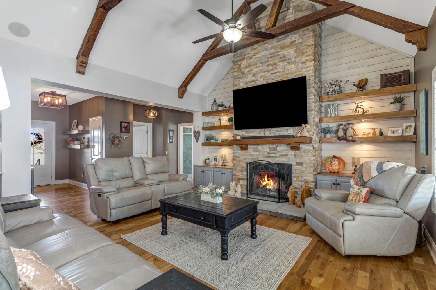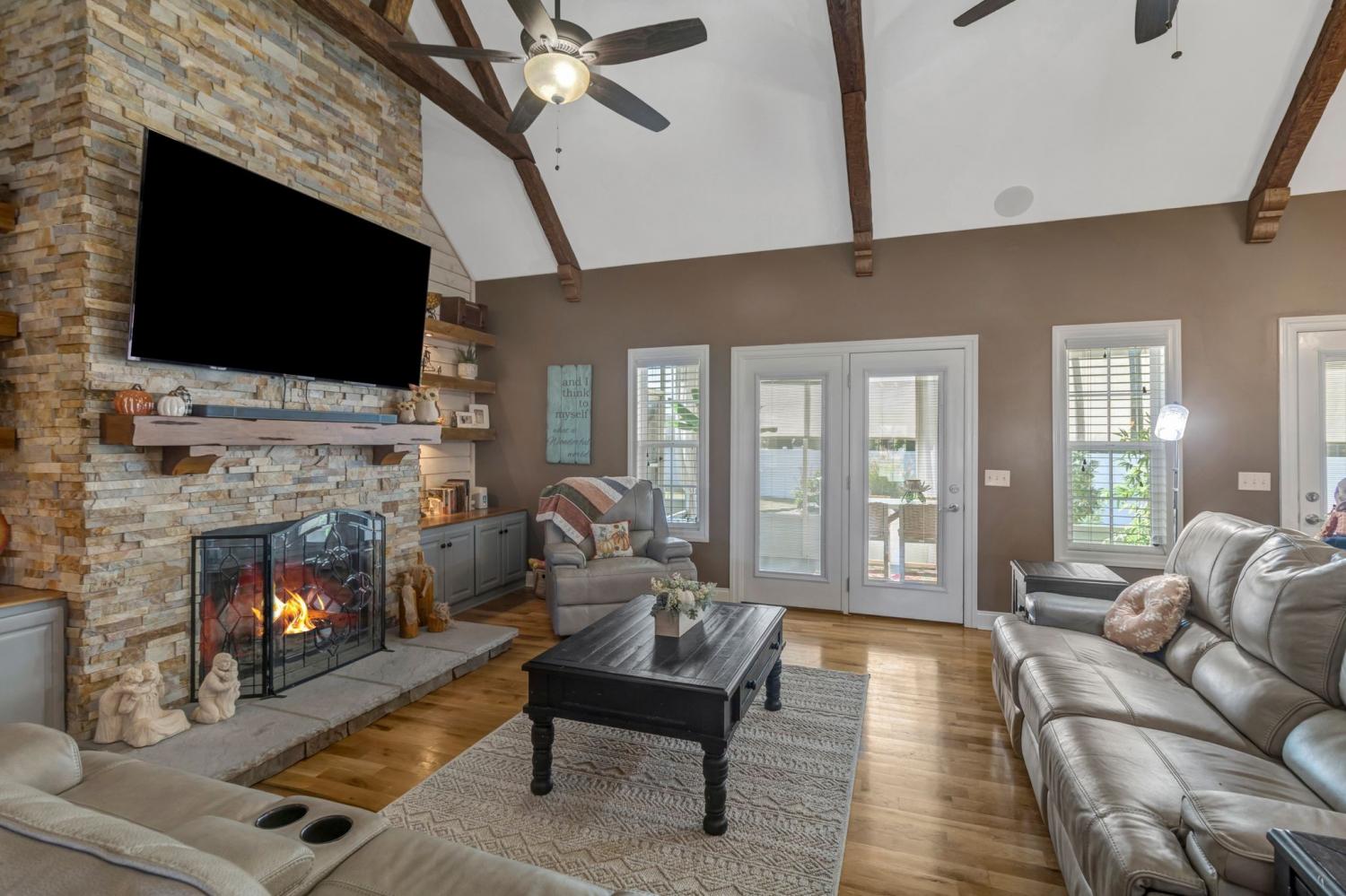 Stunning, Updated Home with 4 Bedrooms on the Main Level! Beautifully renovated with designer finishes throughout. The kitchen features quartz countertops, double ovens, gas cooktop, pot filler, and upgraded appliances. Open living area with exposed beams, shiplap accents, and built-ins flanking a stacked stone wood-burning fireplace. The primary bath has been updated with an upgraded vanity and stylish finishes. Bonus room upstairs converted to a private suite with full bath. Baths feature granite counters and tile finishes. Carpet installed three years ago. Enjoy the screened porch overlooking a large, fenced-in backyard with a 16x36 saltwater heated pool (installed 3 years ago) featuring coping all around, a three-tier waterfall with color-changing lights. Additional highlights include: 3-car attached garage + 1-car detached garage with 220V power & water Encapsulated crawl space Utility room with granite counter, sink & cabinets Move-in ready and full of updates—this home offers luxury, comfort, and outdoor living at its best!