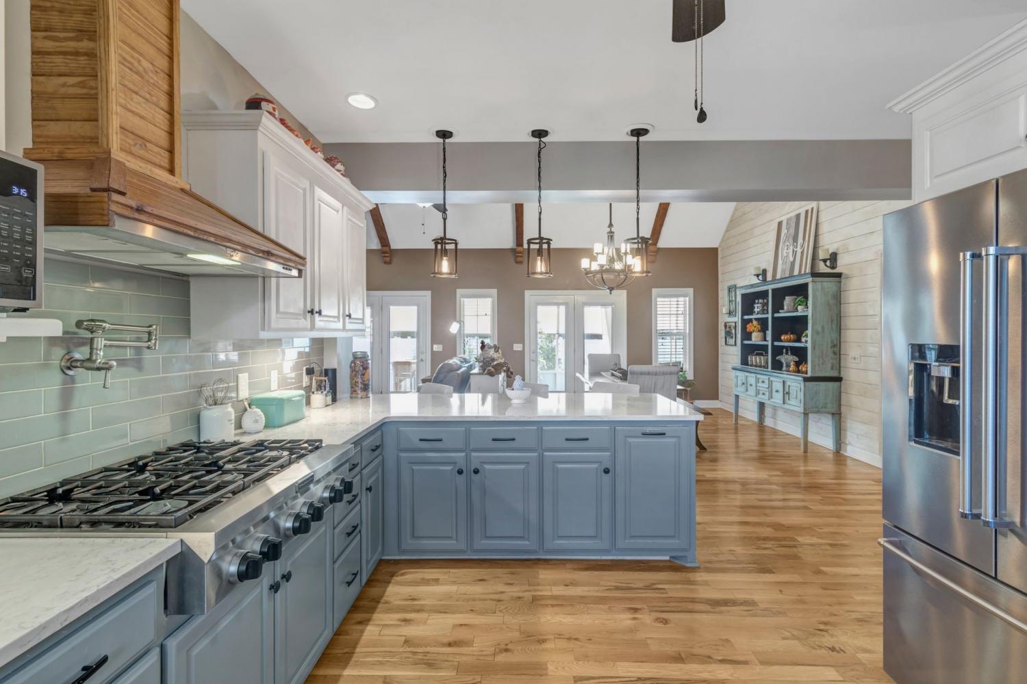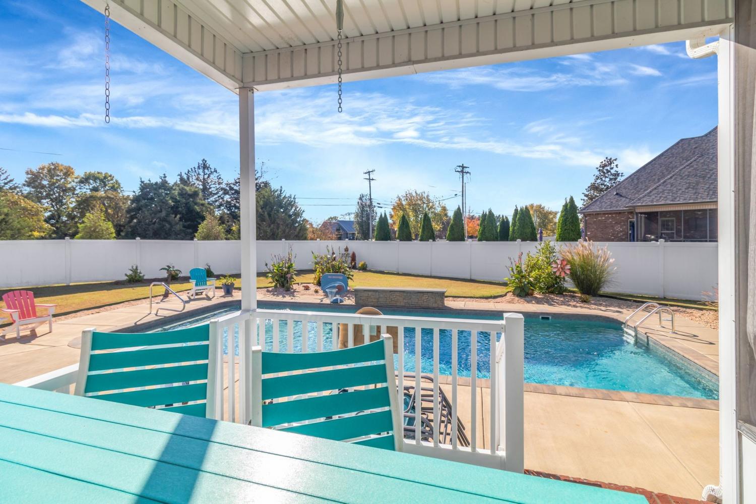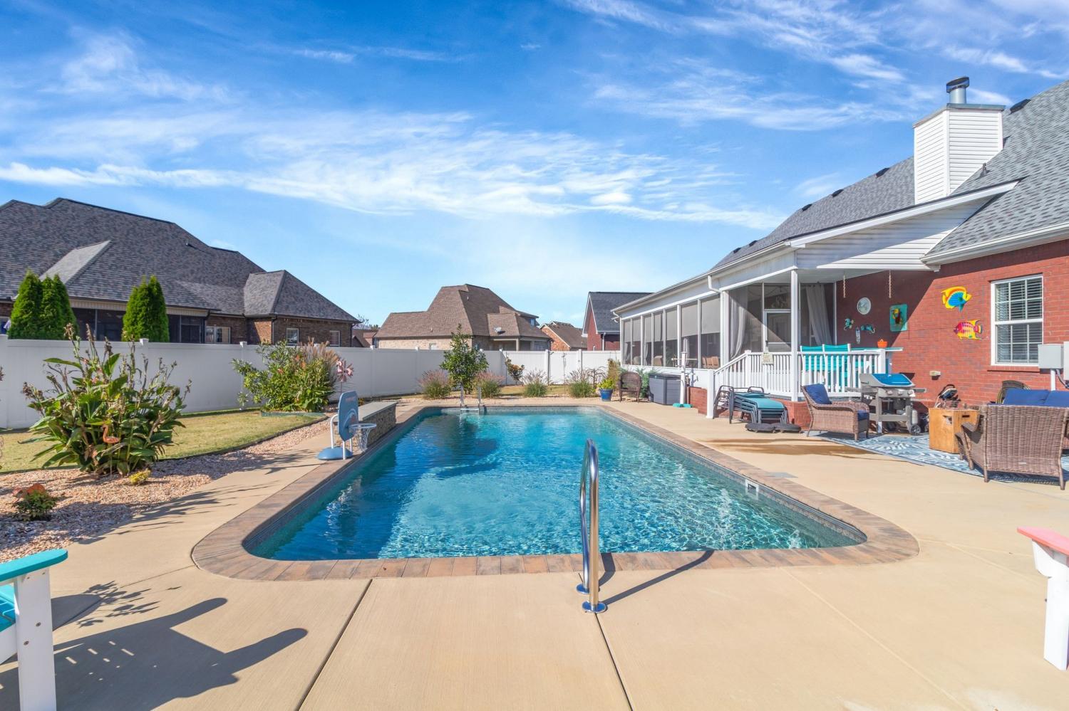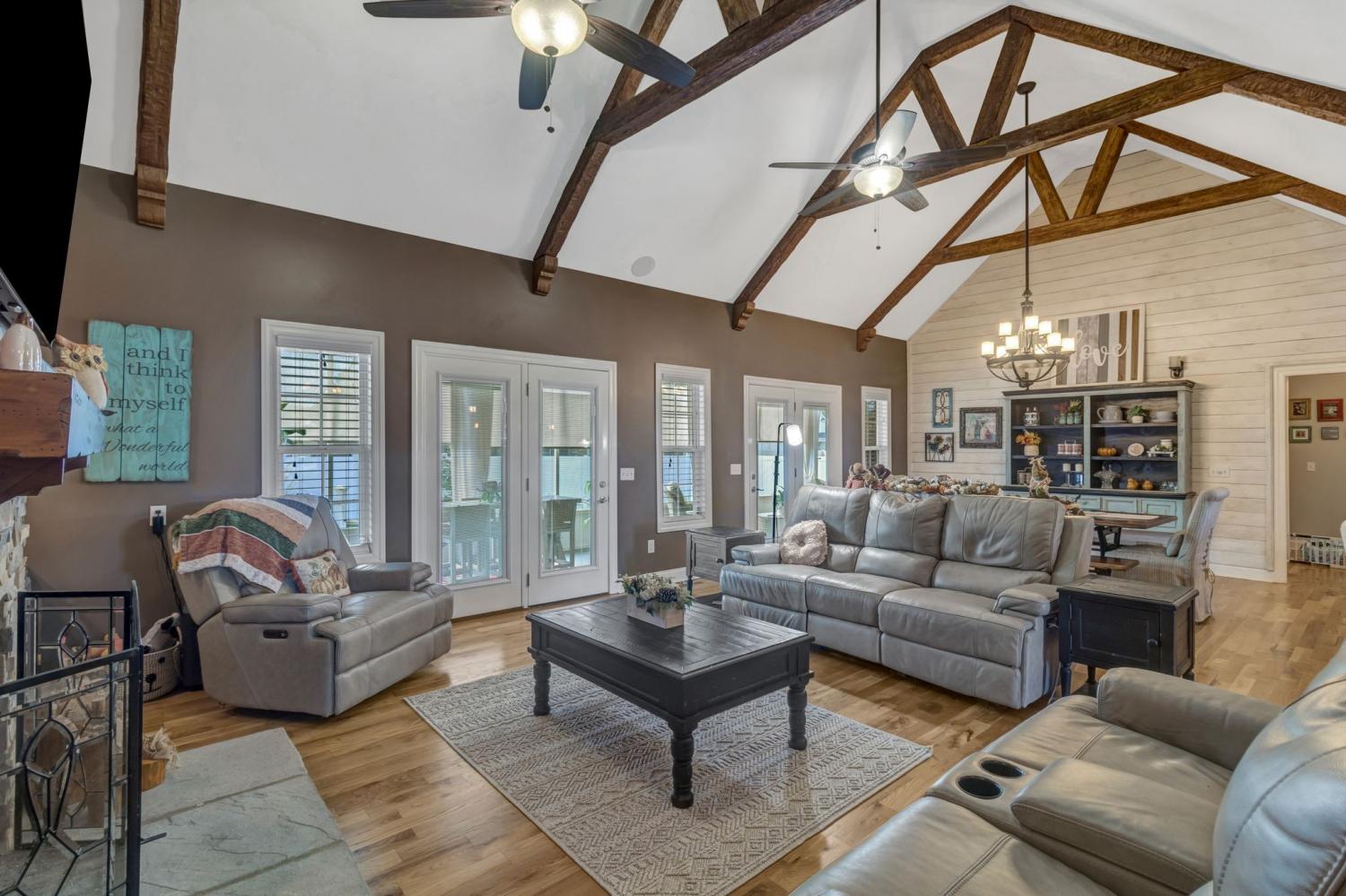 Stunning, Updated Home with 4 Bedrooms on the Main Level! Beautifully renovated with designer finishes throughout. The kitchen features quartz countertops, double ovens, gas cooktop, pot filler, and upgraded appliances. Open living area with exposed beams, shiplap accents, and built-ins flanking a stacked stone wood-burning fireplace. The primary bath has been updated with an upgraded vanity and stylish finishes. Bonus room upstairs converted to a private suite with full bath. Baths feature granite counters and tile finishes. Carpet installed three years ago. Enjoy the screened porch overlooking a large, fenced-in backyard with a 16x36 saltwater heated pool (installed 3 years ago) featuring coping all around, a three-tier waterfall with color-changing lights. Additional highlights include: 3-car attached garage + 1-car detached garage with 220V power & water Encapsulated crawl space Utility room with granite counter, sink & cabinets Move-in ready and full of updates—this home offers luxury, comfort, and outdoor living at its best!