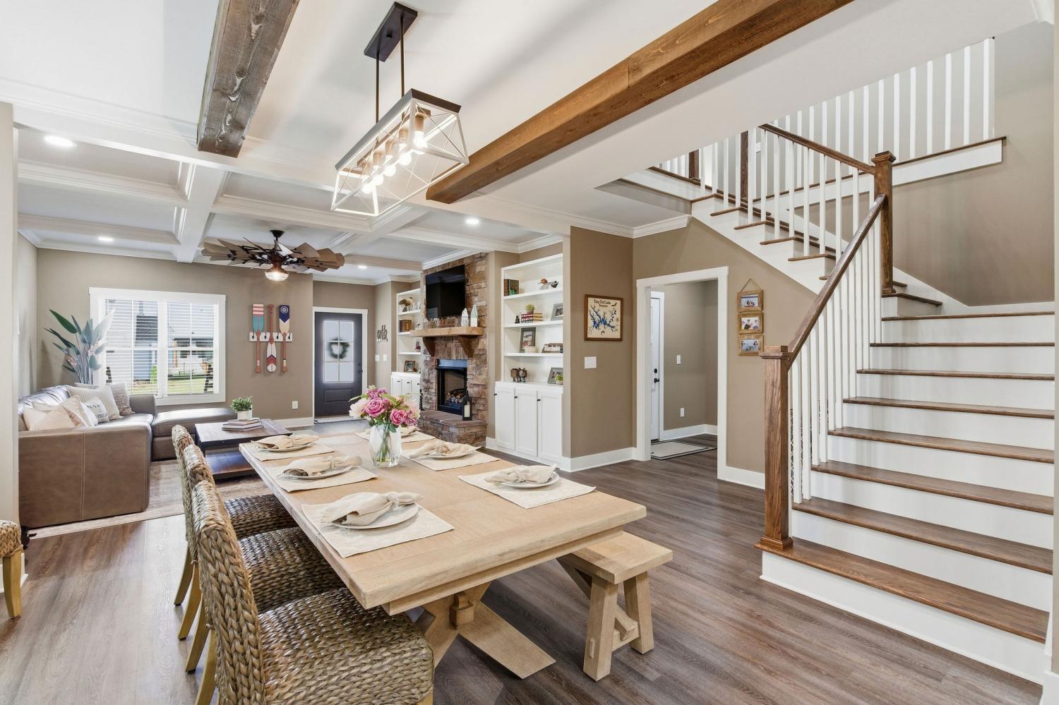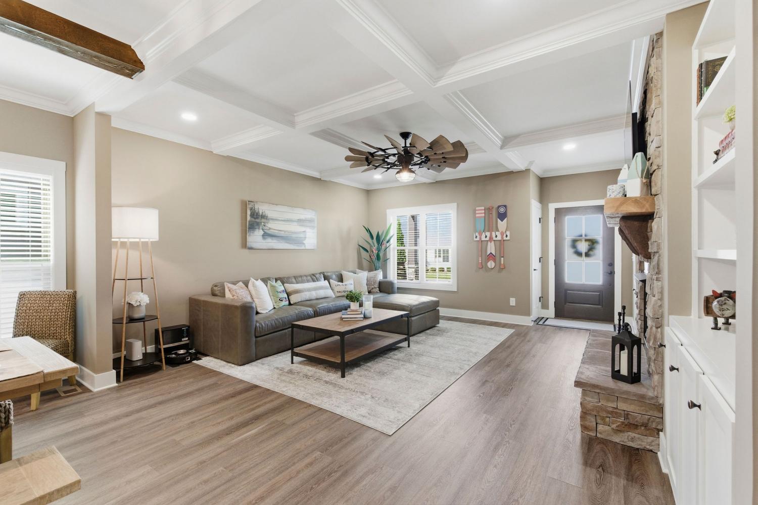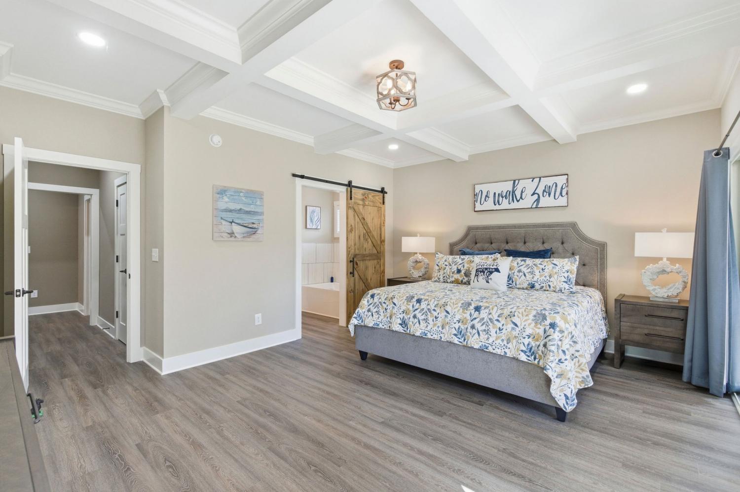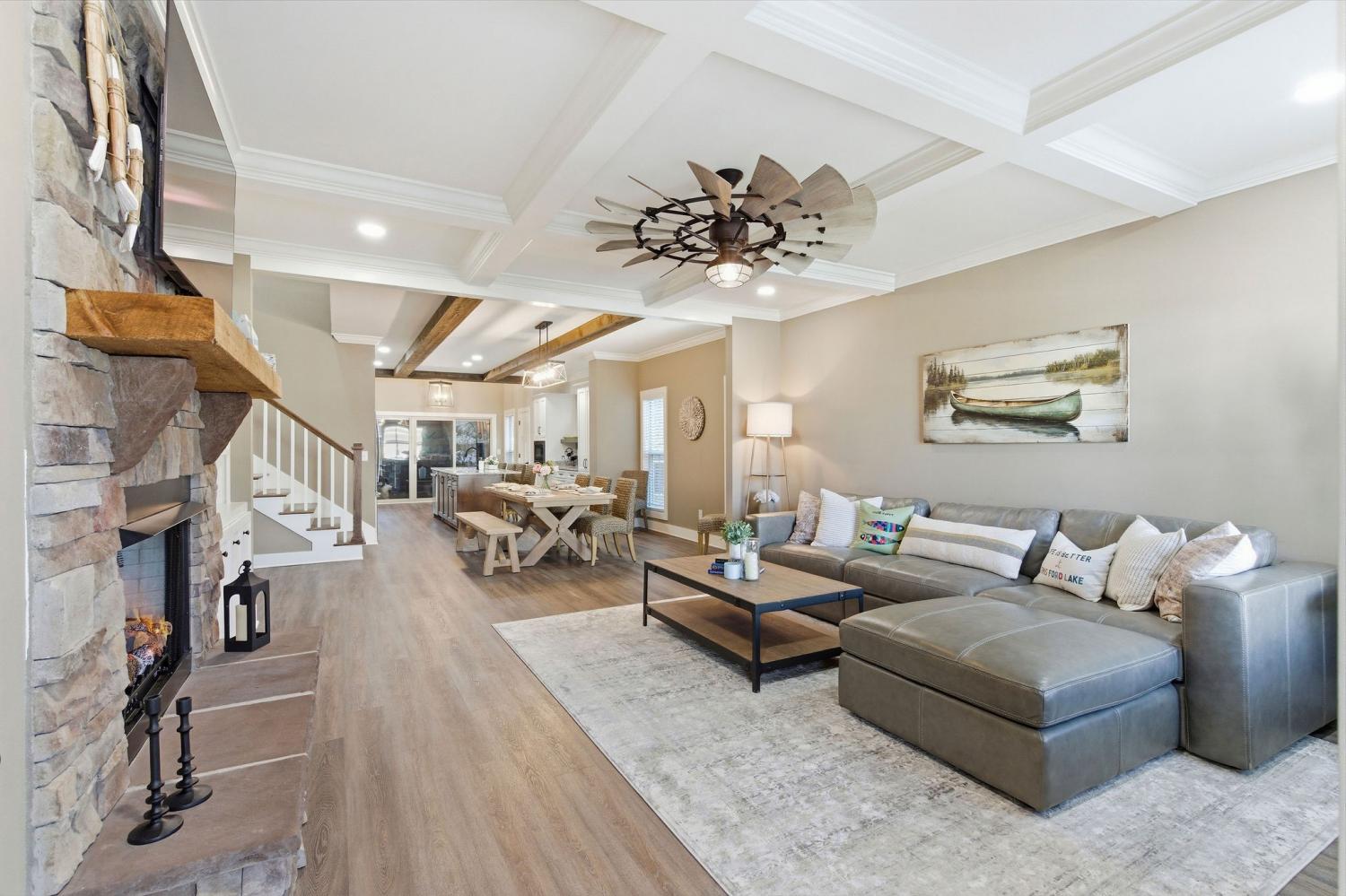 Lake life at its finest! This better than new, custom home in Twin Creeks is a MUST SEE and features upgrades galore! From the inviting stone-accented exterior and charming covered front porch to the open and thoughtfully designed interior, every detail of this home exudes quality and comfort. It is a rare opportunity to find a home with all the bells and whistles at this price! Inside, you’ll find four spacious bedrooms — including two primary suites with en suite baths — plus a bonus room with private bath that could easily serve as a fifth bedroom. The main-level primary suite with coffered ceiling features a personal patio area, while the upstairs primary suite offers a private balcony with peaceful views; both providing your own special retreat. Luxury vinyl plank floors flow seamlessly throughout this home; no carpeting. The kitchen and dining area feature detailed wooden beams, quartz countertops, a gas cooktop, and stainless steel appliances, creating a perfect mix of elegance and functionality. The open floor plan features a spacious living room with a coffered ceiling, a gas fireplace and built-ins.The kitchen and dining areas feature detailed wooden beams, adding warmth and an elegant focal point for family gatherings and entertaining. Don’t miss the chance to experience this impeccably maintained, move-in-ready home that blends luxury, functionality, and a true sense of community. But the true magic is in the lifestyle. Enjoy days on the water boating or kayaking, evenings at the community restaurant and bar, and weekends spent at the pools, clubhouse, and social events with neighbors who soon feel like family. Whether you’re looking for a primary home or a lake getaway, this home offers the best of both worlds — comfort, community, and a life that feels like vacation every day.