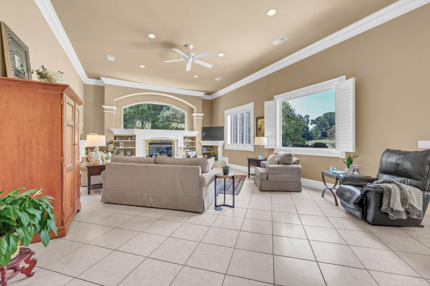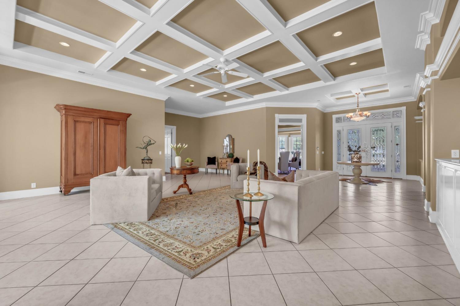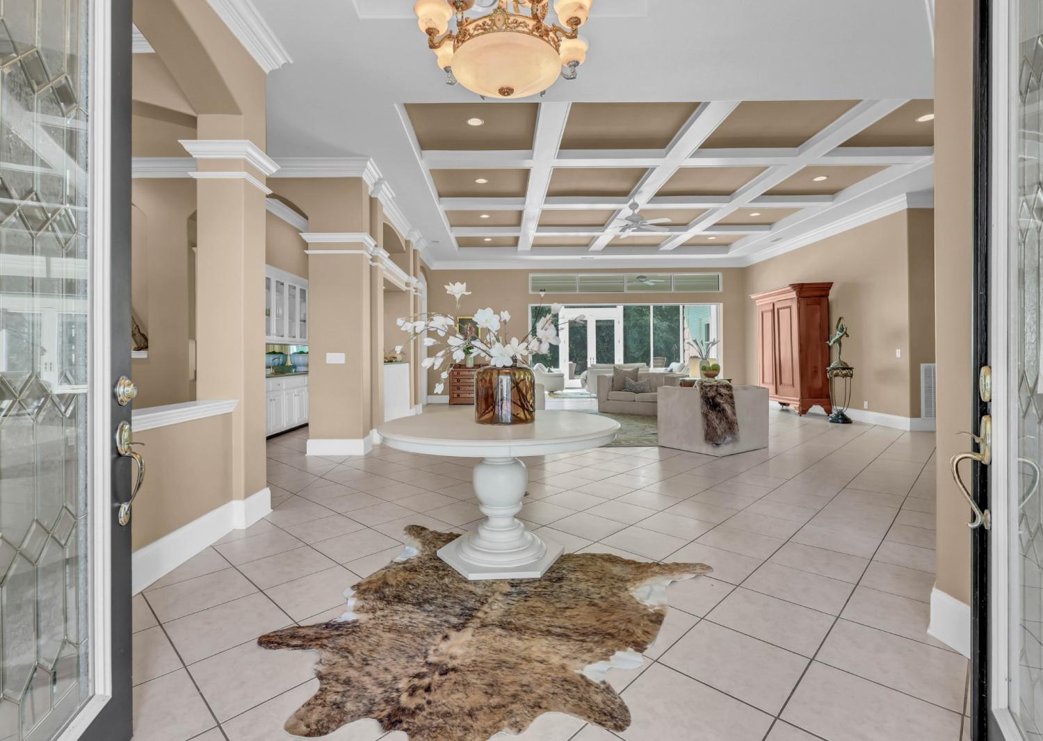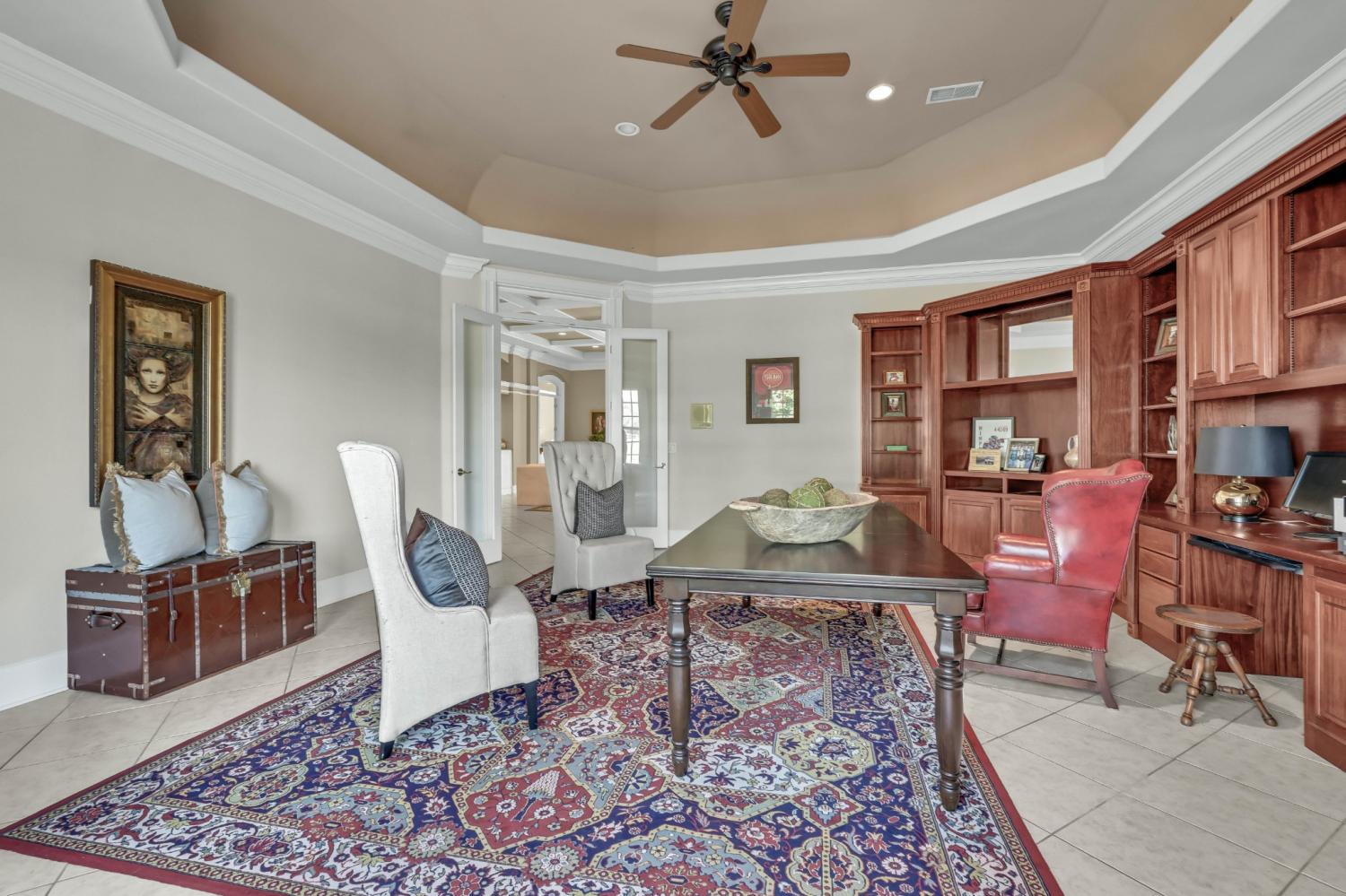 Stunning and stately, this impressive 8,300 sq. ft. residence sits gracefully on 1.88 acres, reached by a picturesque tree-lined driveway and highlighted by a grand porte-cochère. Every detail of this home exudes sophistication and comfort. Inside, the welcoming foyer opens to formal and casual living spaces, including a formal dining room and a beautifully designed eat-in kitchen featuring double islands, an abundance of custom cabinetry, a butler’s pantry, and stainless steel appliances—perfect for entertaining. The oversized primary suite is a true retreat, offering an expansive en-suite bathroom, a massive walk-in closet with built-ins, and an attached fitness room for ultimate convenience. The thoughtful floor plan includes a dedicated office for remote work, a charming Florida room filled with natural light, and a tornado shelter for added peace of mind. Elegant details are found throughout—from coffered ceilings and intricate trim work to the seamless flow between rooms. Outdoor living is equally impressive with an open patio overlooking the manicured grounds, complete with an irrigation system to maintain the lush landscape. Additional highlights include 3 spacious bedrooms, two and a half bathrooms, a three-car garage, and refined finishes that elevate this home’s timeless appeal. Combining luxury, comfort, and functionality, this remarkable estate delivers an unmatched lifestyle in an exquisite setting.