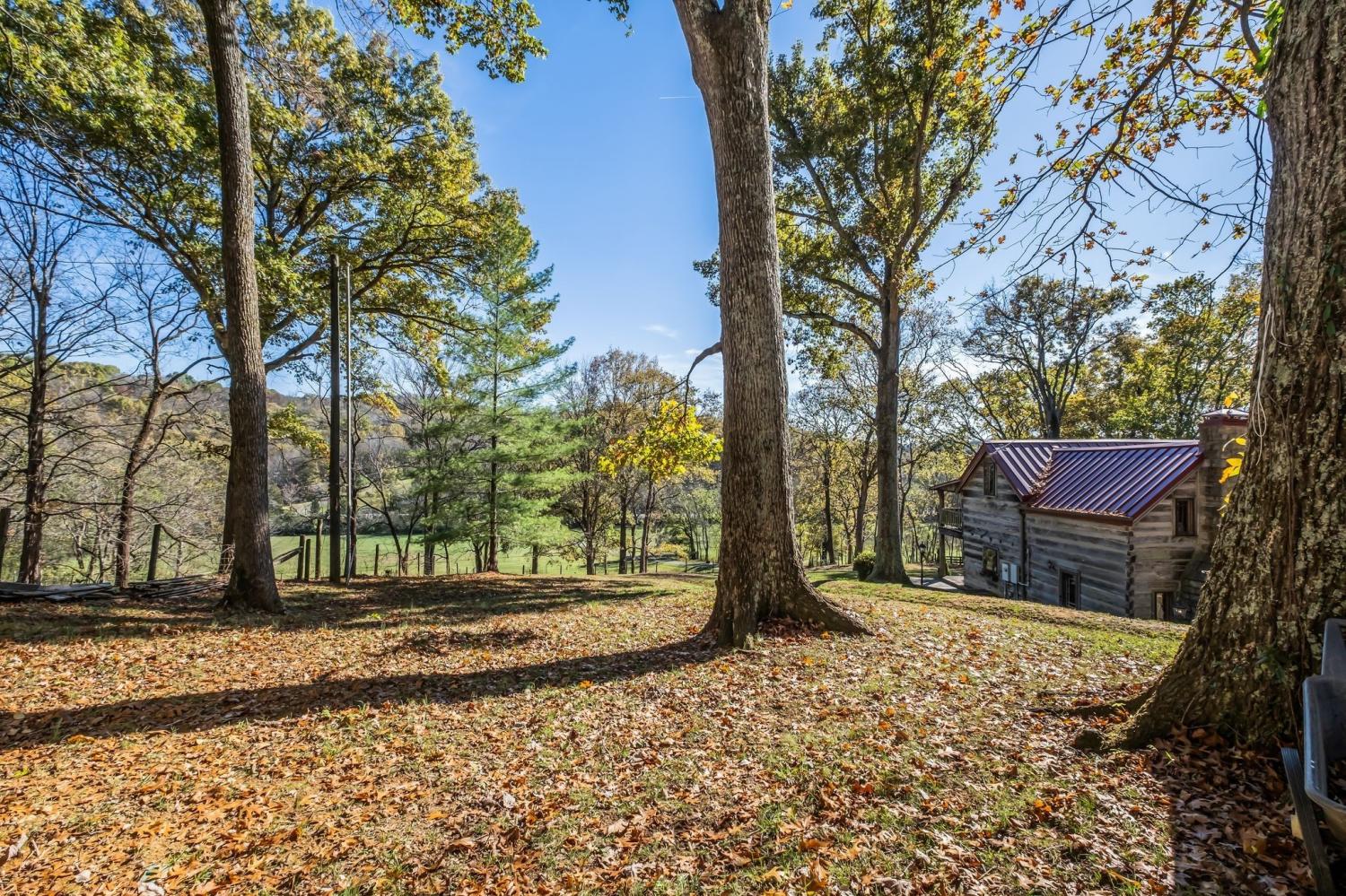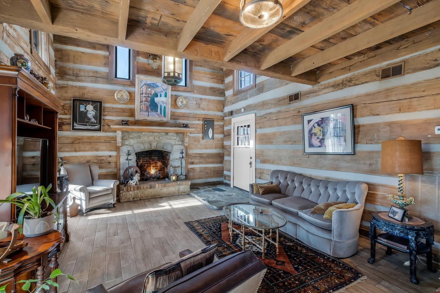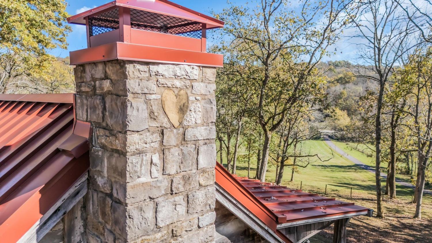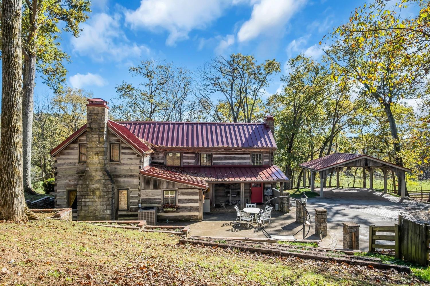 A creative masterpiece, this log home was designed and built in 1997 by famed local builder, Braxton Dixon. It is constructed of 19th century poplar logs from two different structues. The house has many architectural antique features, such as vintage leaded and stained glass windows, vintage doors, reclaimed wood and reclaimed brick floors. Dixon was a master stone mason, and the two wood burning fireplaces bear his signagure stone heart on the exterior chimneys. A gas line and gas log set was added to the living room fireplace for convenience. Two full-length covered porches overlook the 5.02 acre lot. A new 2-car carport, constructed from reclaimed wood, was added by the current owner, along with updated landscaping features and drainage improvements on the hill behind the home. The driveway from Long Hollow Pike has been repaved. A new standing seam insulated metal roof and new gutters and chimney caps were recentely installed. New HVAC was installed in 2021 by the previous owner. The primary bath features antique claw foot tub and handmade tiles from Mexico. Note that upstairs the third bedroom is entered through the second bedroom. Located just outside the Goodlettsville city limits, the home is in Sumner County and is five minutes from I-65 North, 20-25 minutes to Nashville. Garden & Gun magazine wrote a great piece about Braxton Dixon in 2013 (https://gardenandgun.com/feature/built-to-last-braxton-dixon/).