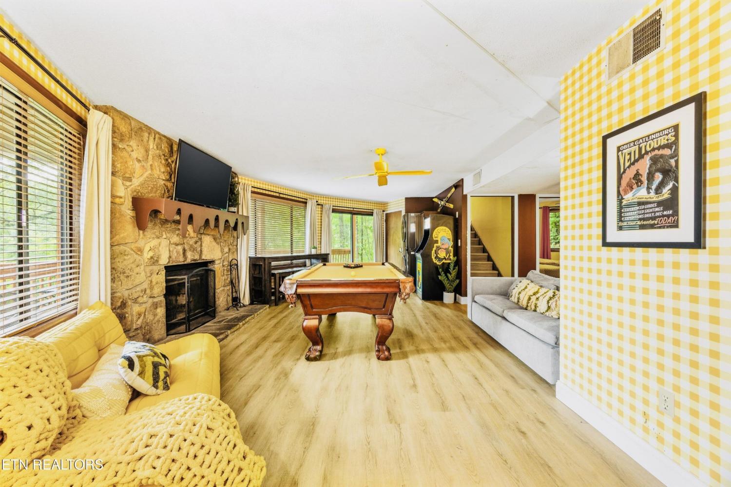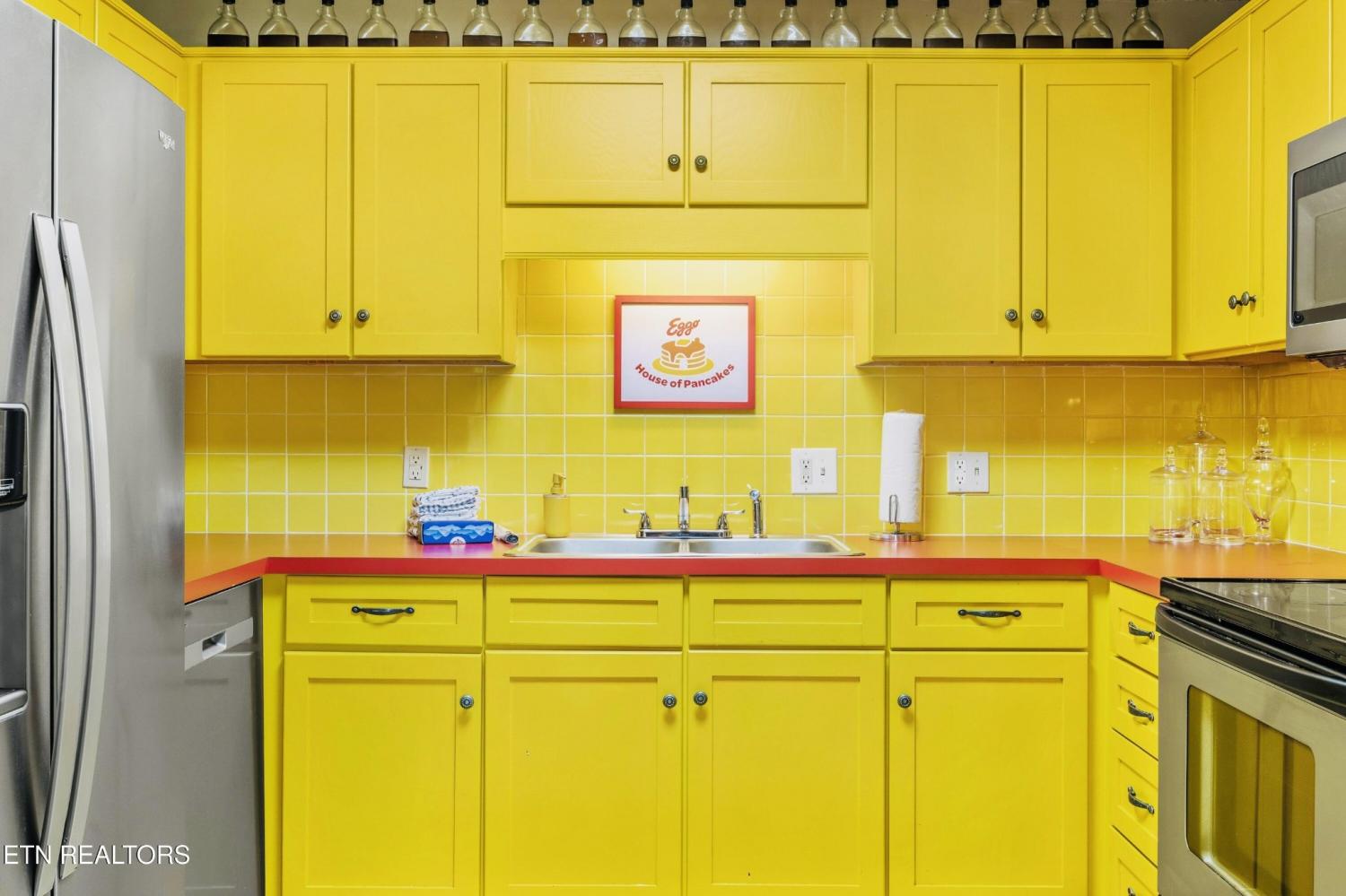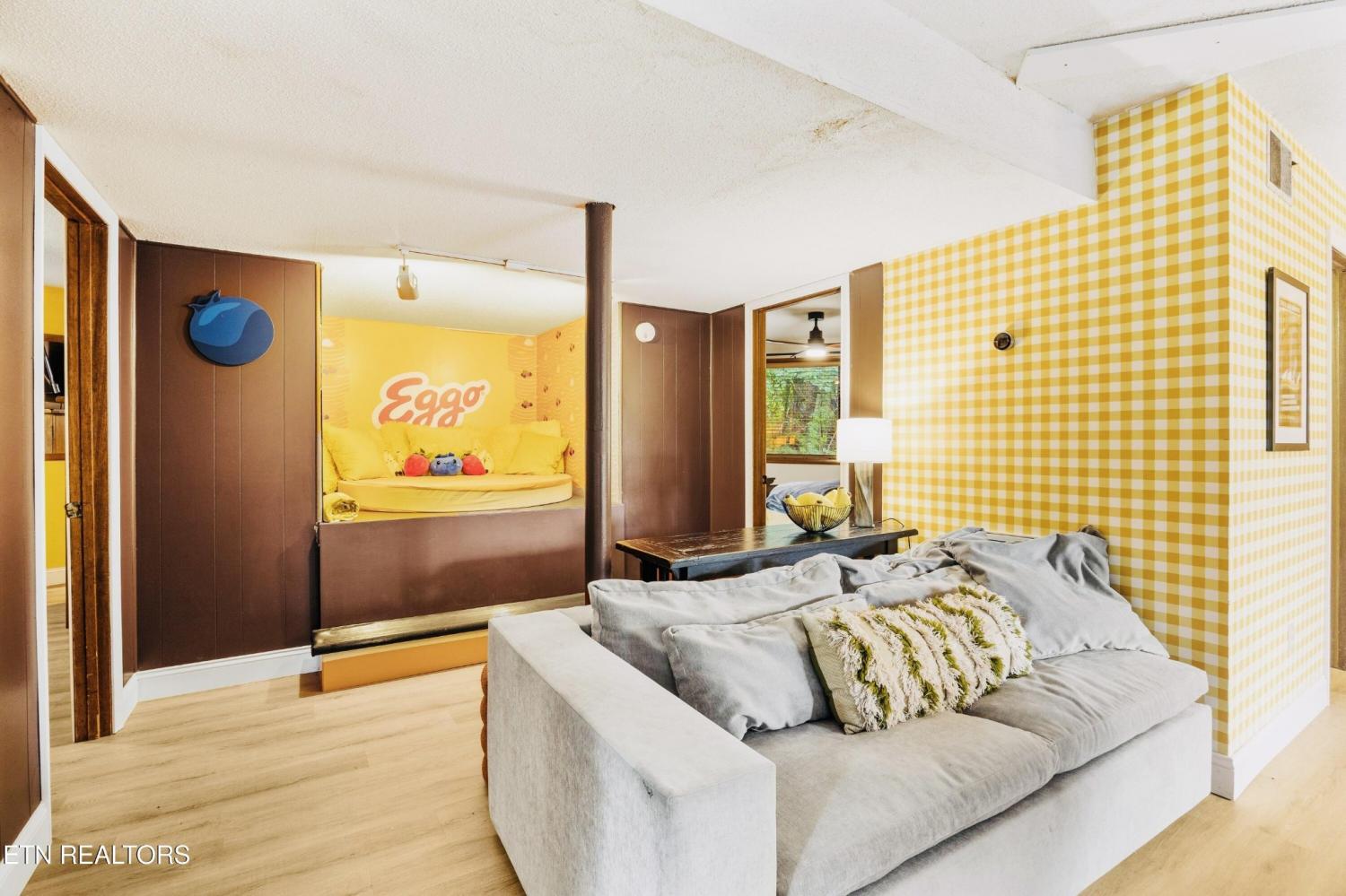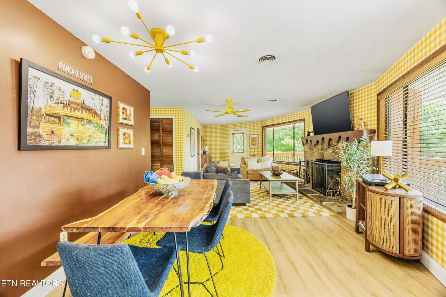 Welcome to the Pancake Eggo Cabin: a truly one-of-a-kind, pancake-themed retreat nestled in the heart of Gatlinburg. This unforgettable cabin looks like a towering stack of Eggo pancakes and offers a whimsical escape with mountain views and an unbeatable location. Whether you're looking for a fun-filled getaway or a top-performing short-term rental, this property delivers charm, character, and income. Inside, you'll find four cozy bedrooms, each uniquely decorated with pancake-inspired touches and their own private bathrooms, allowing comfortable accommodations for all your guests. The living area is bright and inviting, complete with a fireplace, Eggo-themed décor, and plenty of room to relax. The fully equipped kitchen features vibrant retro accents and maybe a variety of Eggos which makes every morning a delicious experience. The fun continues downstairs in the game room, where guests can enjoy a custom Eggo-yellow pool table, board games, and additional lounge space. Step outside to the spacious wraparound deck, soak in the hot tub under the stars, or gather around the firepit to enjoy the peaceful mountain surroundings. Located in Chalet Village, the cabin is just minutes from Ober Gatlinburg, downtown shops and attractions, and the entrance to the Great Smoky Mountains National Park. The Pancake Eggo Cabin is more than a place to stay—it's a destination in itself, blending nostalgia, creativity, and comfort for a truly memorable Smoky Mountain experience.