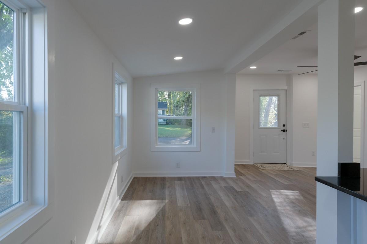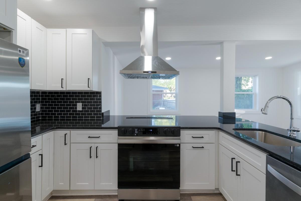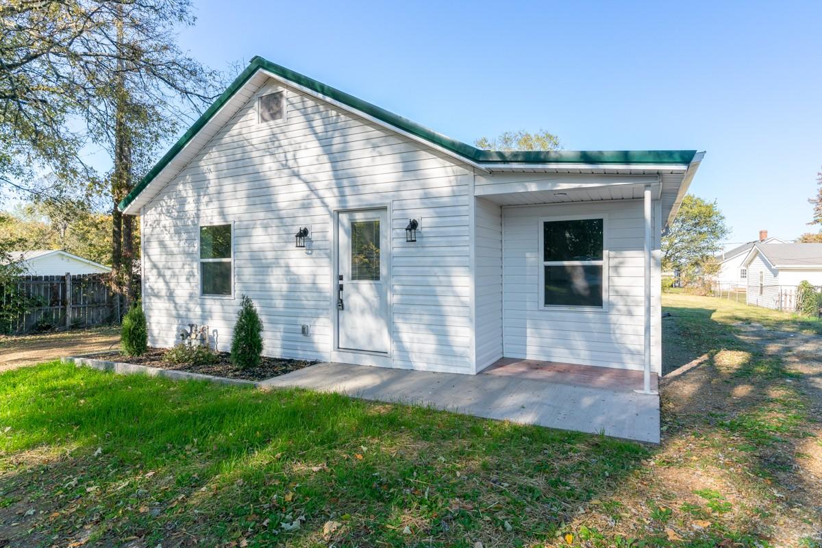 Welcome to this beautifully renovated 3-bedroom, 2-bathroom home combining classic charm with modern comfort. Built in 1945 and recently renovated from top to bottom, this single-level 917 sq. ft. home has been thoughtfully designed to maximize every inch of space for comfortable, efficient living. The open-concept layout creates a bright, airy feel, complemented by neutral luxury vinyl plank flooring that flows seamlessly throughout. The modern eat-in kitchen features striking black granite countertops, crisp white cabinets with black hardware, a sleek black backsplash, and stainless steel appliances, including a vented hood over the range. A counter overhang provides additional dining space, perfect for casual meals or entertaining. Both bathrooms have been completely renovated with stylish fixtures and finishes, while each bedroom offers comfort and flexibility. The home’s many upgrades include a new HVAC unit, tankless water heater, updated plumbing and electrical systems, new baseboards, sheetrock, lighting, and molding, as well as a new vapor barrier and updated floorboards in the foundation. The three-year-old metal roof, fresh paint, and modern finishes inside and out make this home truly move-in ready. Set on a level lot with double driveways, a partial fence, city water, and public sewer, the property also includes a detached two-car garage for parking or storage. Though compact in size, this home lives large with its open layout and smart design. Every detail has been thoughtfully selected to create a space that is stylish, functional, and low-maintenance. Perfect for first-time buyers, downsizers, or anyone seeking modern living in a manageable footprint, this home is ready to welcome you with comfort, efficiency, and timeless appeal.