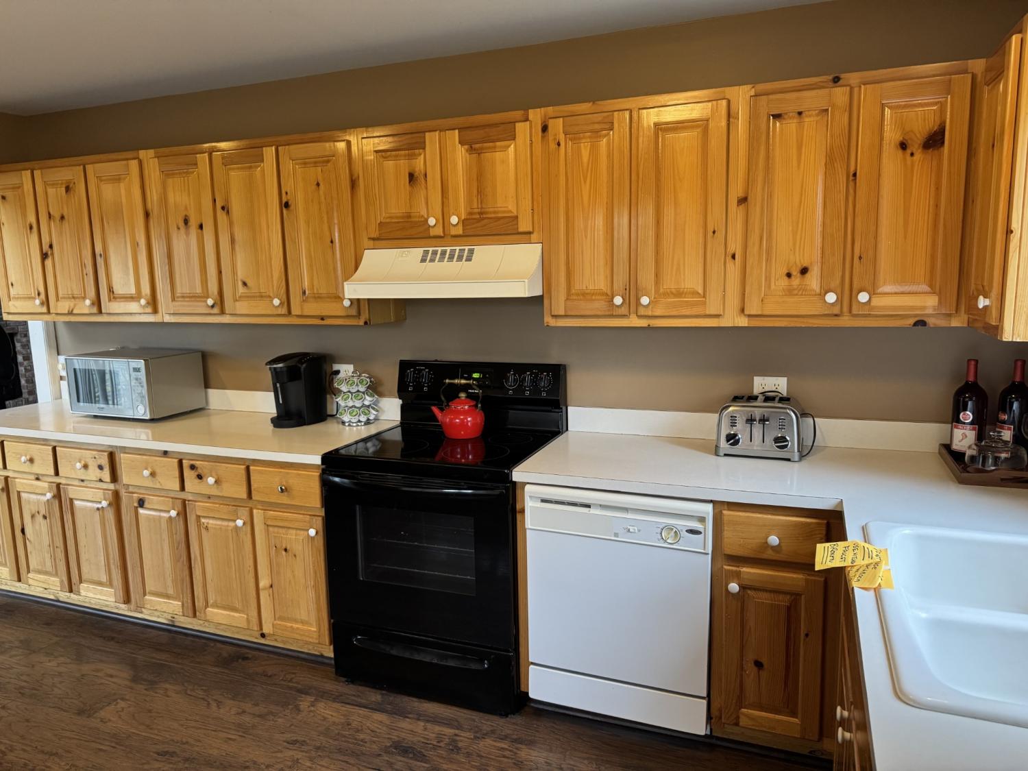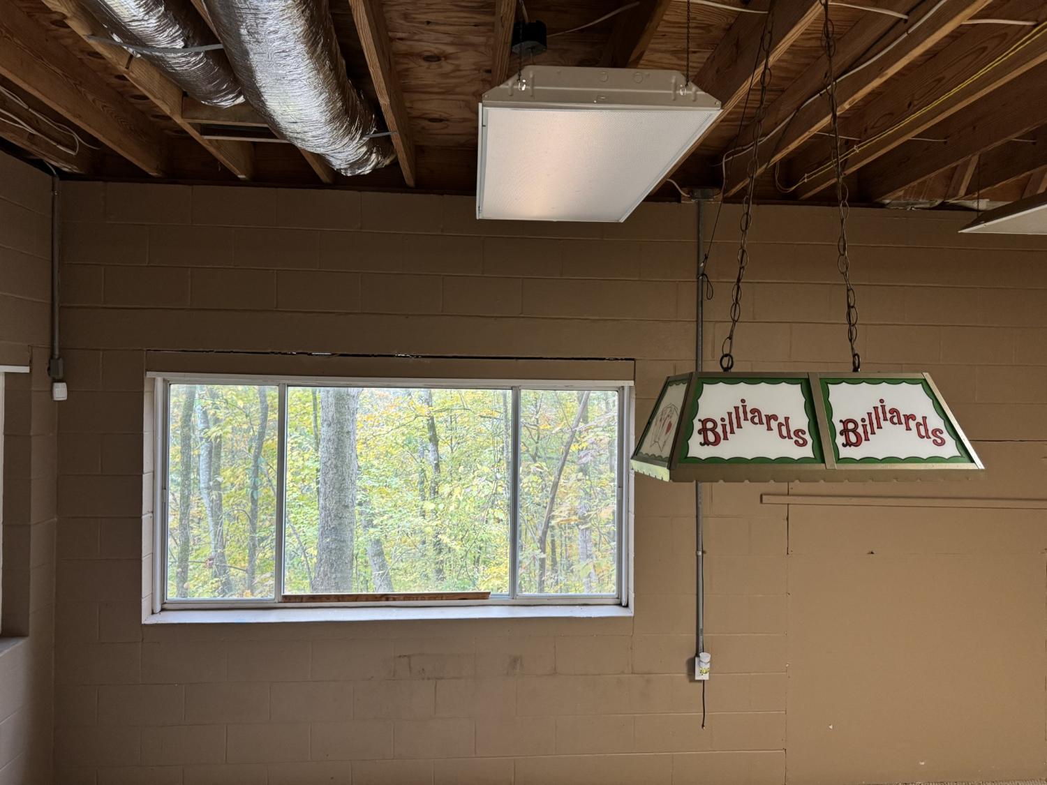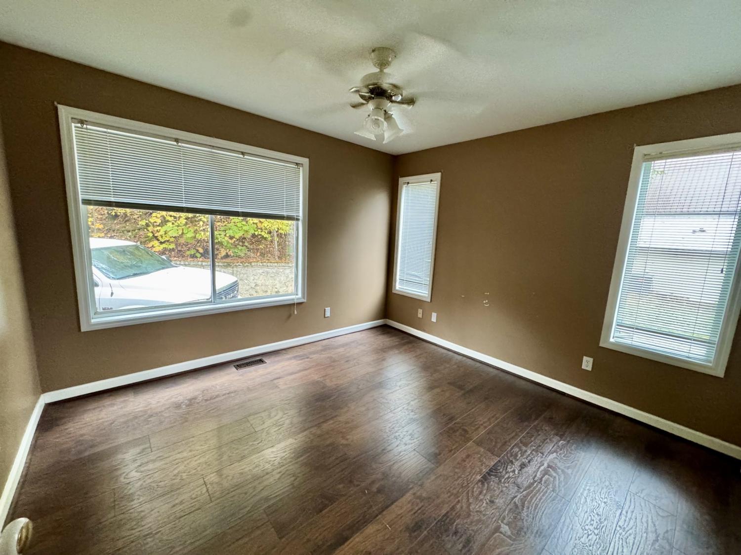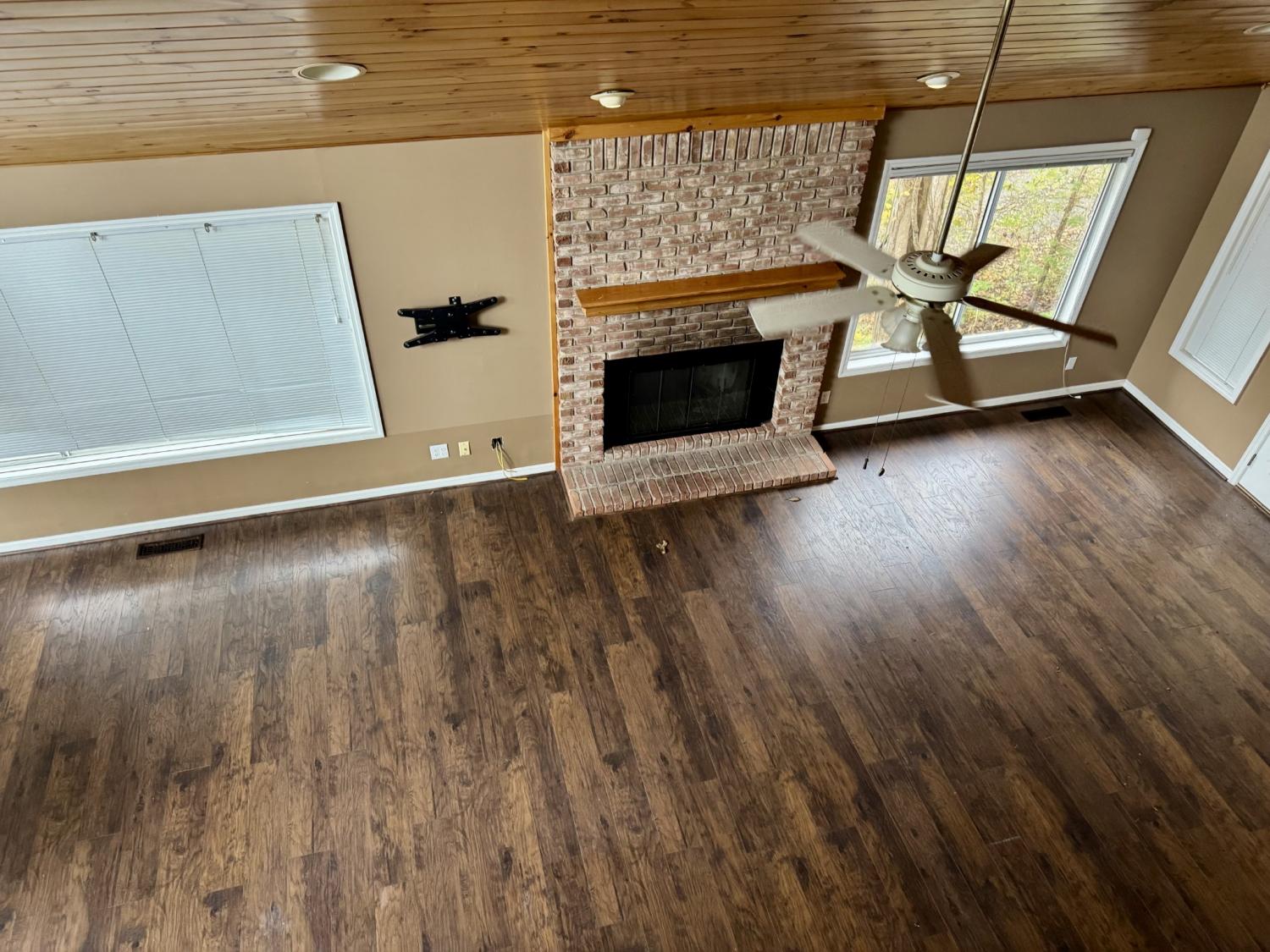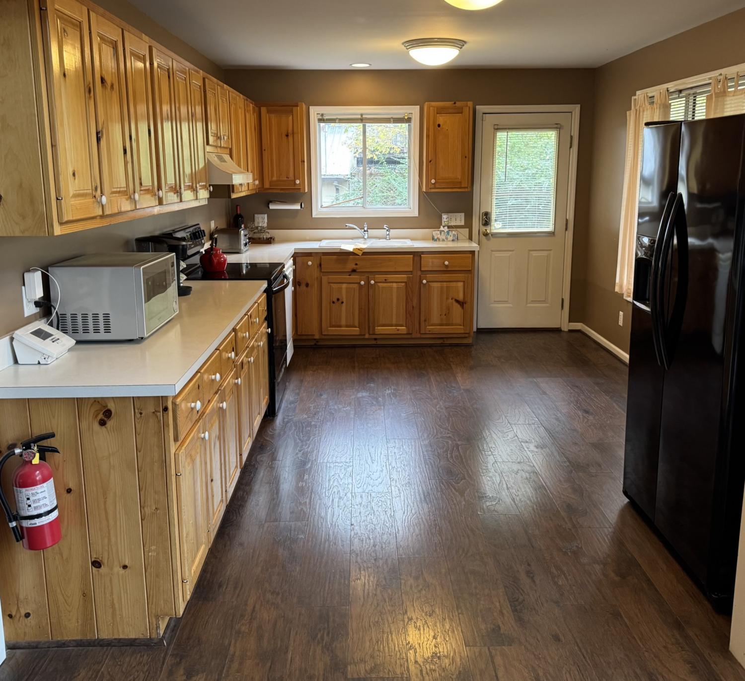 Overlooking Eagle Creek, this cabin has an open floorplan with beautiful views. The kitchen opens into a large living room with a wood burning fireplace. This property is an estate, and is being sold in as-is condition.