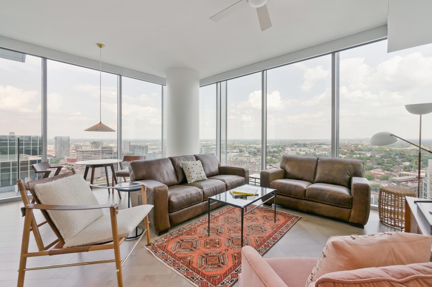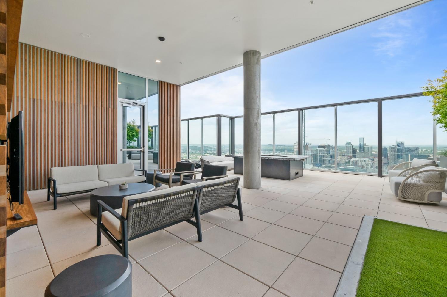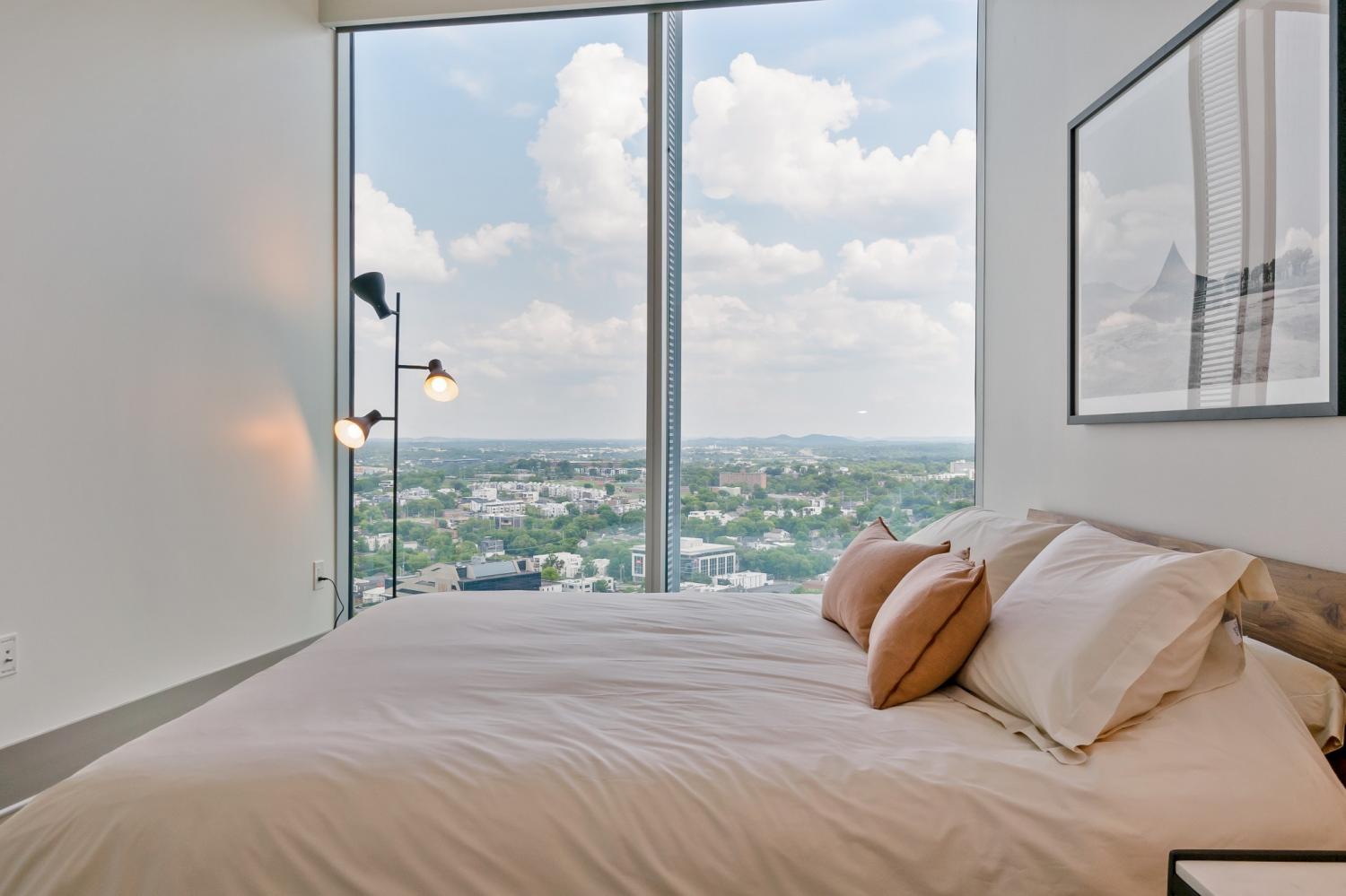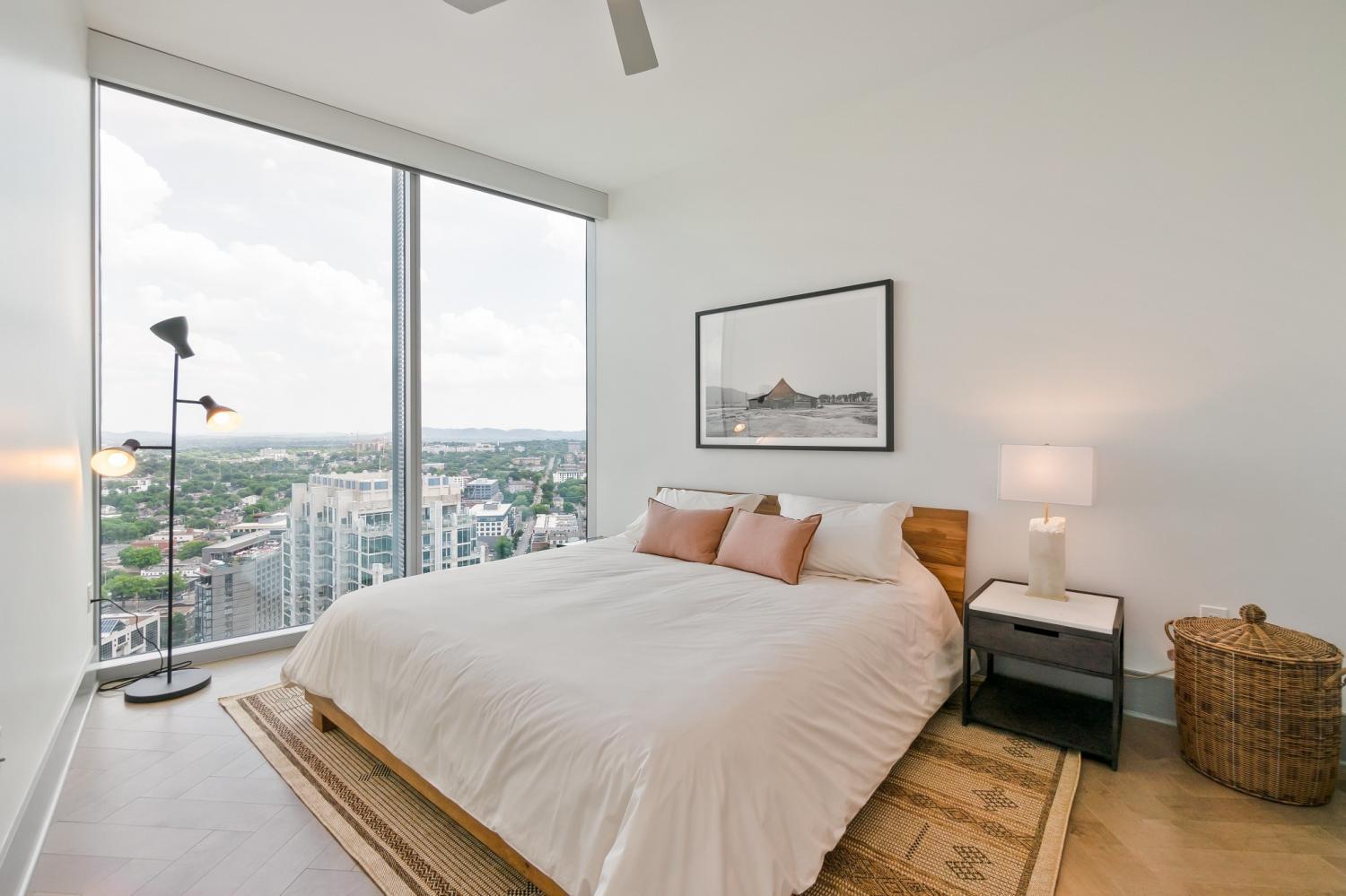 Fully-furnished corner unit for rent in Nashville's premier luxury high rise, Broadwest. This 30th floor condo has amazing views of downtown, Vanderbilt, and midtown. Featuring Sub-zero and Wolf appliances, herringbone wood floors, marble countertops and high-end details throughout. Primary suite highlights: double vanity, oversized shower, and walk-in closet. Motorized shades for all windows and full size washer/dryer in unit. Enjoy access to the 34th floor resort-style amenities including a rooftop pool, steam room, sauna, golf simulator, fitness center and more. Plus services provided through the Conrad Hilton Hotel: room service, valet parking, housekeeping, & laundry. This unit is fully furnished, including linens and kitchen & comes with two assigned garage parking spots.
