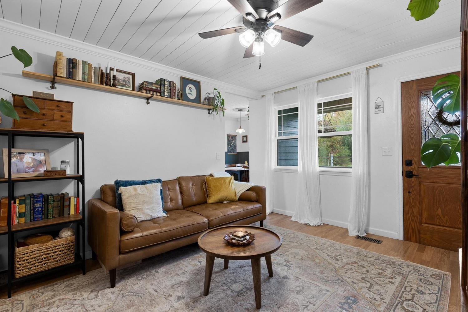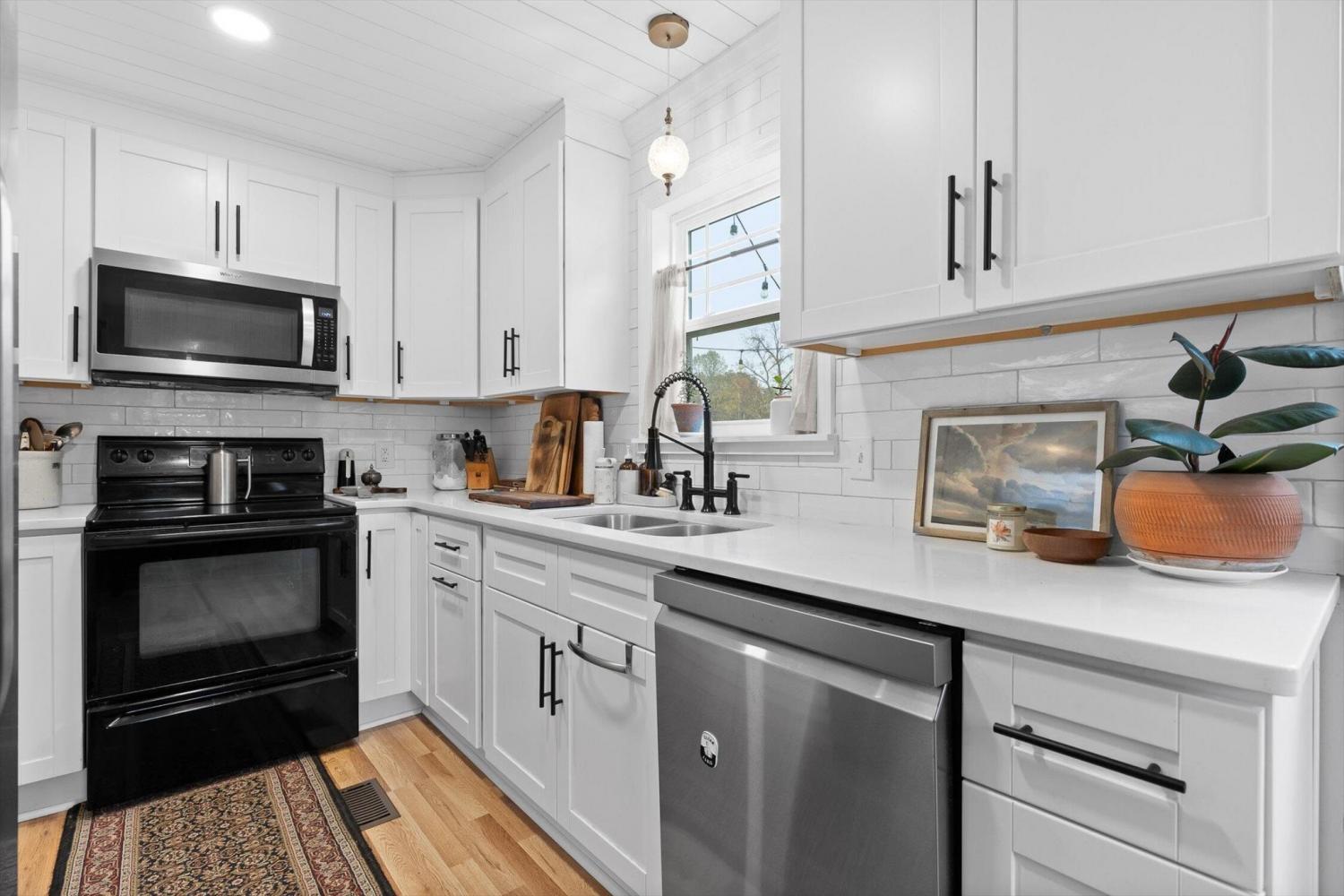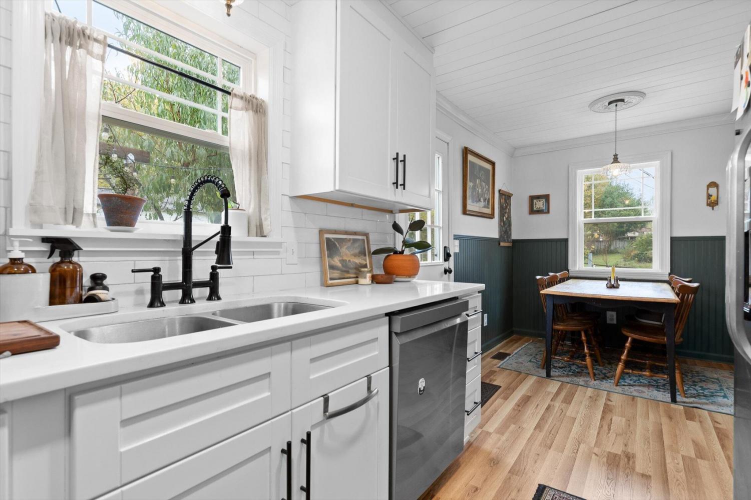 Discover the perfect blend of cozy charm and modern convenience in this beautifully updated cottage. Step inside to find a sunlit living space with a stunning tongue-and-groove ceiling, crown molding, and new, stylish flooring throughout. The kitchen dazzles with granite countertops, a striking tile backsplash, and contemporary lighting—ideal for both everyday living and entertaining. Enjoy to the newly renovated bathroom, and peace of mind with a brand-new septic tank, windows, and LP Smart Siding for lasting comfort and efficiency. Outside, a classic picket fence frames the efficiently designed yard, offering just the right amount of space for outdoor relaxation, gardening, or play. A large shed provides ample storage or workshop potential, while a freshly painted exterior and new crawlspace vapor barrier ensure this home is as dependable as it is delightful. Welcome to your charming sanctuary—where every upgrade has been thoughtfully chosen for comfort, style, and functionality.
