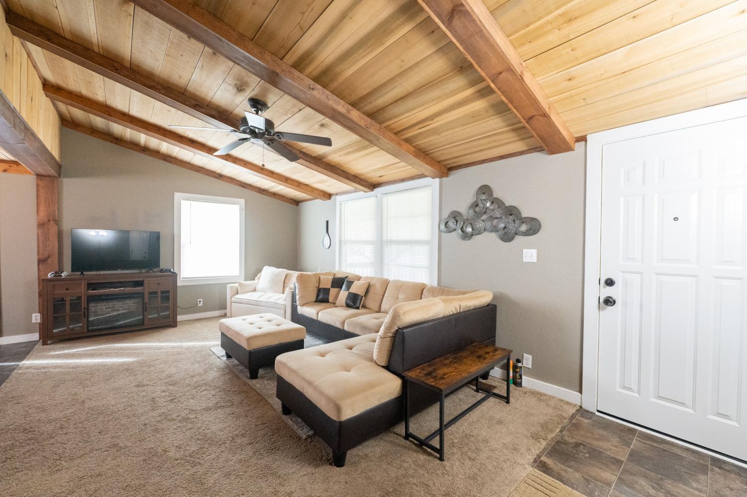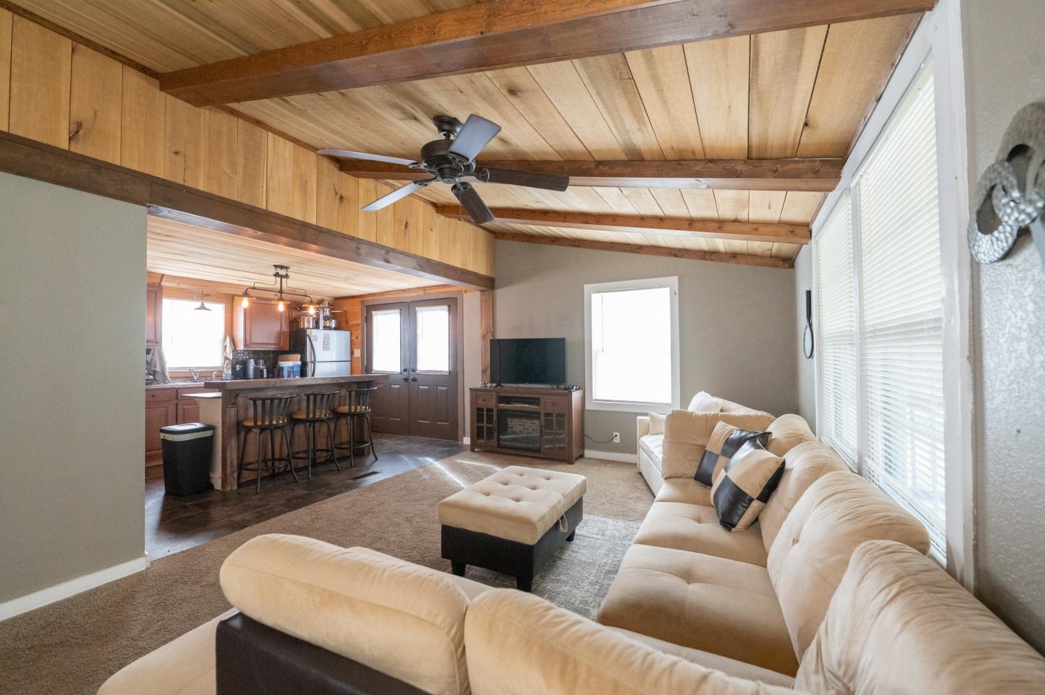 This welcoming 2 bedroom, 2 bath home offers rustic character and peaceful country living in Chickamauga. Set on a half-acre lot surrounded by scenic pastures, this home features a full-length covered front porch perfect for morning coffee or evening sunsets. Inside, you'll find warm, inviting finishes including a wood beam ceiling in the living room and wood-paneled accents throughout. The open kitchen is designed for everyday comfort and entertaining with a large island with barstool seating, stainless steel appliances, and plenty of workspace. The primary bedroom suite includes a sitting area, an archway, and an ensuite bath with a relaxing garden tub. The second bedroom, currently used as a home office, also has its own full bath featuring a tub/shower combo, wood-paneled walls, and a transom window that fills the space with natural light. The home is set on a permanent foundation and includes a barn-style storage building and ample driveway parking. Enjoy the tranquility of rural living just minutes from downtown Chickamauga.