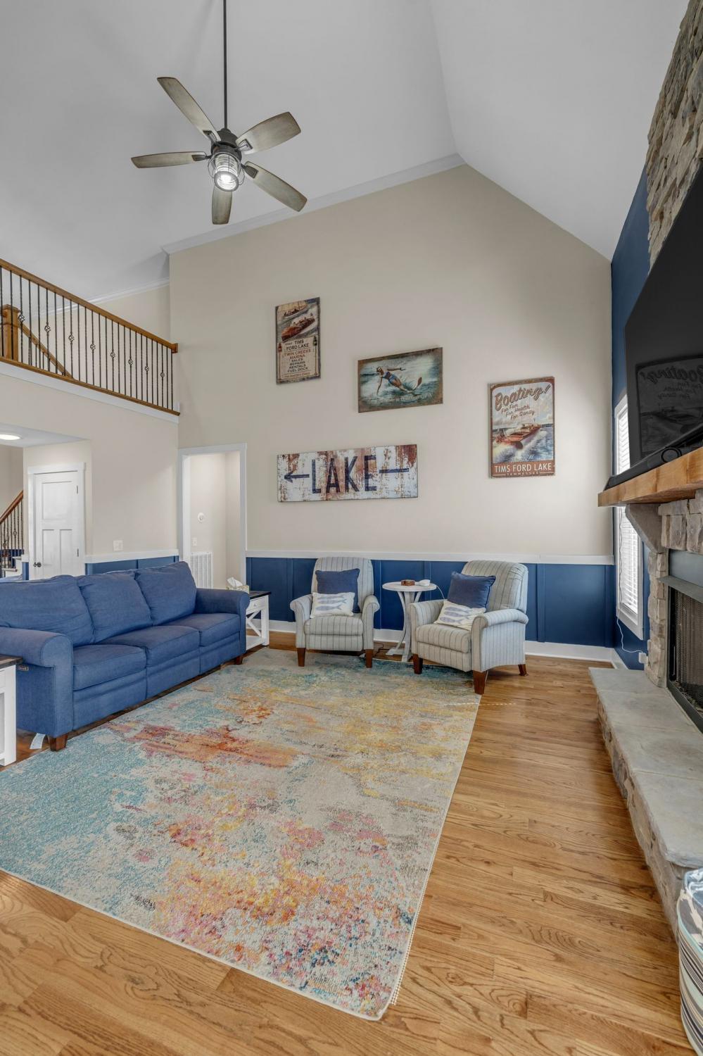 Motivated Seller! This beautiful, well-designed home in the gated Twin Creeks Village on Tim’s Ford Lake offers a spacious, functional floor plan with great separation for guests or family. Step inside to beautiful real hardwood floors, soaring ceilings, and a dramatic catwalk that gives the home a distinctive, open feel. The gourmet kitchen features granite countertops, a gas range, built-in oven, soft-close cabinets, coffee bar, and pantry—perfect for the home chef. The open living area centers around a cozy stone gas fireplace and includes a mounted 75" Samsung Q70 Series TV as a bonus! The main-level primary suite is a true retreat with a spa-like ensuite, featuring a large, tiled shower and a massive walk-in closet. Another bedroom and full bath are on the main floor, with two more bedrooms, a full bath, bonus room, and flex space upstairs. Step outside to one of the largest backyards currently available in the neighborhood—fully fenced and ideal for entertaining, relaxing, or pets. Enjoy the covered front porch, spacious back patio, and the added bonus of HOA-maintained lawn care. As a Twin Creeks Village resident, you'll enjoy 3 pools (including one heated), a clubhouse, putting green, firepits, walking trails, and ponds. Plus, Twin Creeks Marina & Resort offers boat slips, a beach, live music, dining, and more—just moments away. Take advantage of this competitively priced opportunity to make this standout home your own—schedule your showing today!