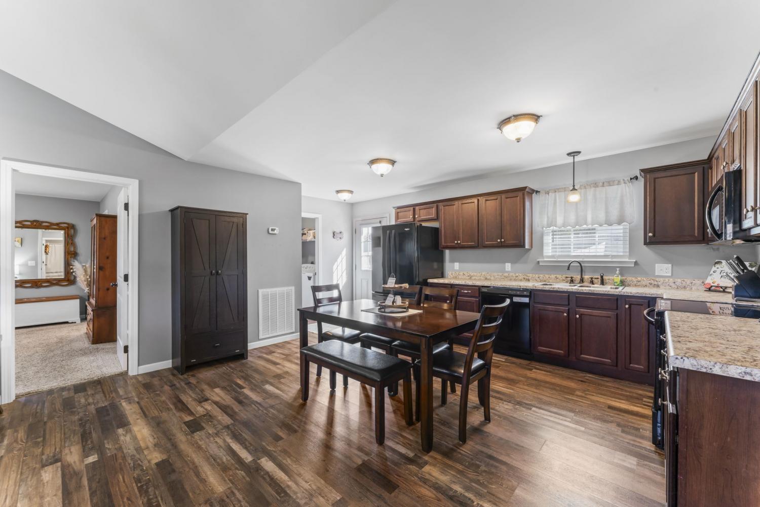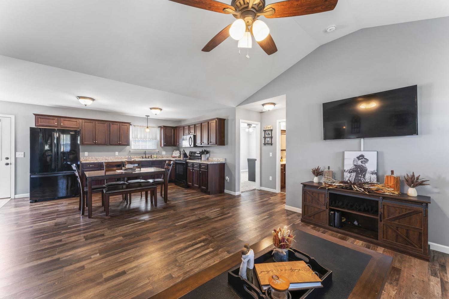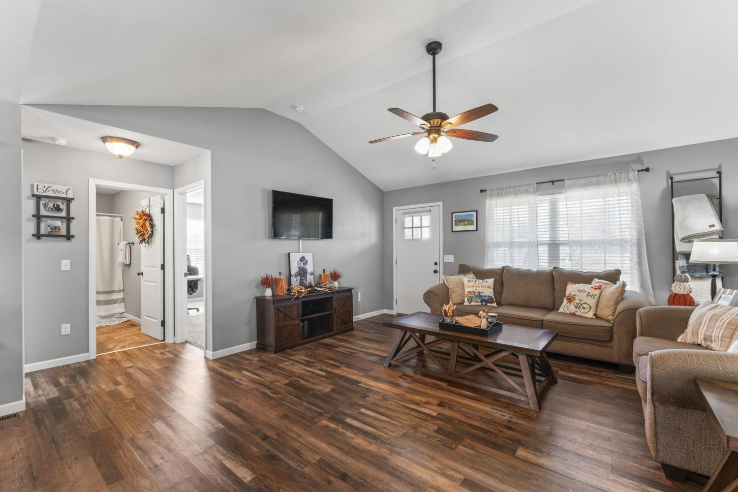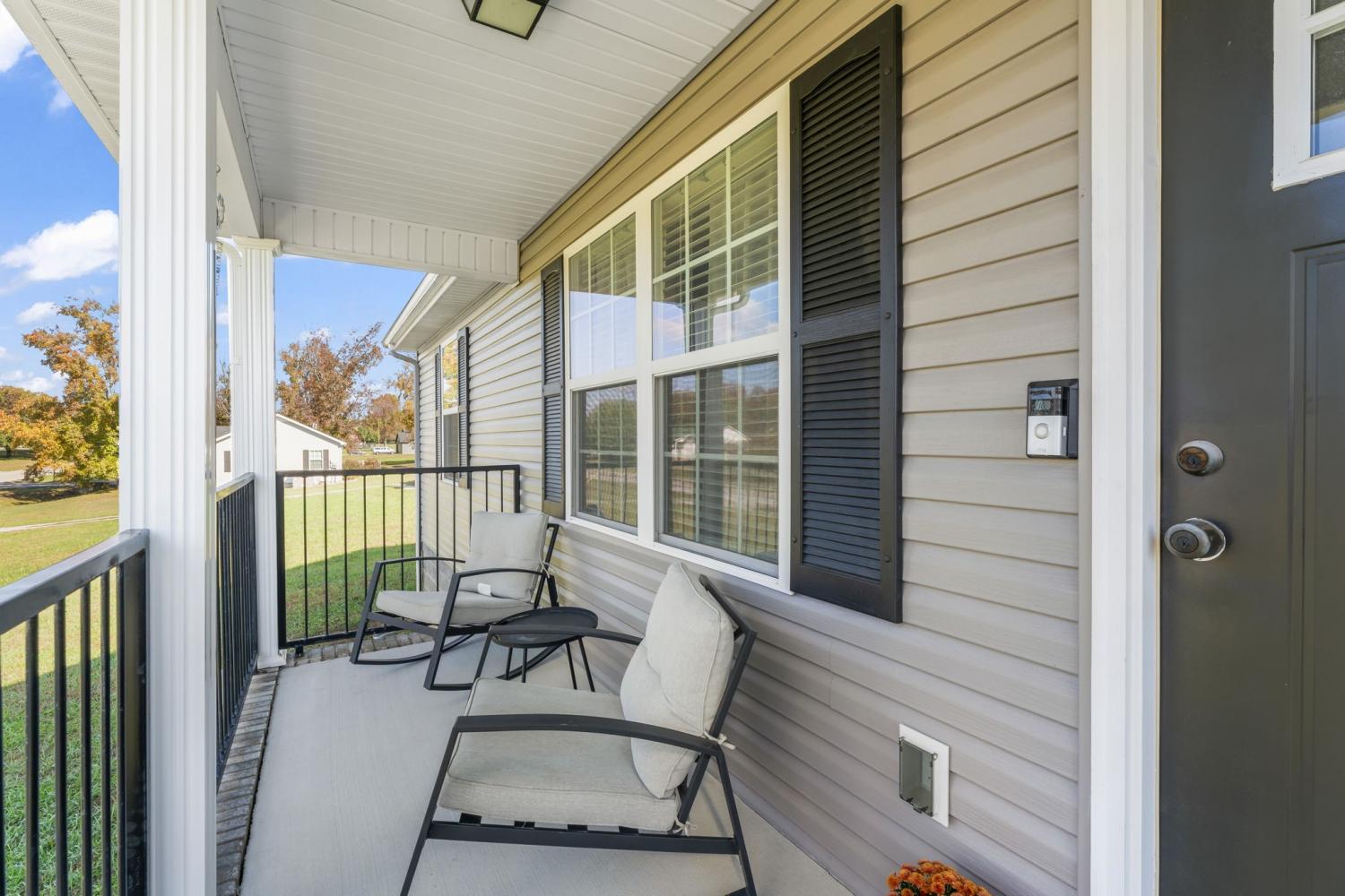 Discover this charming three-bedroom, two-bath home featuring elegant LVP flooring throughout and stylish tile in the bathrooms. The open floor plan offers a seamless living space, complemented by a beautiful kitchen with custom cabinetry and modern appliances — perfect for family gatherings. The spacious primary suite includes a large walk-in closet and a full bathroom with linen closet, a shower/tub combo and a double vanity for added luxury. Two additional guest bedrooms share a conveniently located bathroom, which features a large single vanity & a shower/tub combo. Enjoy a warm welcome on the covered front porch, and make the most of the large, fully fenced backyard with a 12 x 8 storage building — ideal for outdoor activities and storage. Conveniently situated near Morrison and Manchester, close to dining, shopping, and town amenities. An excellent choice for first-time homebuyers seeking comfort and convenience!