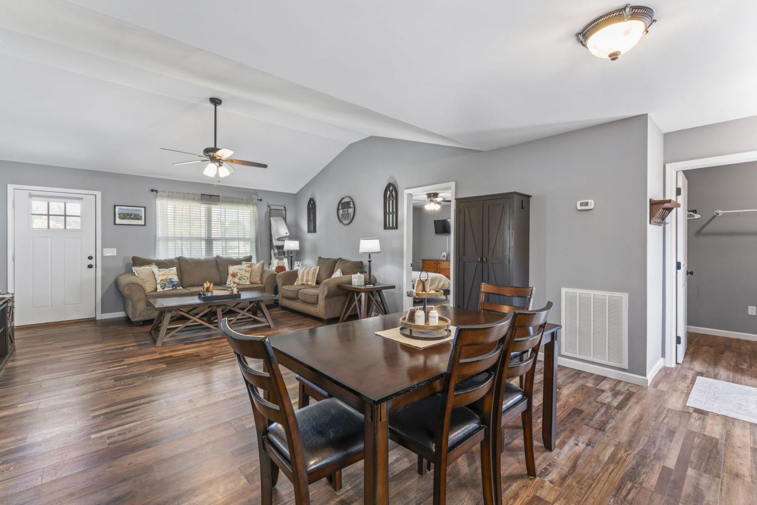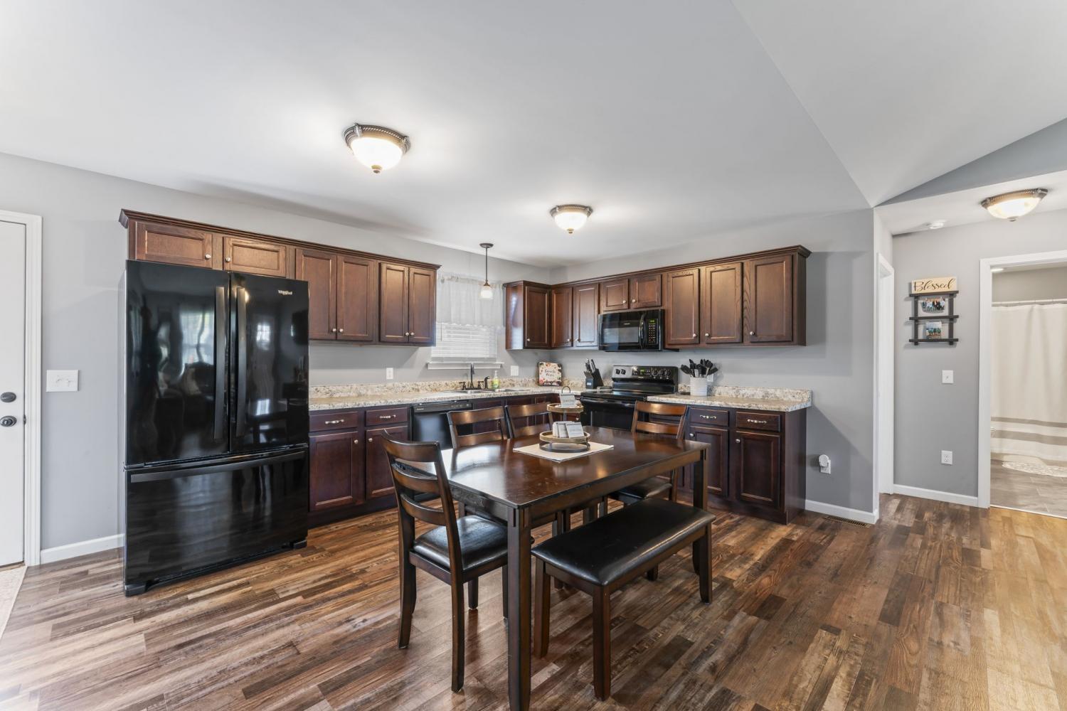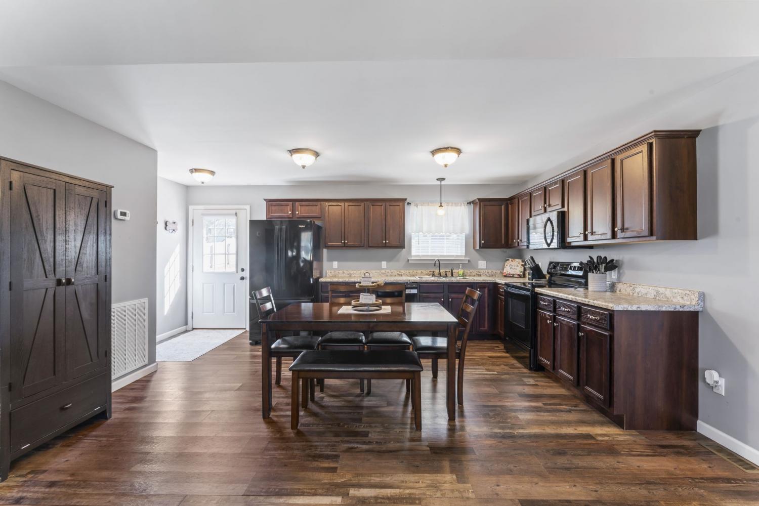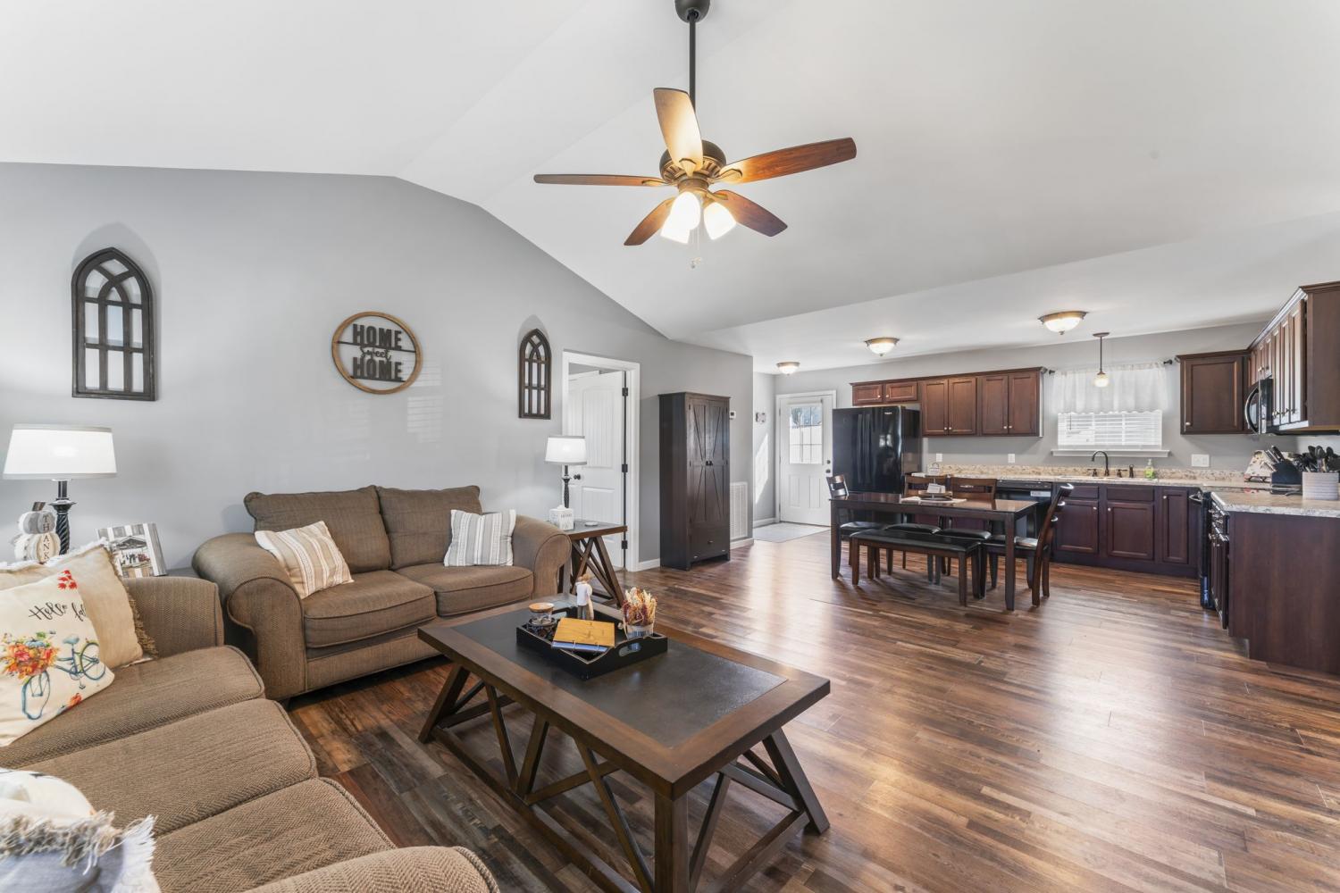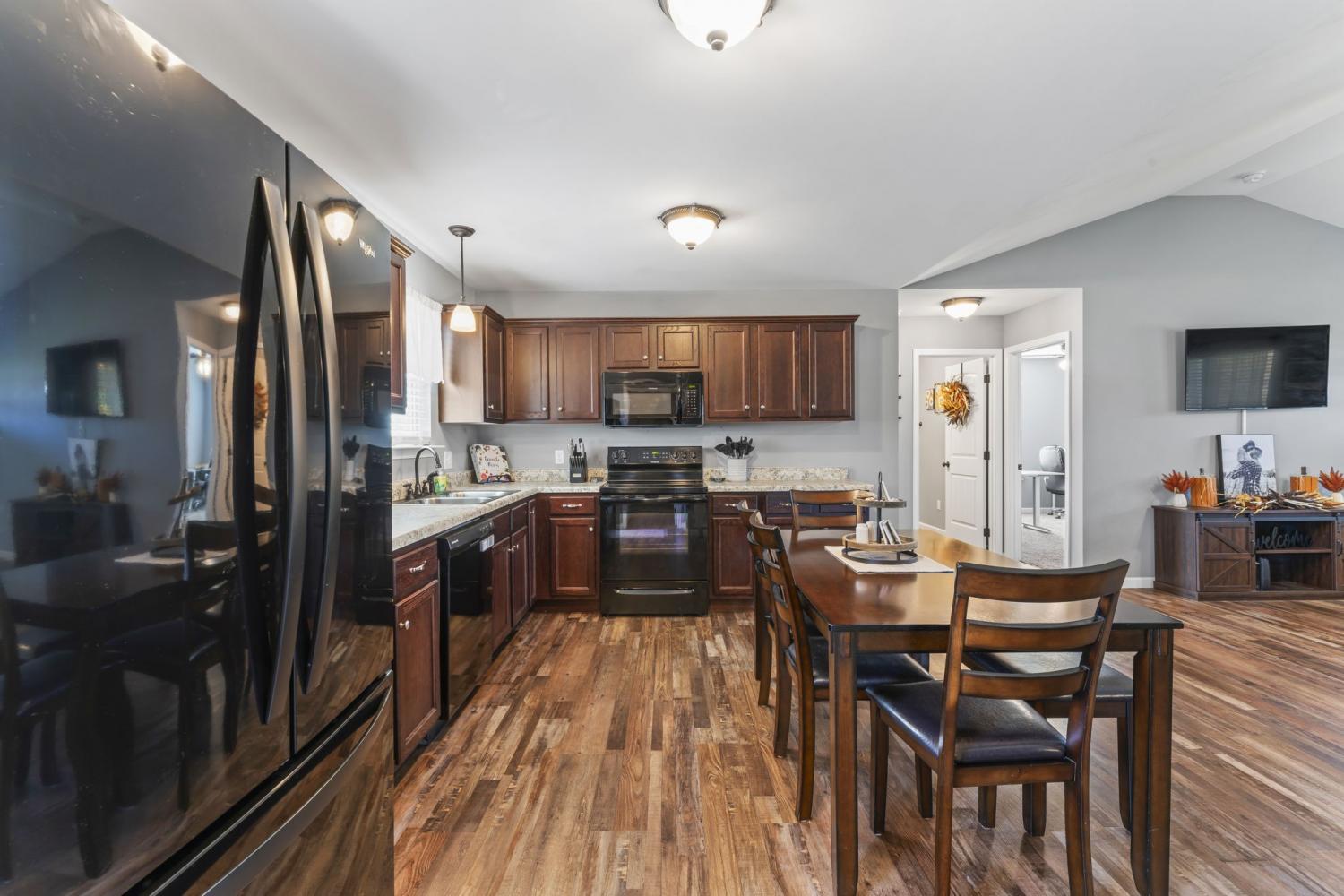Discover this charming three-bedroom, two-bath home featuring elegant LVP flooring throughout and stylish tile in the bathrooms. The open floor plan offers a seamless living space, complemented by a beautiful kitchen with custom cabinetry and modern appliances — perfect for family gatherings. The spacious primary suite includes a large walk-in closet and a full bathroom with linen closet, a shower/tub combo and a double vanity for added luxury. Two additional guest bedrooms share a conveniently located bathroom, which features a large single vanity & a shower/tub combo. Enjoy a warm welcome on the covered front porch, and make the most of the large, fully fenced backyard with a 12 x 8 storage building — ideal for outdoor activities and storage. Conveniently situated near Morrison and Manchester, close to dining, shopping, and town amenities. An excellent choice for first-time homebuyers seeking comfort and convenience!