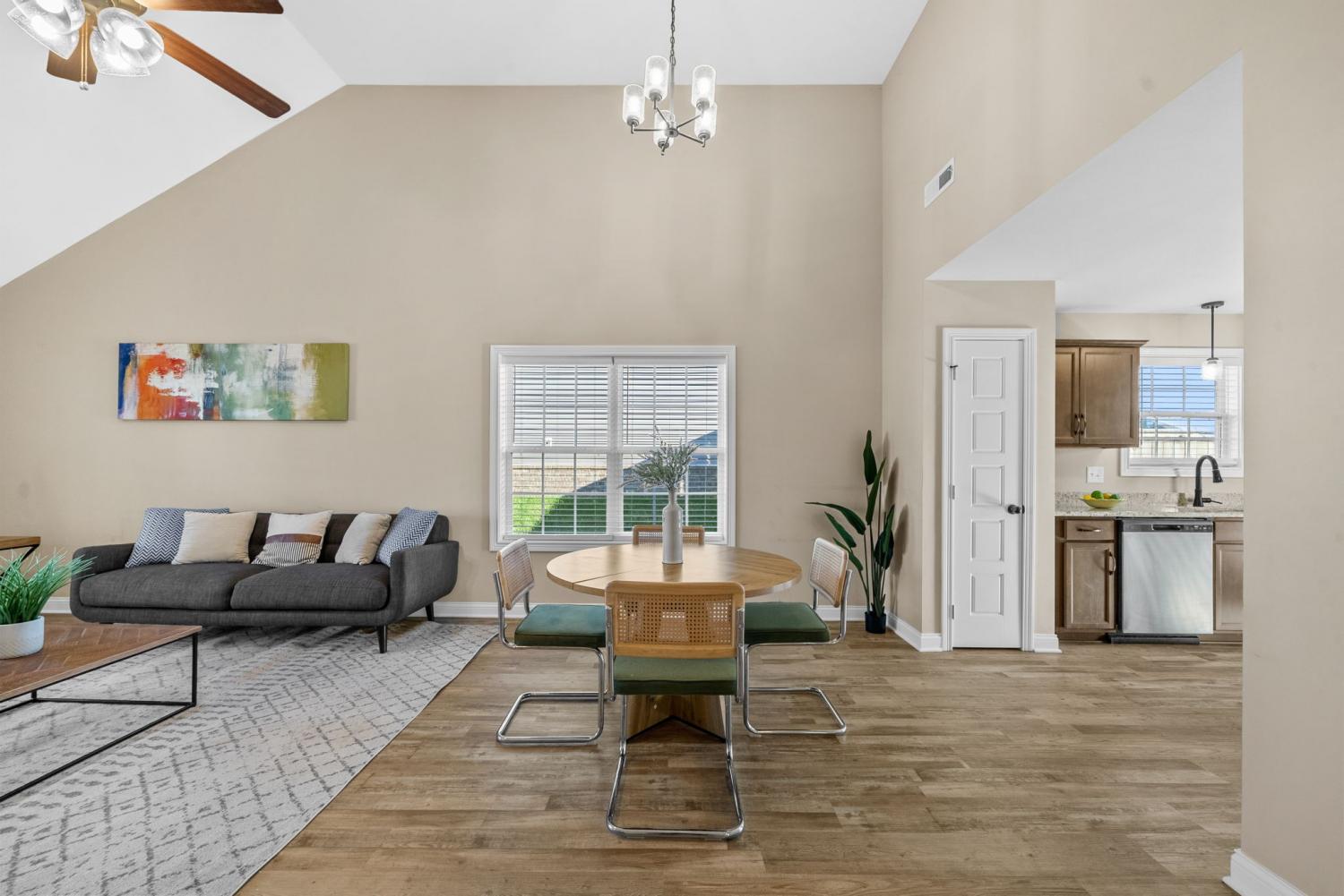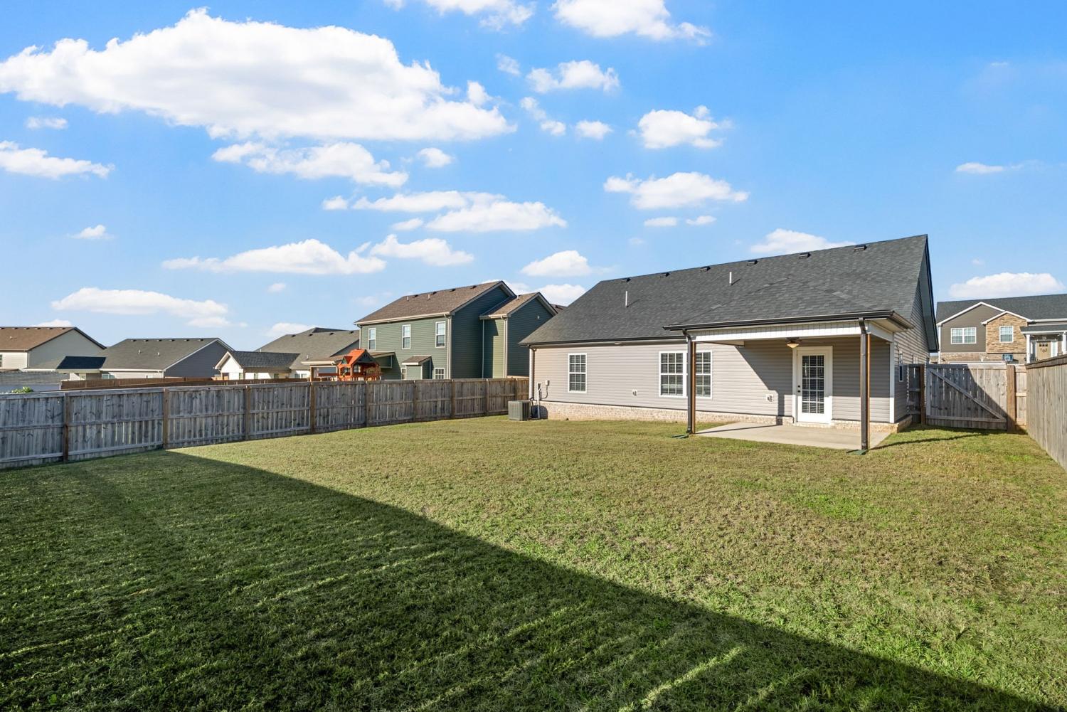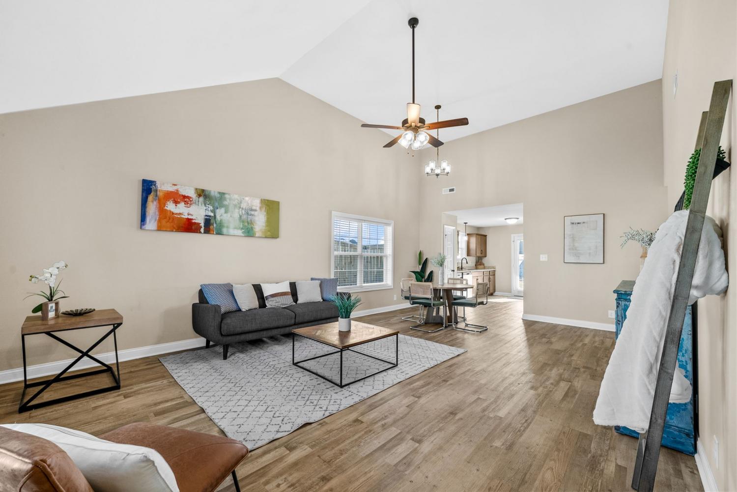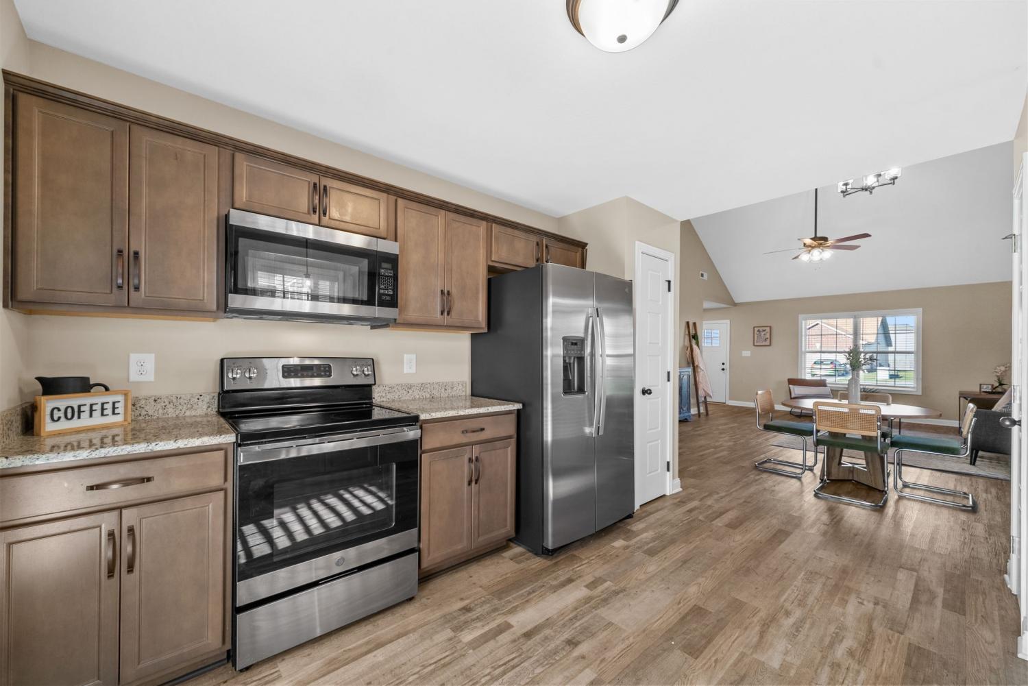 inviting open layout designed for modern living. The kitchen stands out with two spacious pantries, ample cabinetry, and generous counter space topped with beautiful granite countertops. The living room is warm and welcoming, featuring vaulted ceilings and a handy coat closet. Just off the main living area, the mud room offers incredible flexibility, with plenty of room for a storage cabinet or shoe rack. The primary suite is a relaxing retreat with a tray ceiling, a large walk-in closet, and a private bath featuring a tiled shower. Two guest bedrooms are comfortably sized and share a second full bathroom, perfect for family or visitors. Enjoy outdoor gatherings on the covered back patio overlooking a level yard, ideal for entertaining or relaxing. The garage comes complete with a sealed floor for a clean, polished finish. Located close to shopping and dining, this home blends thoughtful design, comfort, and convenience — everything you’ve been looking for in one perfect package.