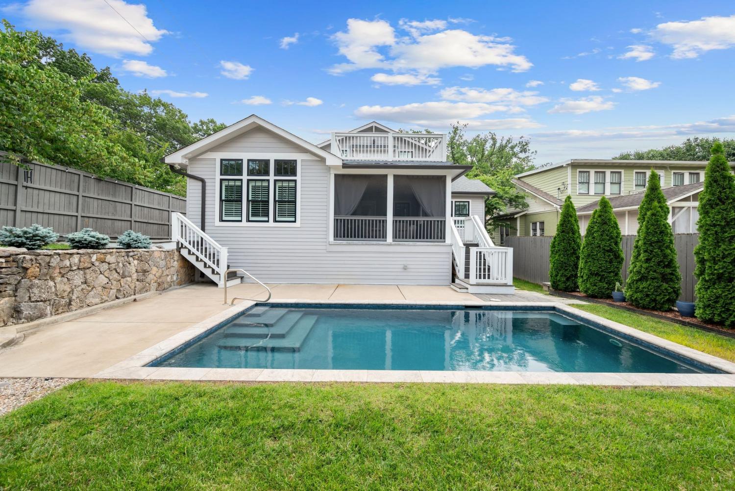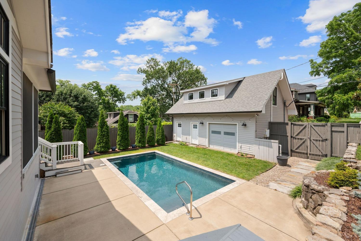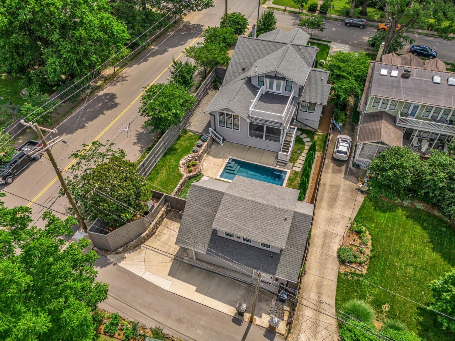Step into timeless charm and modern luxury with this beautifully renovated historic bungalow on one of Nashville’s most coveted streets and neighborhoods | Full renovation done in 2020 | Designed by Nine12 Architects | Blending classic architecture with high-end contemporary finishes | The main residence showcases light-filled interiors, original character, and thoughtful design ideal for everyday living and elegant entertaining |The chef’s kitchen opens seamlessly to elegant living areas ideal for entertaining, while the serene primary suite offers a spa-inspired retreat | Primary on main and a second primary suite upstairs with rooftop deck | Additional upgrades made in 2023 include interior construction, painting, hardwoods, lighting, electrical, and crawlspace upgrades | Outside, enjoy your own private oasis featuring the large covered patio, a 12x24 saltwater pool with a new privacy fence installed in 2023 and professionally landscaped yard by Gardens of Babylon | Half bath for pool at garage | A rare bonus with the fully equipped 664 sq ft DADU above the detached two-car garage perfect for guests, extended family or luxe rental potential | A few features to mention include plantation shutters, covered front porch with a porch swing, large covered back patio, new grill 2023, backup generator, tankless hot water heater, newer HVAC (2020), full irrigation system, and sump pump installed 2023, new dehumidifier 2024 | Rooftop deck on back of main house connected to upstairs primary suite | Basement has a great area for a workshop | This home offers the perfect blend of history, functionality, and Southern charm | Walkable with sidewalks | Just minutes from Nashville’s finest dining, culture, and entertainment