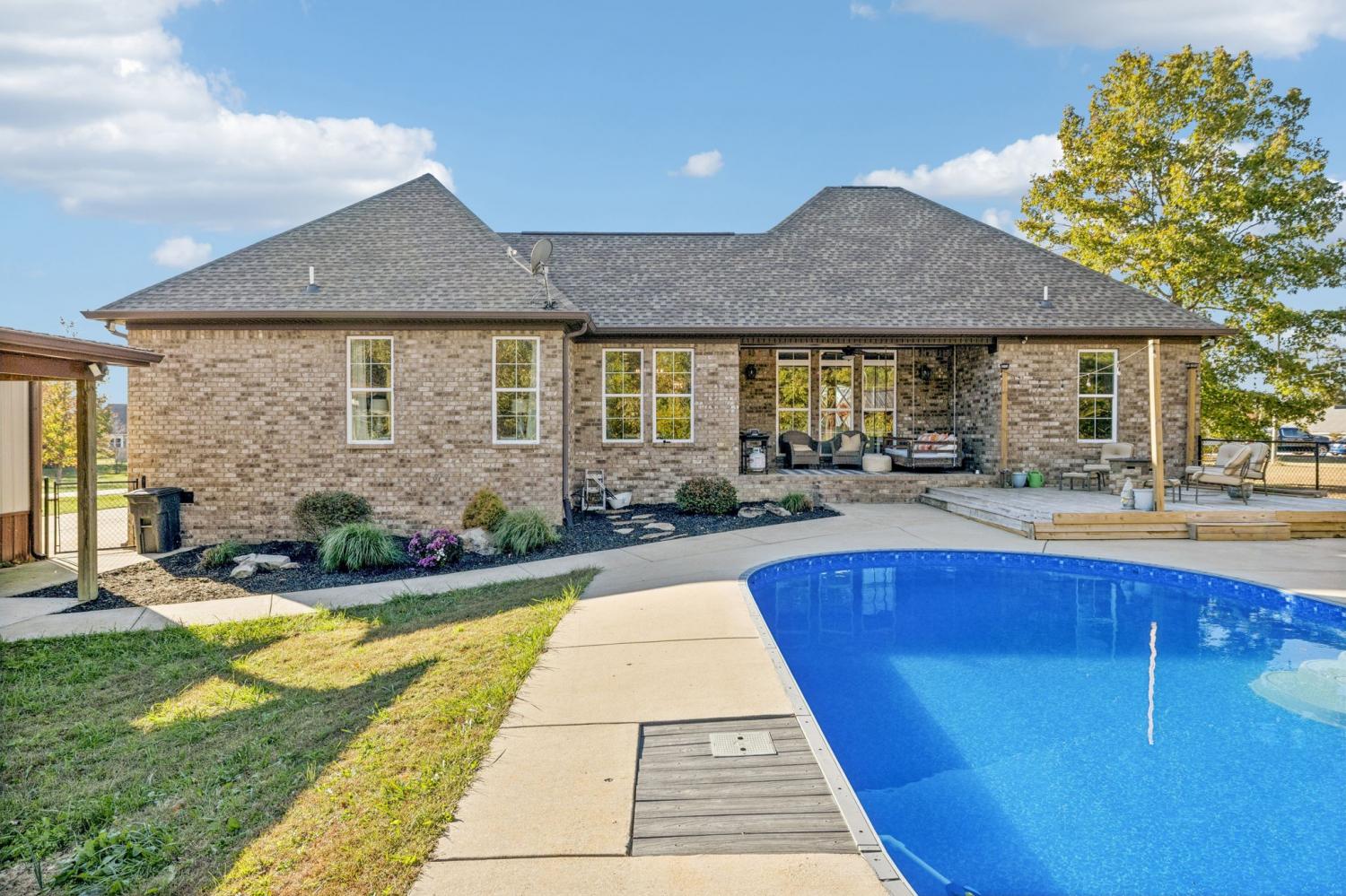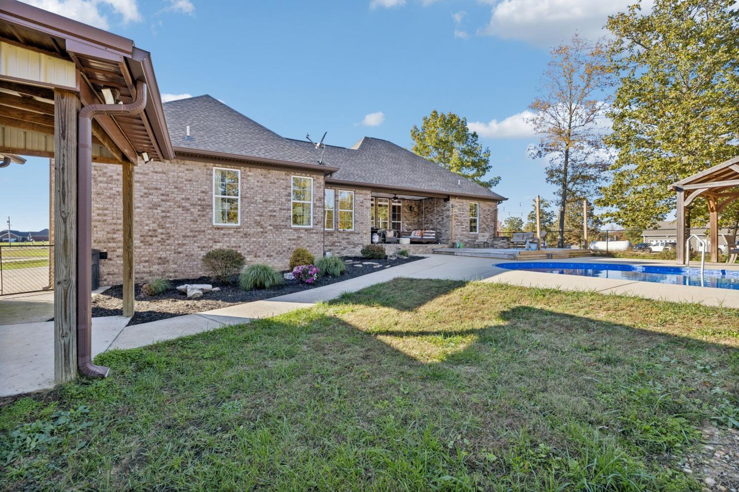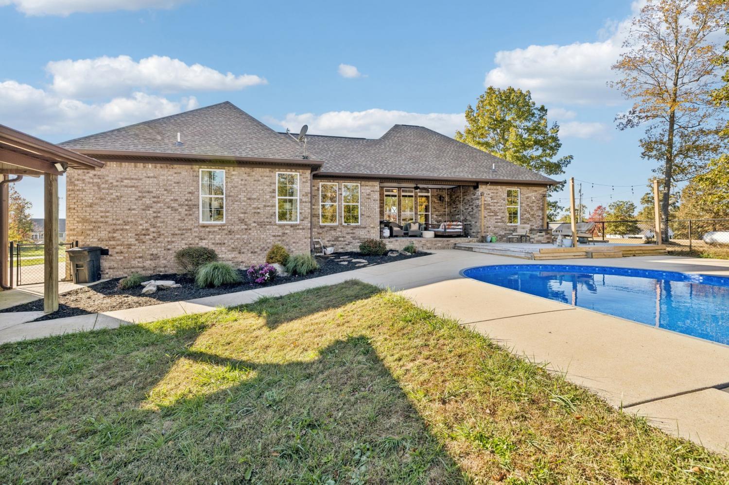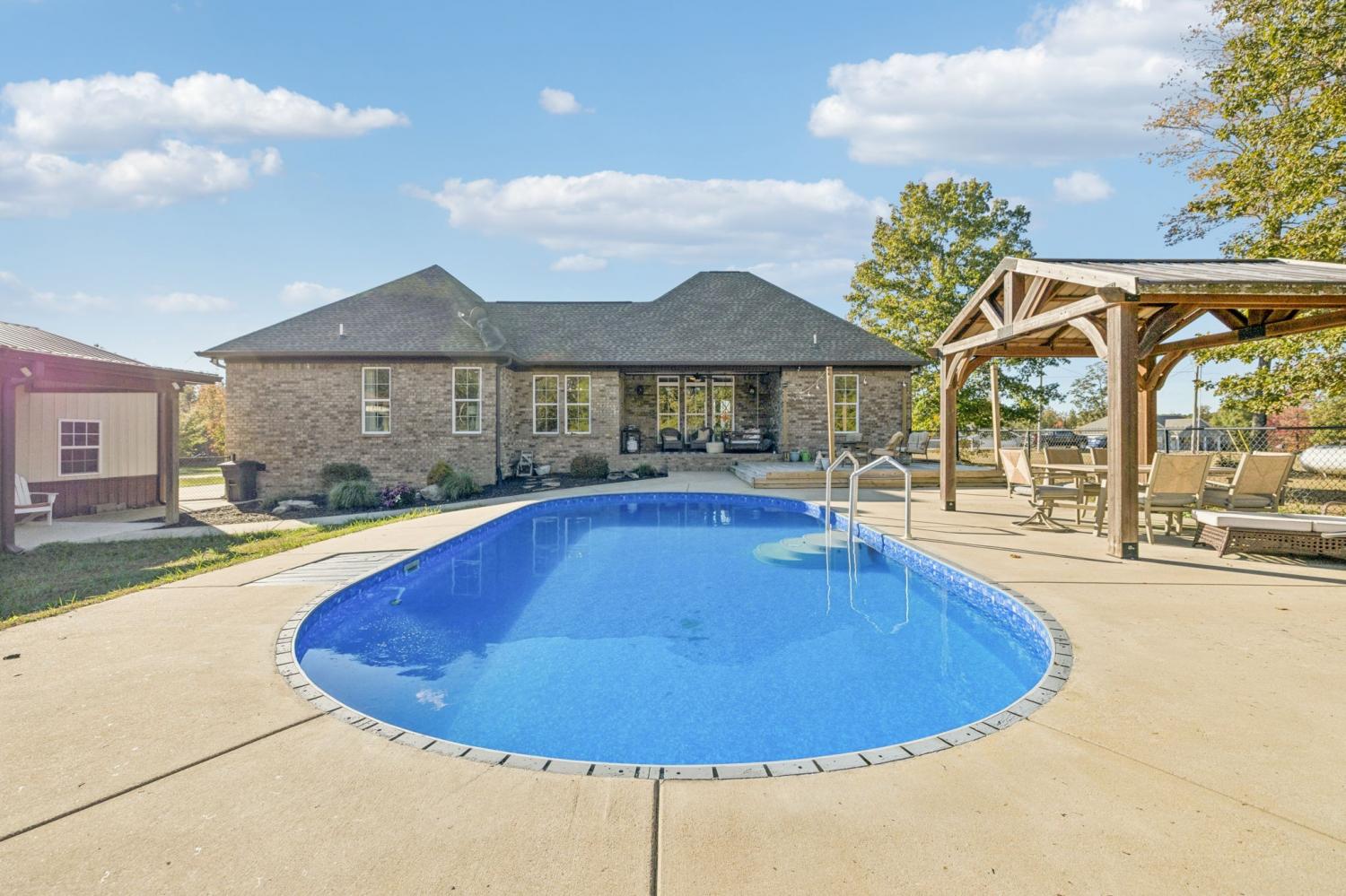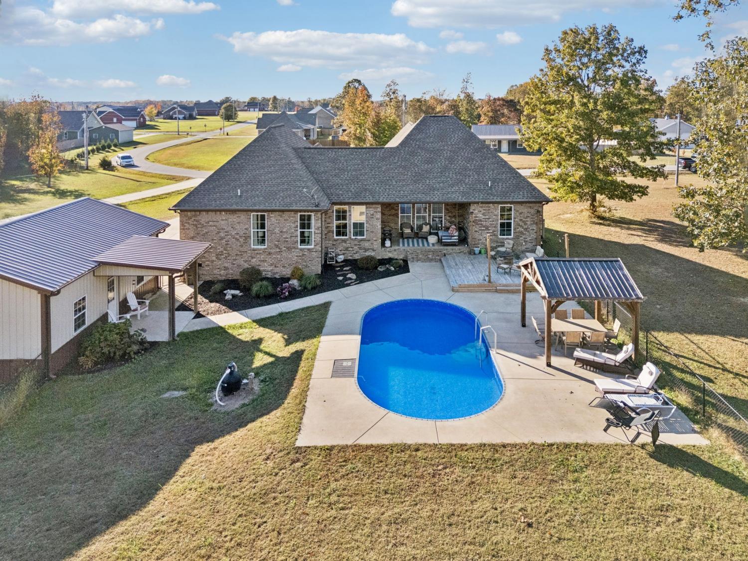 Welcome to a one-of-a-kind custom transitional craftsman home on a 1.43-acre lot in Freedom Crossing. This show-stopper offers the ultimate in lifestyle and entertaining, featuring a sparkling inground pool surrounded by expansive concrete, decking, a pavilion, and a spacious covered back porch. Step through grand double mahogany doors with beveled glass into an inviting foyer, where you'll find a versatile office or flex space with a large closet. Flow into an open-concept living area. The living room is designed to impress, featuring a gas-log fireplace, elegant built-ins, and oversized windows framing stunning views of your private backyard oasis. The kitchen is a masterpiece with custom maple cabinetry, quartz countertops, stainless steel appliances, and a walk-in pantry with floor-to-ceiling storage. Retreat to the luxurious primary suite featuring an indulgent 6x8 rainfall shower, a soaking whirlpool tub, double vanities, and a massive walk-in closet with custom built-ins. Thoughtful touches abound, from a utility room with extra cabinetry to a mudroom with cubbies for easy organization. The backyard oasis steals the show with multi-level entertaining spaces. Plus, a 20x30 shop with water and electricity is ready for all your hobbies or storage needs. This is truly a dream home where every detail is designed for comfort, style, and memorable moments! This home is a testament to thoughtful ownership and continuous care. The sellers invested in numerous upgrades during construction, ensuring both comfort and efficiency for years to come. From a tankless gas water heater and energy-saving spray foam insulation to durable PEX plumbing, every detail reflects their commitment to quality. They maintain the home by having it professionally sprayed twice a year for pests and scheduling bi-annual HVAC servicing.