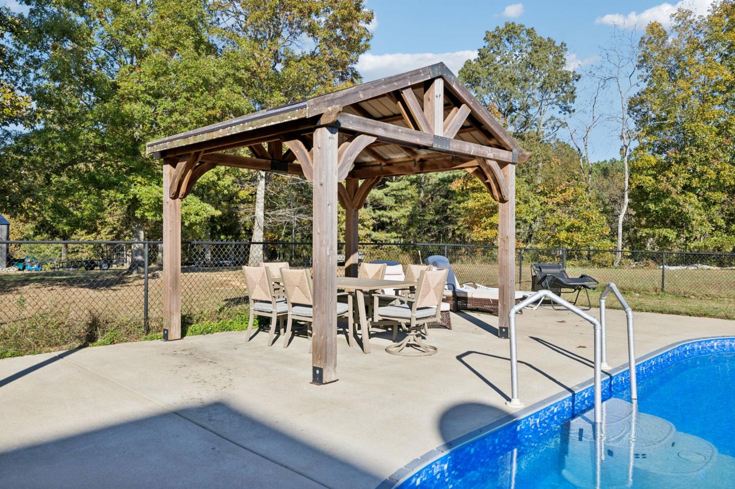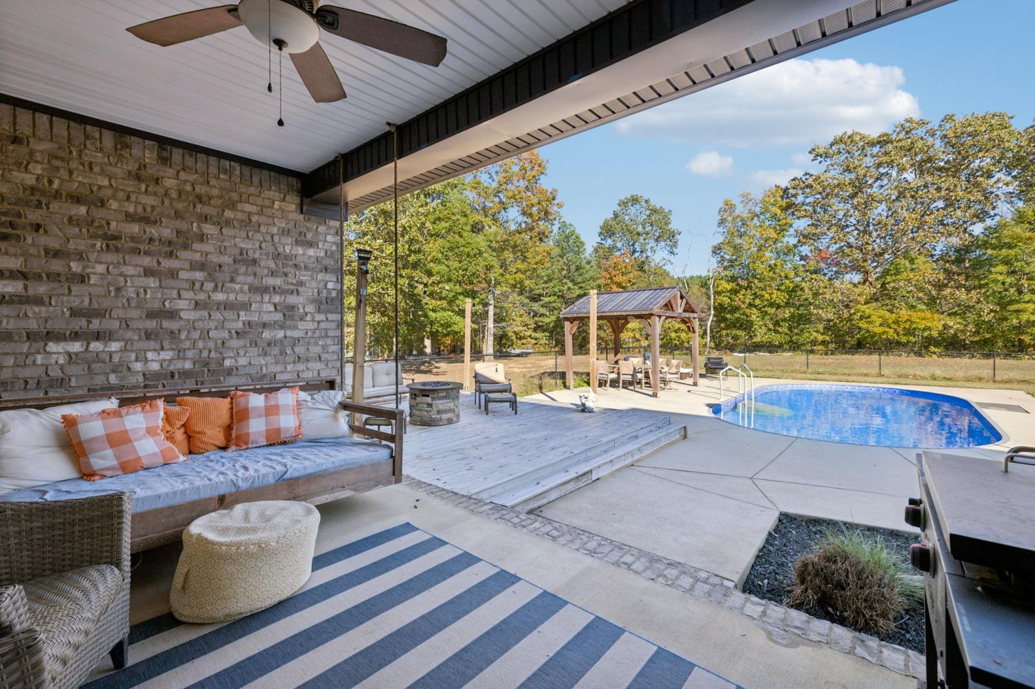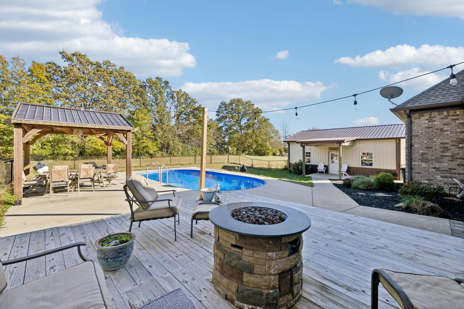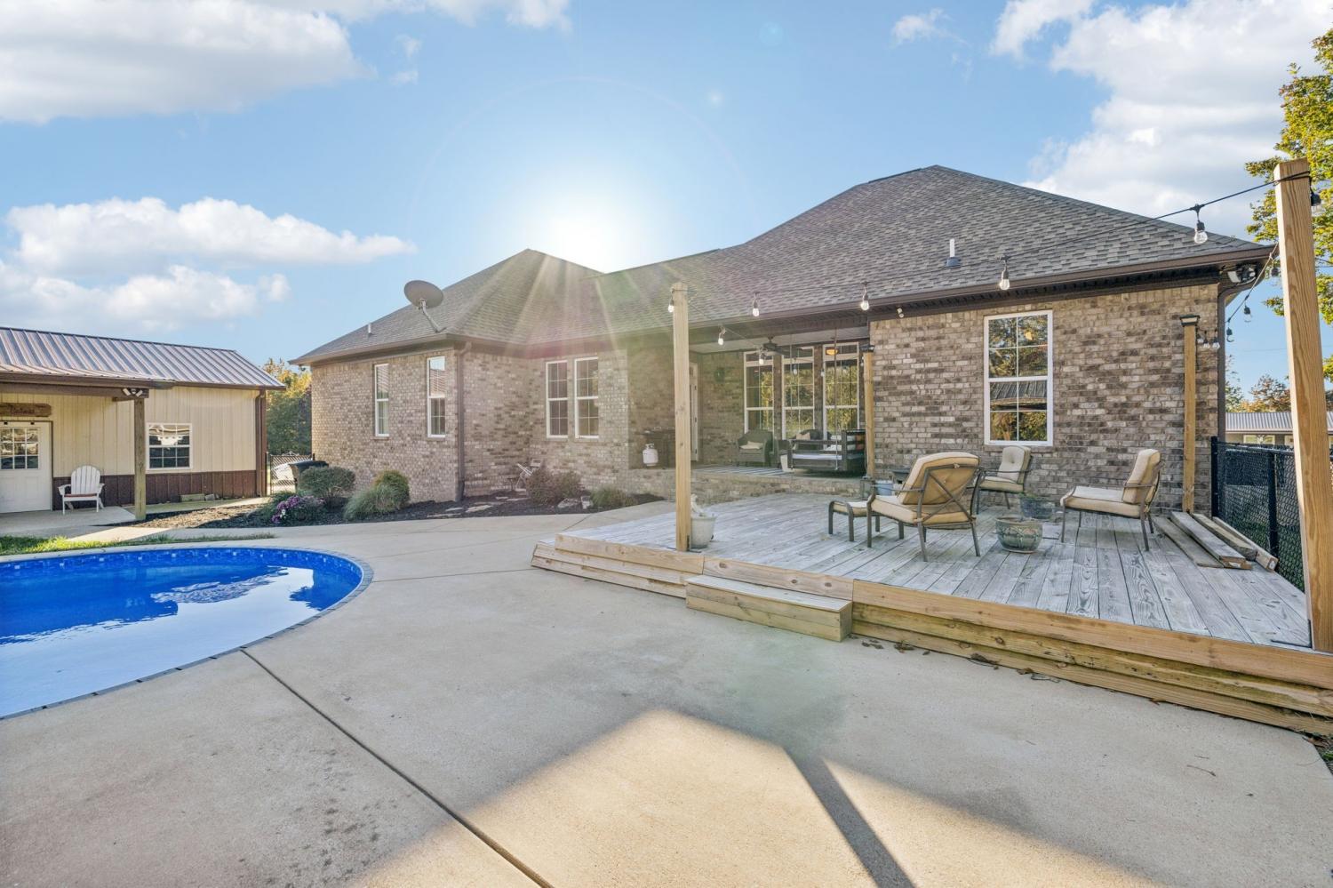 Welcome to a one-of-a-kind custom transitional craftsman home on a 1.43-acre lot in Freedom Crossing. This show-stopper offers the ultimate in lifestyle and entertaining, featuring a sparkling inground pool surrounded by expansive concrete, decking, a pavilion, and a spacious covered back porch. Step through grand double mahogany doors with beveled glass into an inviting foyer, where you'll find a versatile office or flex space with a large closet. Flow into an open-concept living area. The living room is designed to impress, featuring a gas-log fireplace, elegant built-ins, and oversized windows framing stunning views of your private backyard oasis. The kitchen is a masterpiece with custom maple cabinetry, quartz countertops, stainless steel appliances, and a walk-in pantry with floor-to-ceiling storage. Retreat to the luxurious primary suite featuring an indulgent 6x8 rainfall shower, a soaking whirlpool tub, double vanities, and a massive walk-in closet with custom built-ins. Thoughtful touches abound, from a utility room with extra cabinetry to a mudroom with cubbies for easy organization. The backyard oasis steals the show with multi-level entertaining spaces. Plus, a 20x30 shop with water and electricity is ready for all your hobbies or storage needs. This is truly a dream home where every detail is designed for comfort, style, and memorable moments! This home is a testament to thoughtful ownership and continuous care. The sellers invested in numerous upgrades during construction, ensuring both comfort and efficiency for years to come. From a tankless gas water heater and energy-saving spray foam insulation to durable PEX plumbing, every detail reflects their commitment to quality. They maintain the home by having it professionally sprayed twice a year for pests and scheduling bi-annual HVAC servicing.