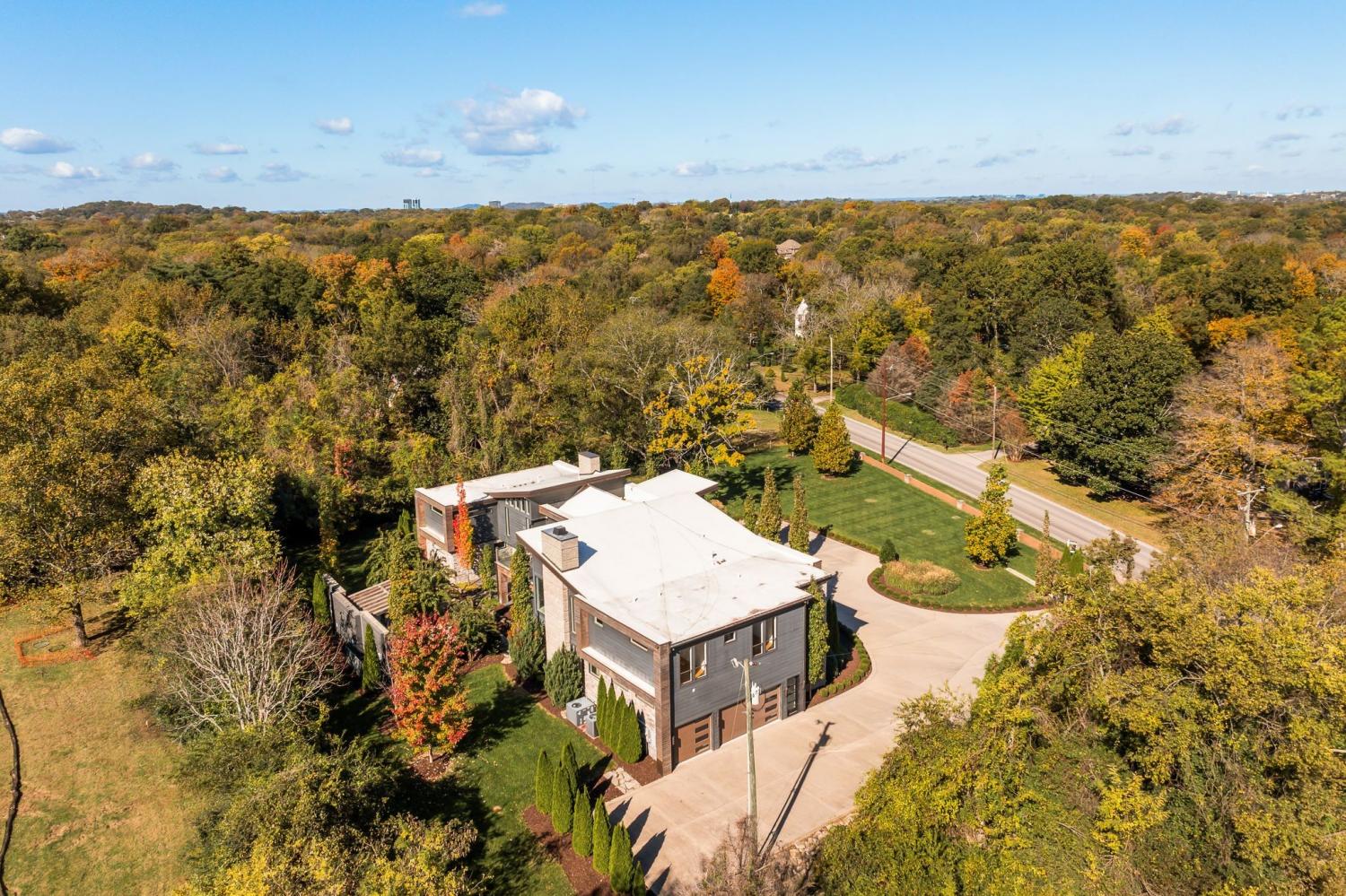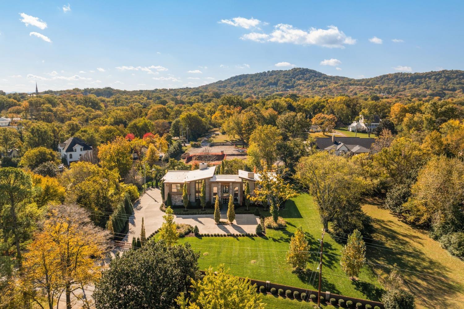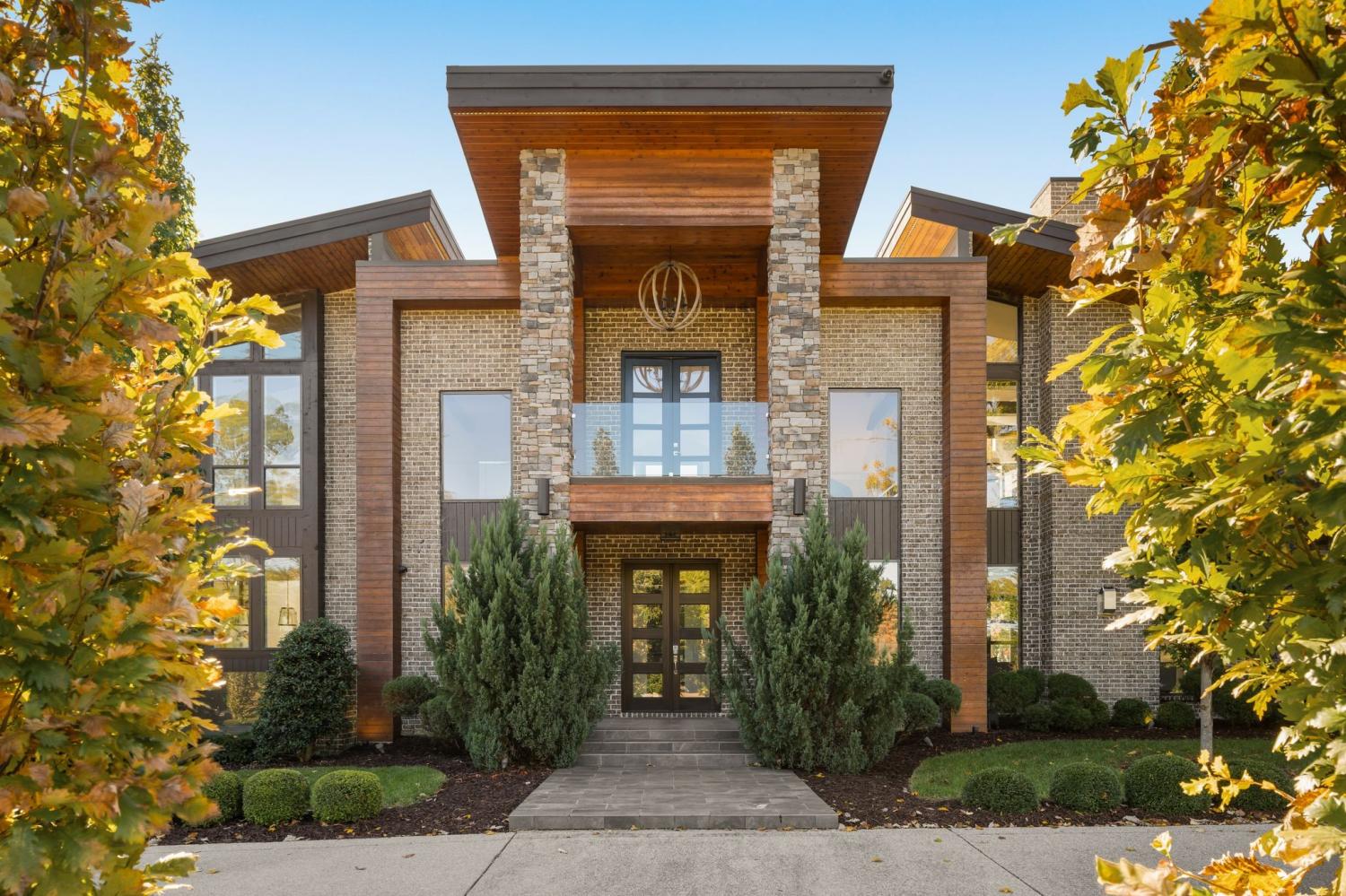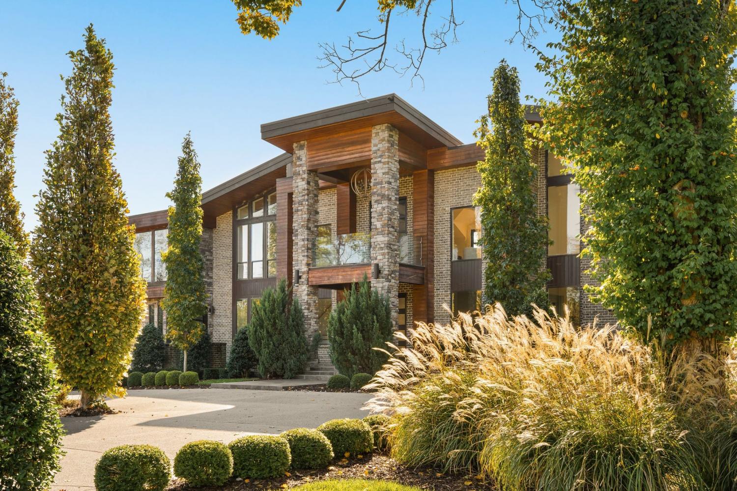Warm contemporary architecture with a mountain-luxury feel awaits at this privately gated 1-acre estate in prestigious Oak Hill. Just 15 minutes from downtown Nashville and the airport, and 10 minutes from Green Hills, it offers convenience without sacrificing privacy. The exterior showcases brick, wood and stone siding, lush new landscaping, mature trees and incredible entertaining spaces with plenty of room for a pool. The backyard features multiple water elements, a covered bar, two wet bars, a custom fire pit and seating for groups large or small—all overseen by a spacious second-floor terrace. Inside, a marble foyer opens to a living room with soaring beamed ceilings, the first of three fireplaces, and walls of windows filling the home with natural light. The chef’s kitchen boasts top-end appliances, abundant storage, a breakfast nook and its own wet bar with wine cooler and ice machine. The primary suite, located on the main level, is a retreat with floor-to-ceiling windows, a deep walk-in closet and spa-like bath wrapped in luxury tile with a large shower and soaking tub. The basement offers your own speakeasy and wine cellar, while three additional lounges across the main and upper levels each feature a bar or fireplace, plus a sunroom for indoor/outdoor enjoyment. The laundry includes a dog wash, and a home gym with mirrored walls and panoramic views fulfills any fitness needs. A 3-car garage and $300k security system ensure peace of mind. Furnished optional. Home has some maintenance needs due to seller not living in it for a while (Should be quick repairs. Contact listing agent for details).