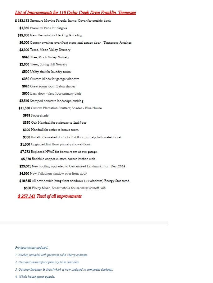 Are you looking for a place that feels like you’re living in the country, but close to all of the amenities? Cedarmont Farms is a "best kept secret." Stunning and mature neighborhood with rolling hills and a lot of trees....your own little woodland retreat! This beautiful estate home is nestled on a lush 1.29 acre corner lot. Your new home has wonderful curb appeal and will give you that sigh of relief, when you arrive home. Great home for entertaining! 9-foot ceilings on main level. Guests are greeted by a grand two-story foyer, formal dining room, and office / flex room. The great room with wood-burning fireplace, opens to the new outdoor living area with the commercial pergola system. The system opens and closes with a remote for your comfort. Kitchen is a chef's dream with natural cherry cabinets. ample cupboard space, huge island, new copper sink / faucet, double ovens, and a pantry. Central vac. Great home for multi-generational living too! Primary suites on main and secondary level, both having beautiful bathrooms and oversized, walk-in closets. Remaining two bedrooms on second floor have Jack and Jill bathroom. Family room / Rec room is a huge room to spread out a relax. New roof in December 2024. Newer HVAC upstairs. All front double-hung windows were just replaced before. Over $250,000 in improvements since 2021. See the attached list of improvements. The Pearl Park coming soon! "The newly named Pearlene M. Bransford Complex will feature an inclusive playground, football and lacrosse fields, a Clean Water Facility, an educational walking trail along the Harpeth River and other amenities. Construction is expected to begin in March 2025."