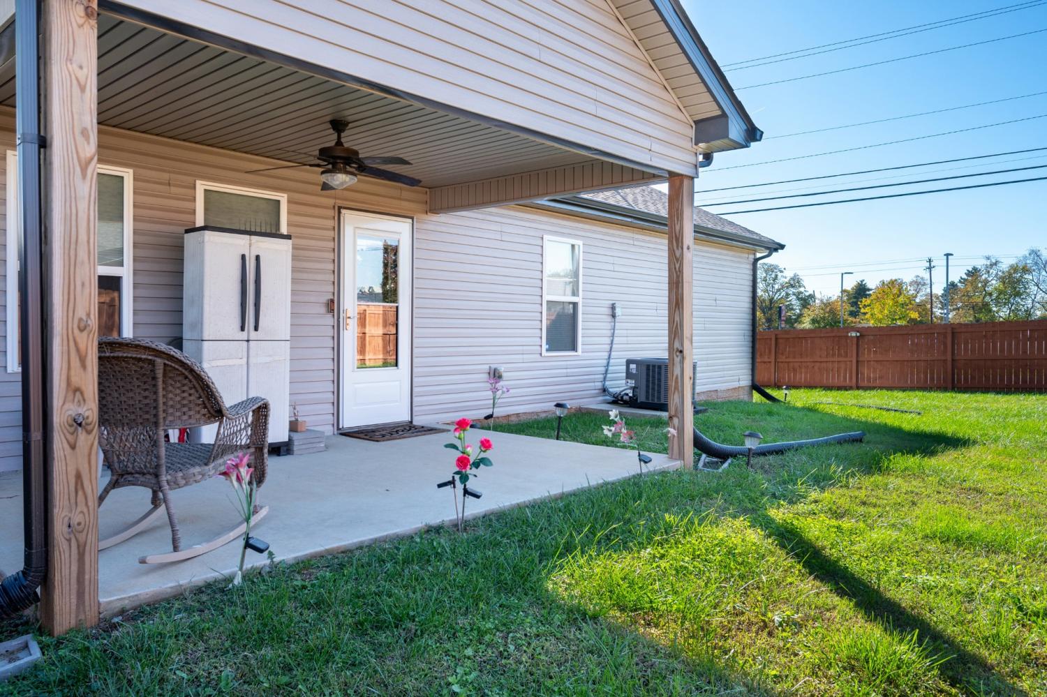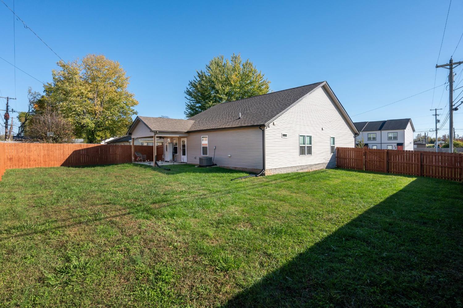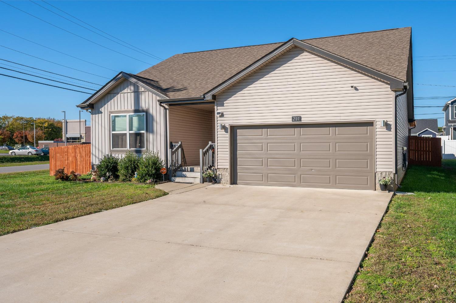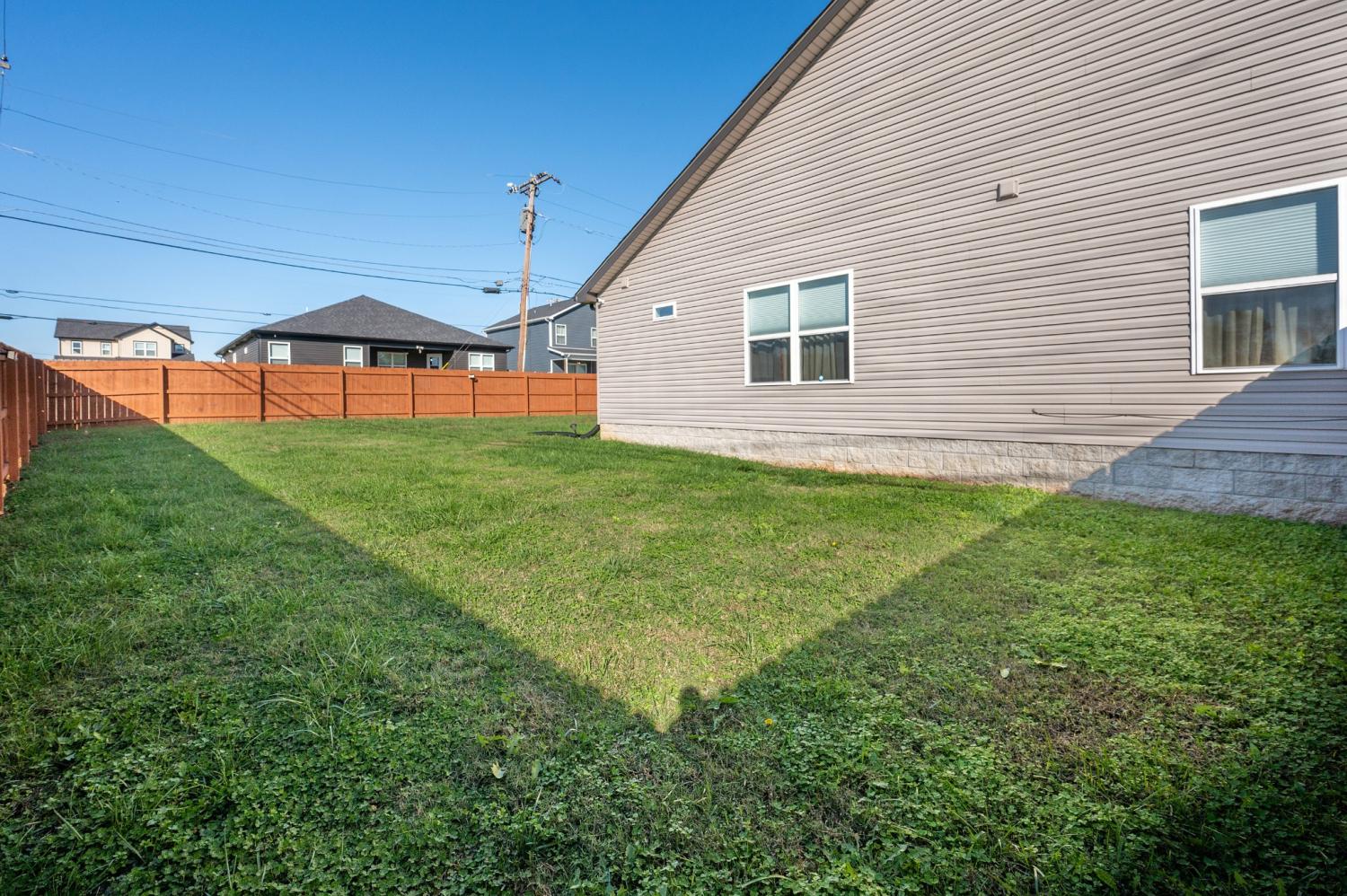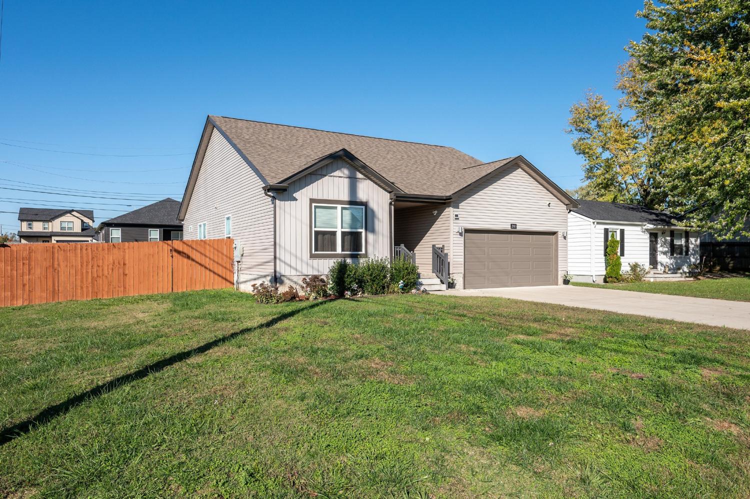 Like-new single-level home with concrete drive and 2-car front-entry garage. Welcoming covered front porch leads into an open floor plan connecting the kitchen, living, and dining areas with a high ceiling in the living room. The kitchen features granite countertops, stainless appliances, rich cabinetry, and center-island seating. The primary suite includes a spacious tile shower and double vanity. Enjoy outdoor living on the covered patio overlooking a large, privacy-fenced backyard. Near entrance for Fort Campbell!