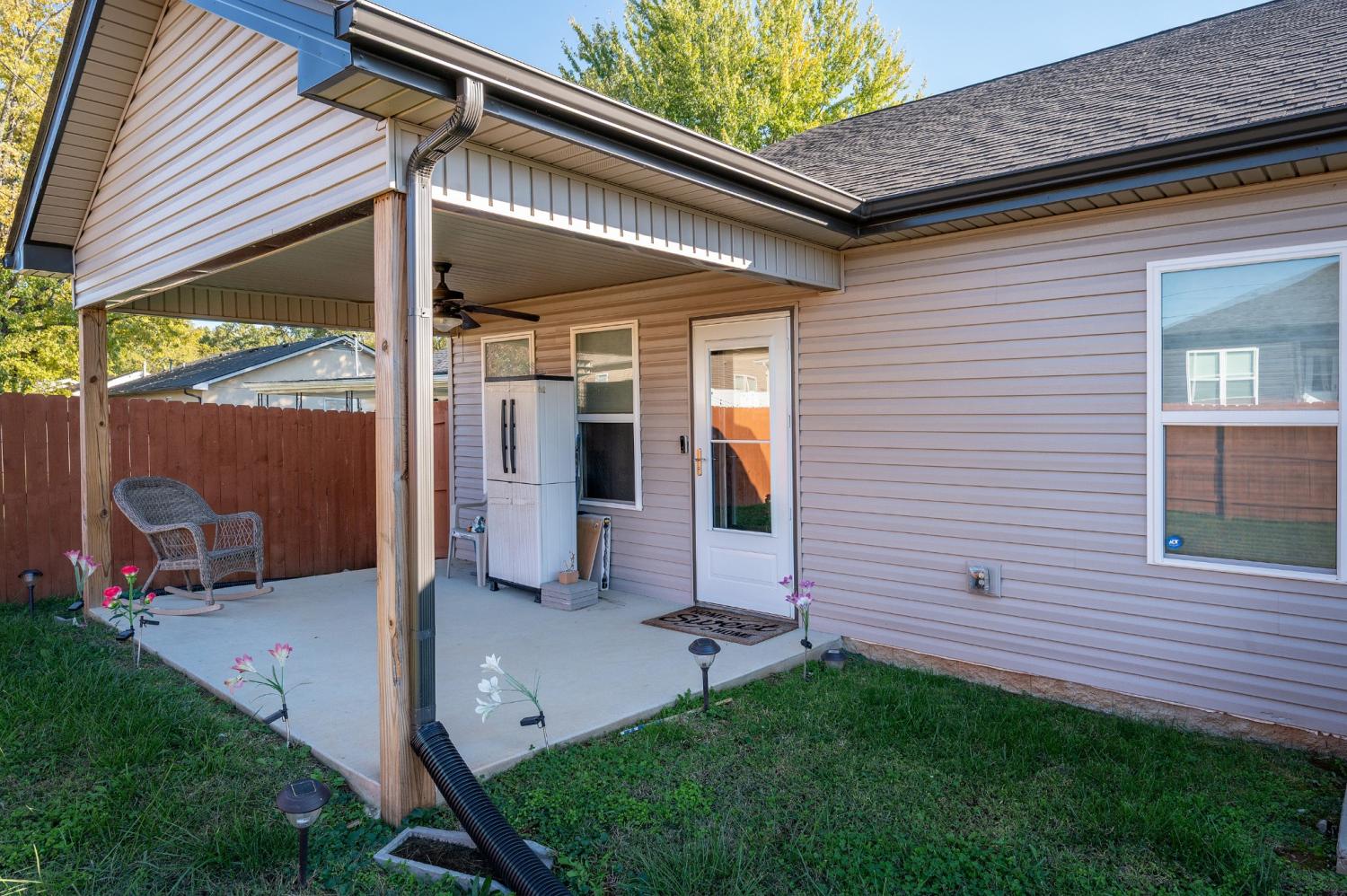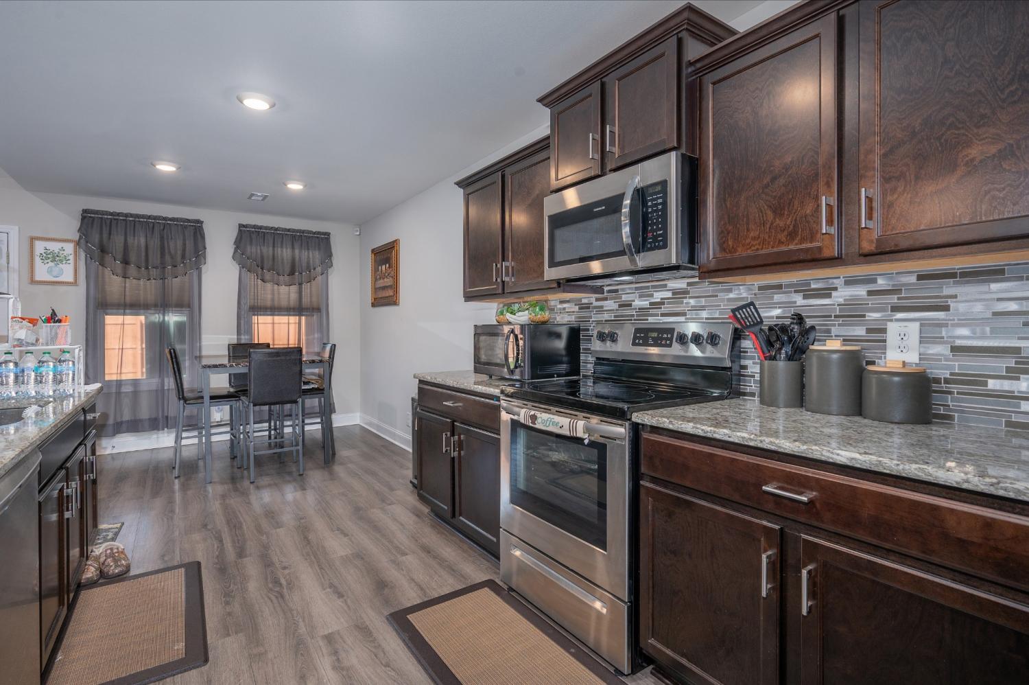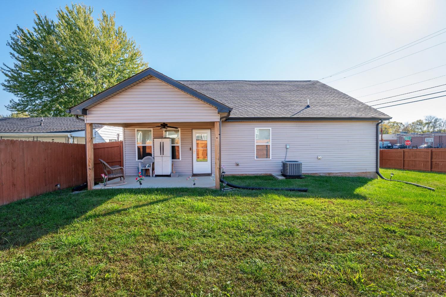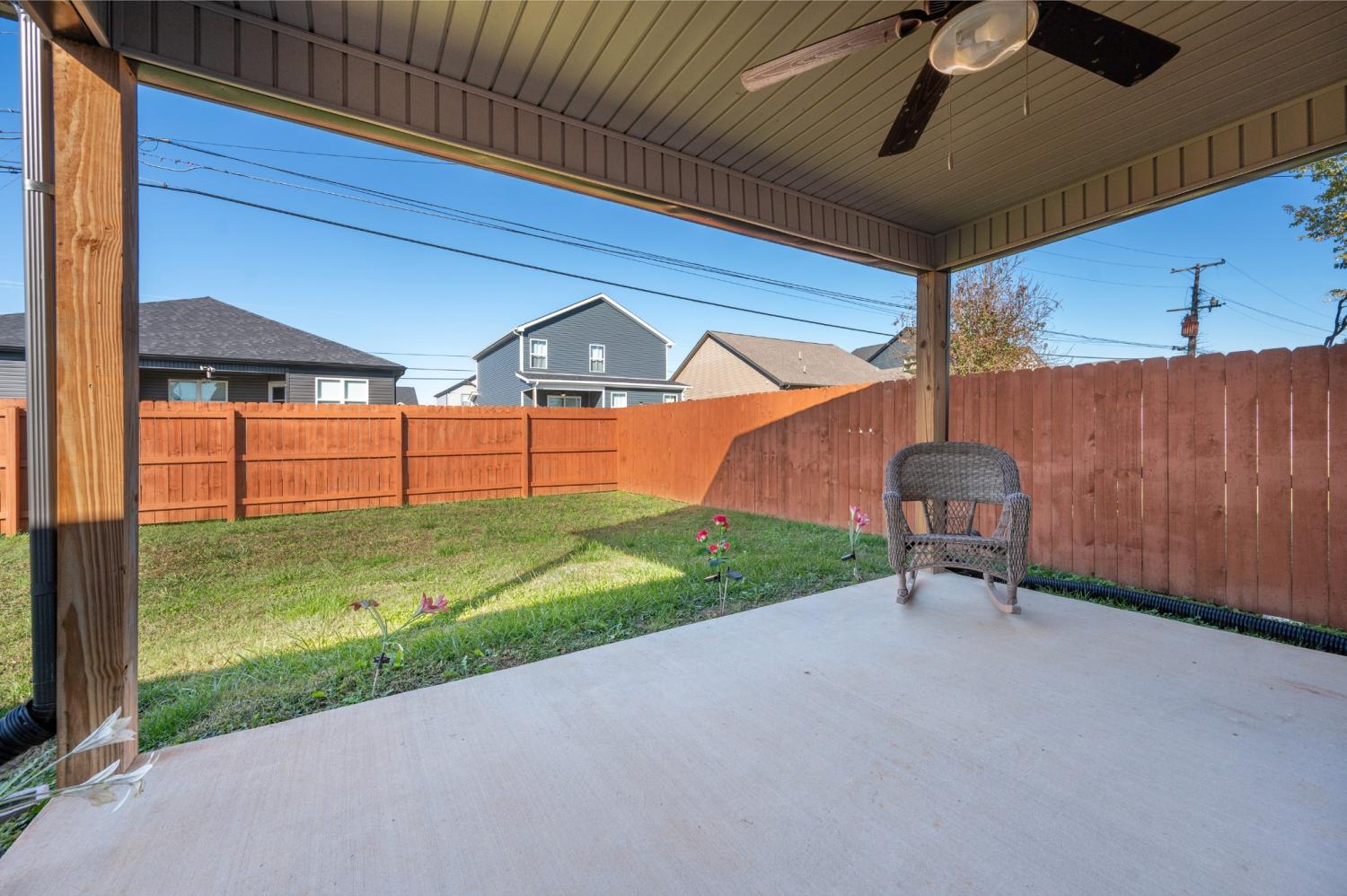 Like-new single-level home with concrete drive and 2-car front-entry garage. Welcoming covered front porch leads into an open floor plan connecting the kitchen, living, and dining areas with a high ceiling in the living room. The kitchen features granite countertops, stainless appliances, rich cabinetry, and center-island seating. The primary suite includes a spacious tile shower and double vanity. Enjoy outdoor living on the covered patio overlooking a large, privacy-fenced backyard. Near entrance for Fort Campbell!