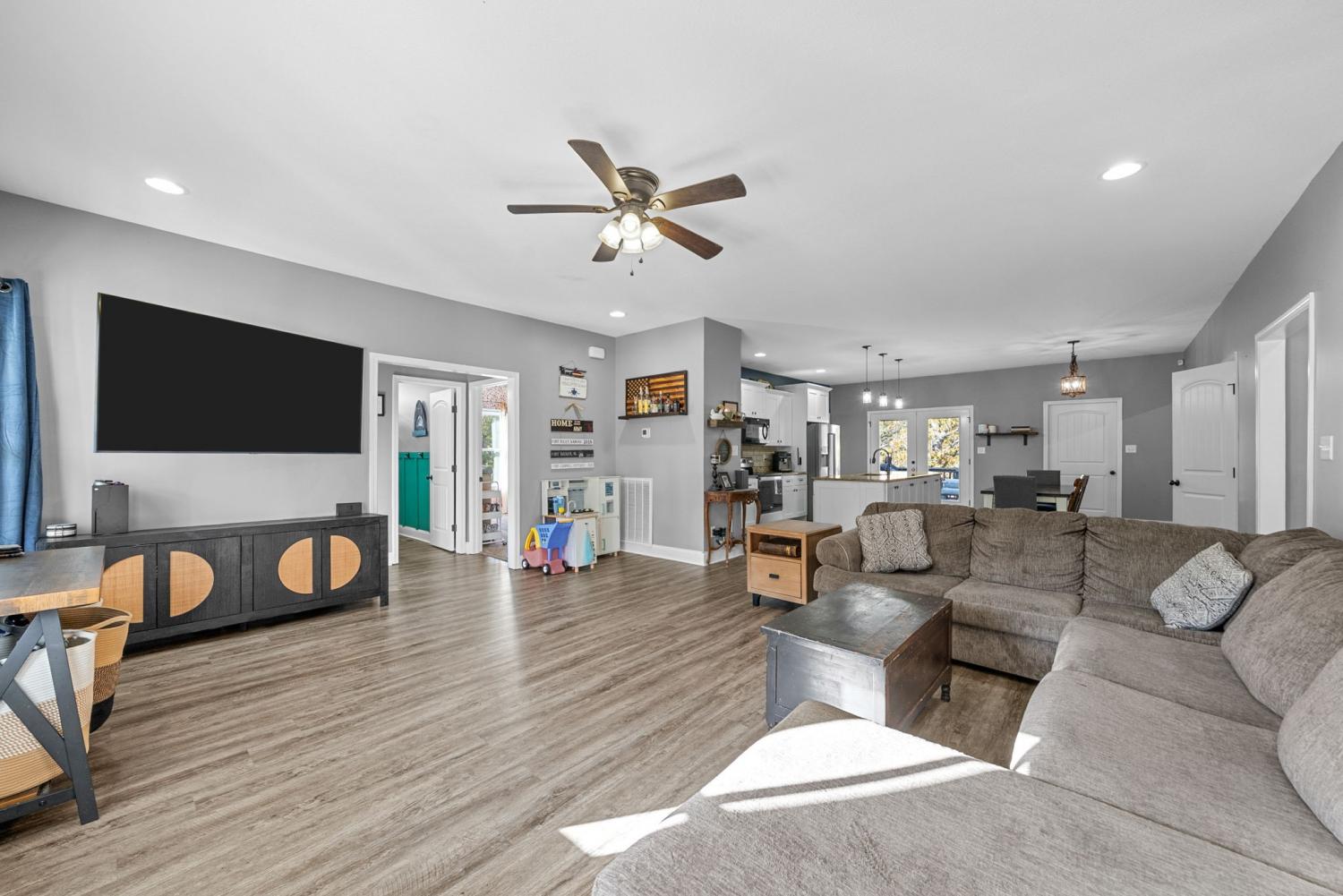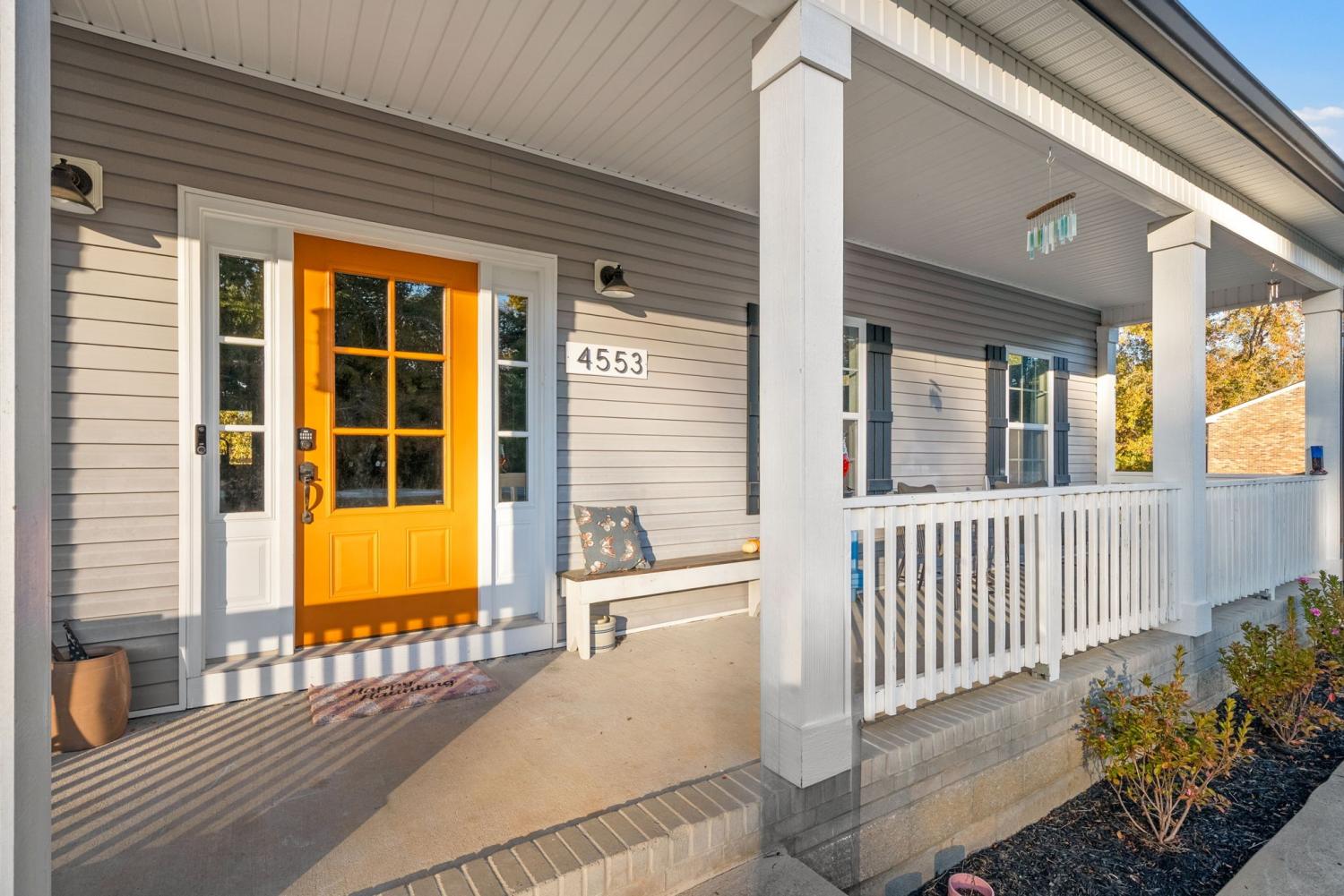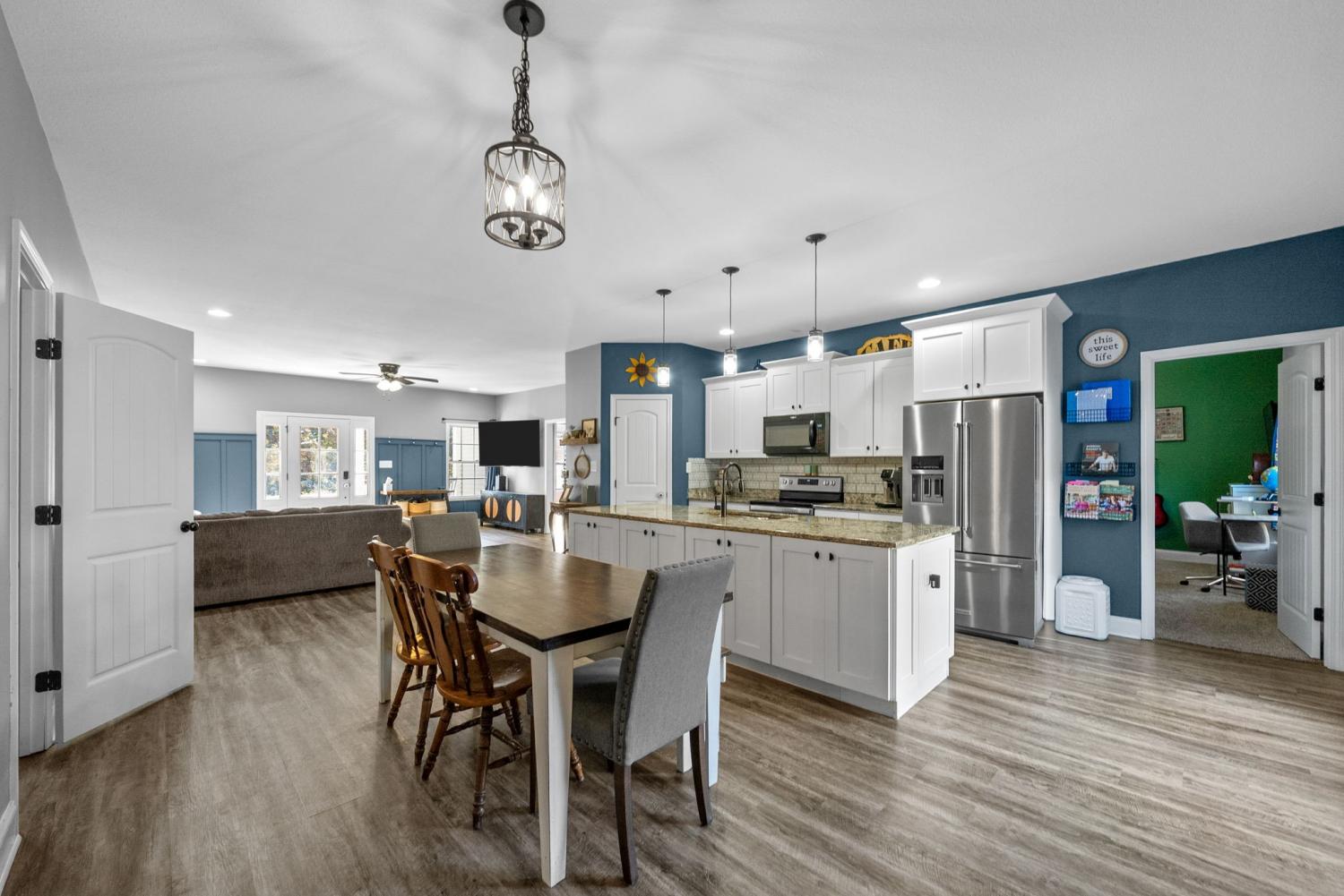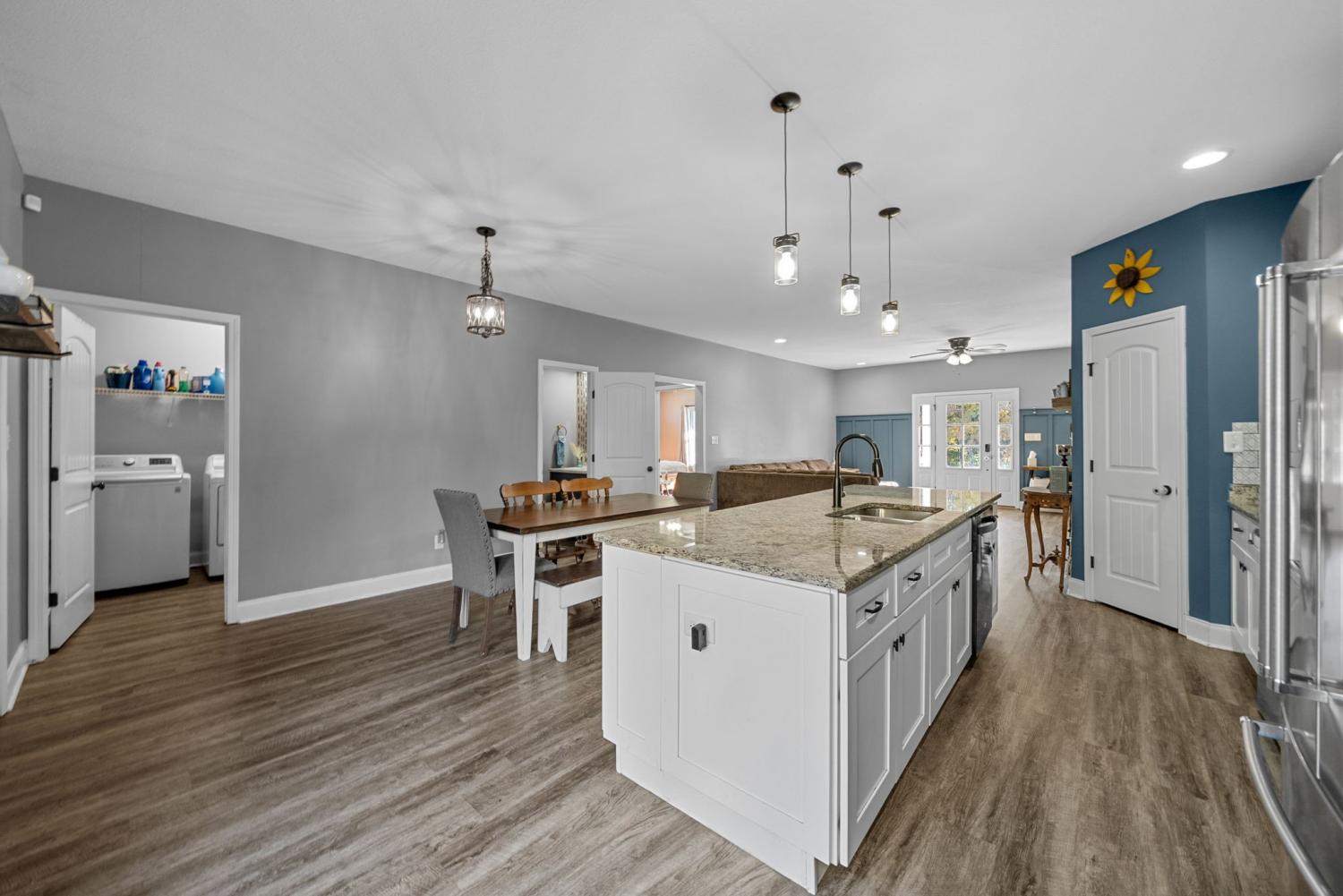 Charming four-bedroom, open concept Ranch home on just over an acre! Upon entering, the spacious living room and beautiful flooring are stand-out features. Flooring seamlessly extends into the extra-large kitchen with huge island, lots of cabinet space, eat-in area and pantry. Laundry room with extra storage space and half bathroom are conveniently located adjacent to kitchen. Super spacious primary bedroom boasts lots of natural light. Primary bathroom features separate tiled shower and large soaking tub with tile shelf. The second laundry space is located in the huge walk-in primary closet. Three additional bedrooms and hall bathroom with double vanities complete the inside of this ranch style home. Mature trees give way to a park-like setting in the back yard. Relax on the back deck and covered front porch.