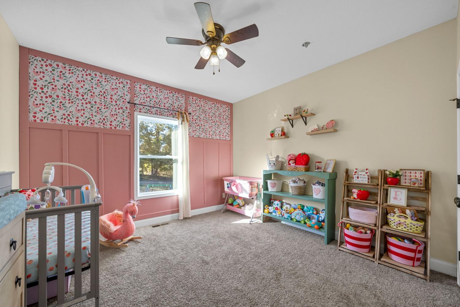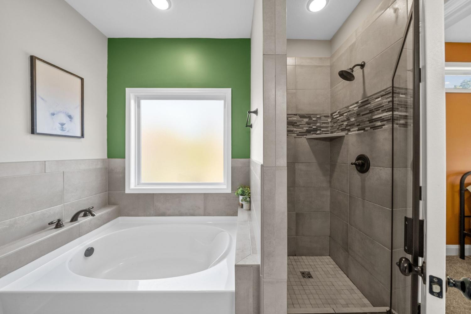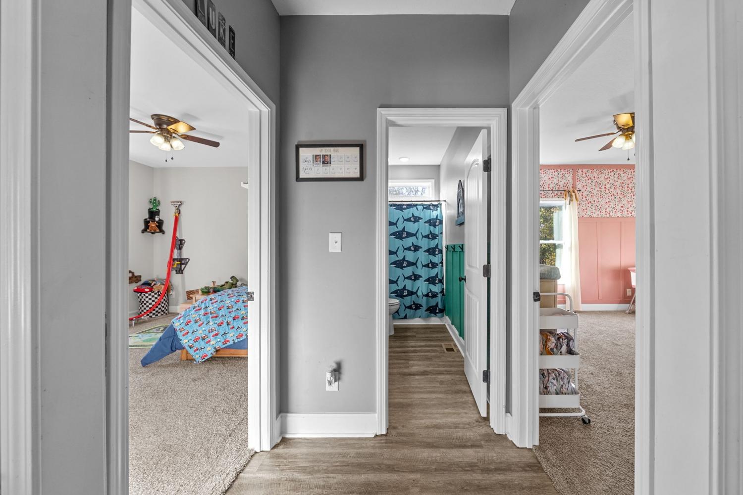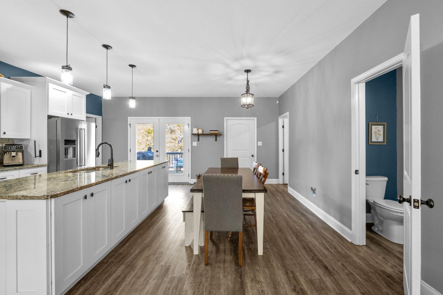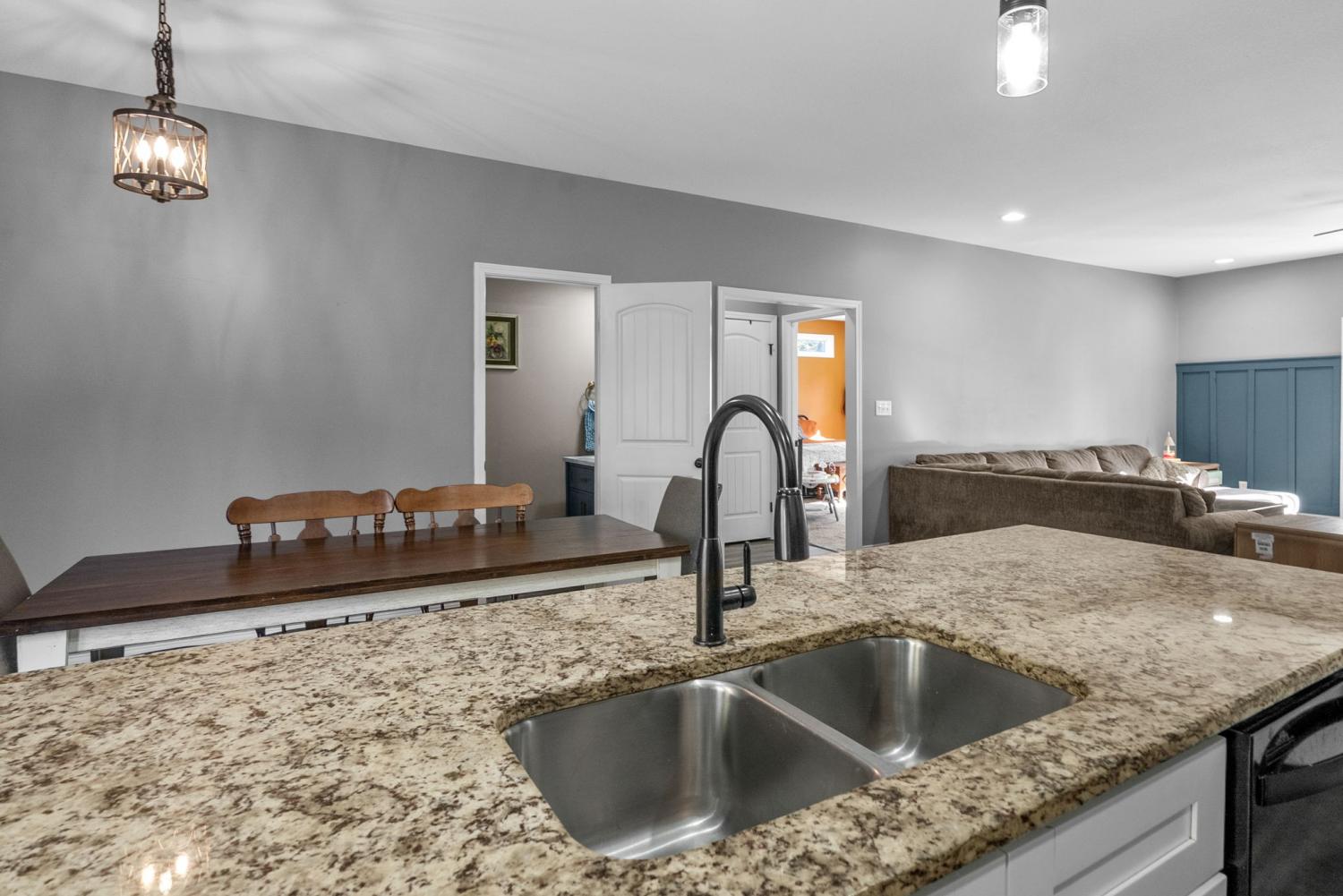 Charming four-bedroom, open concept Ranch home on just over an acre! Upon entering, the spacious living room and beautiful flooring are stand-out features. Flooring seamlessly extends into the extra-large kitchen with huge island, lots of cabinet space, eat-in area and pantry. Laundry room with extra storage space and half bathroom are conveniently located adjacent to kitchen. Super spacious primary bedroom boasts lots of natural light. Primary bathroom features separate tiled shower and large soaking tub with tile shelf. The second laundry space is located in the huge walk-in primary closet. Three additional bedrooms and hall bathroom with double vanities complete the inside of this ranch style home. Mature trees give way to a park-like setting in the back yard. Relax on the back deck and covered front porch.