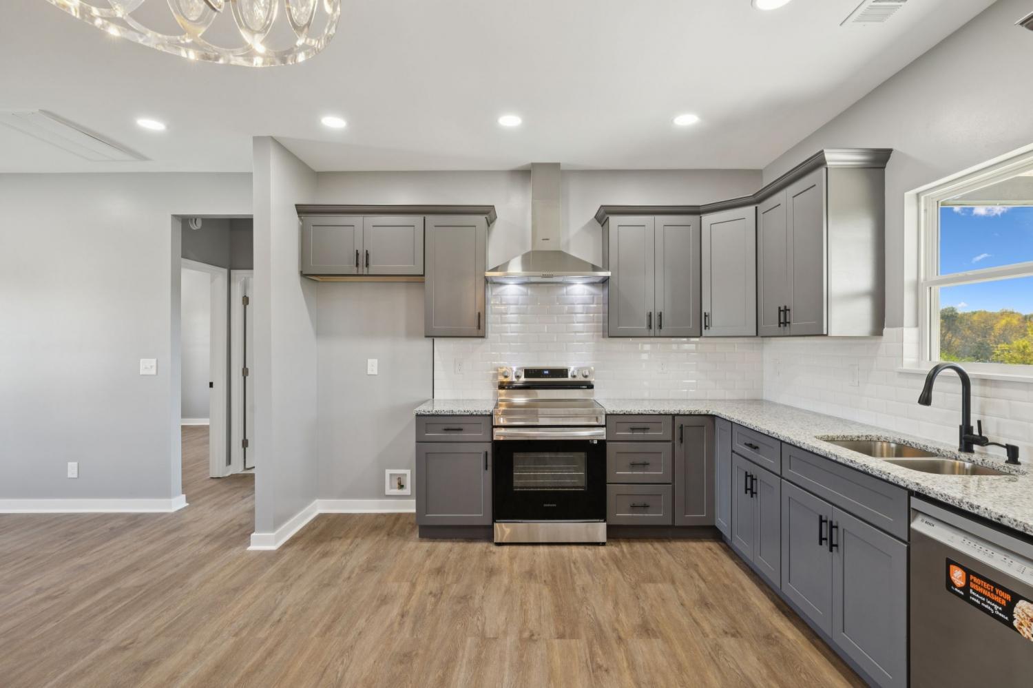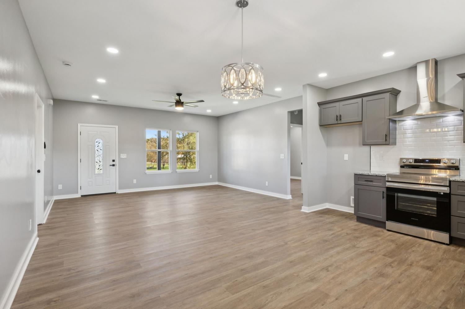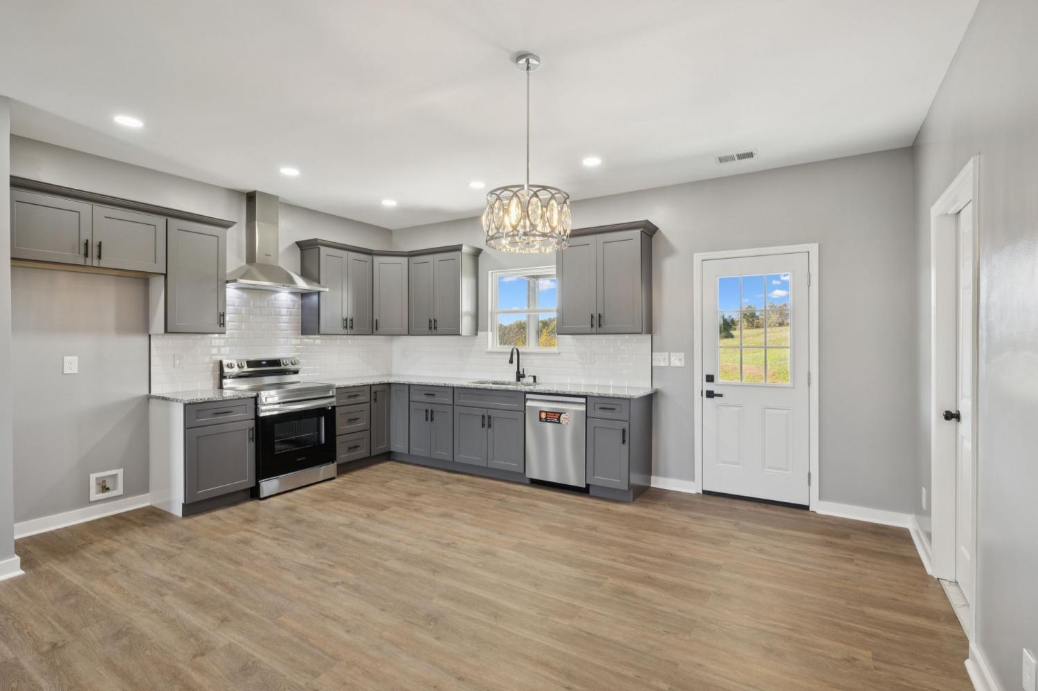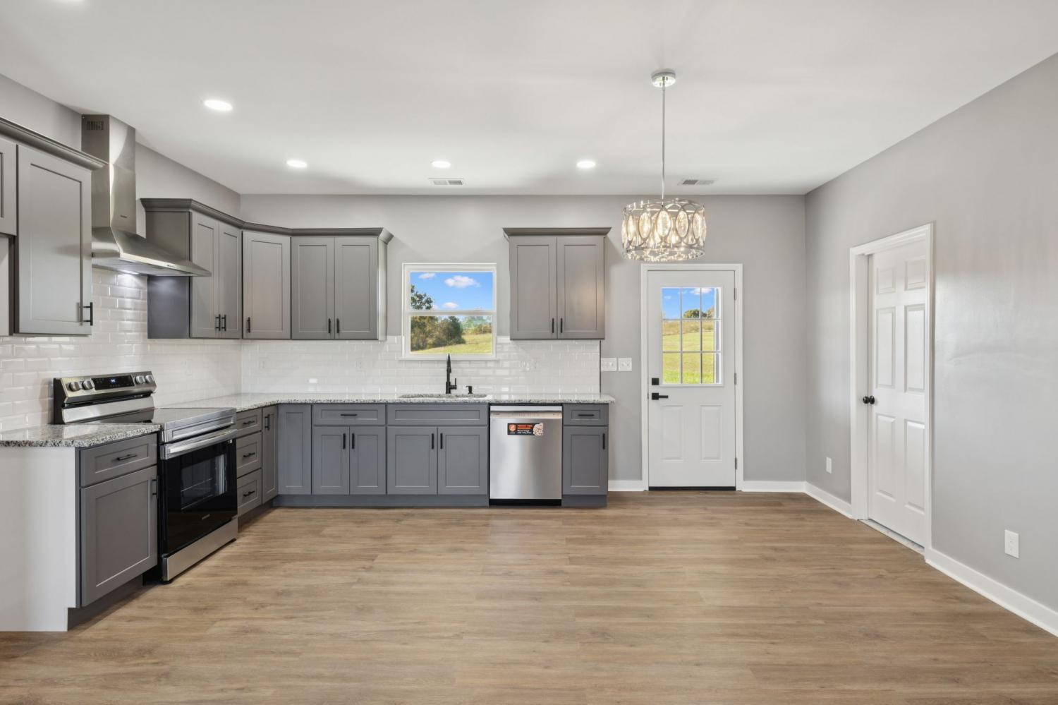 Save up to 1% of your loan amount as a closing cost credit when you use seller's suggested lender! Discover modern country living in this beautifully designed one-story home situated on over half an acre with no HOA! Featuring a split bedroom floor plan and stylish finishes throughout, this home is truly move-in ready. Step inside to an open-concept layout with a spacious living room that seamlessly flows into the dining nook and kitchen. The kitchen boasts gray soft-close cabinetry, granite countertops, a tiled backsplash, and stainless steel appliances. Enjoy low-maintenance living with vinyl flooring throughout the home and tile in all bathrooms and the laundry room—no carpet anywhere. The primary suite offers a coffered ceiling and an ensuite bathroom with double vanities, a tiled walk-in shower, and a large walk-in closet with built-in shelving. Two additional bedrooms feature generous closets with built-in shelves and share a full bathroom. Relax outdoors on the covered front porch or unwind on the covered back patio overlooking the expansive backyard and open land views. This home combines peaceful living with modern comfort—all within a short drive of Nashville.