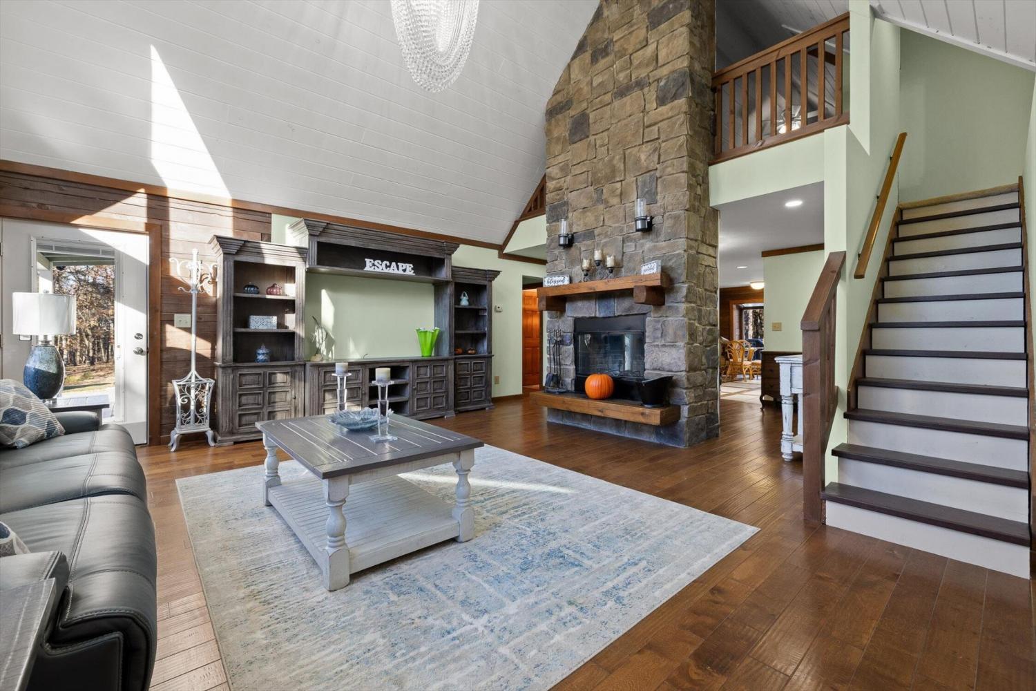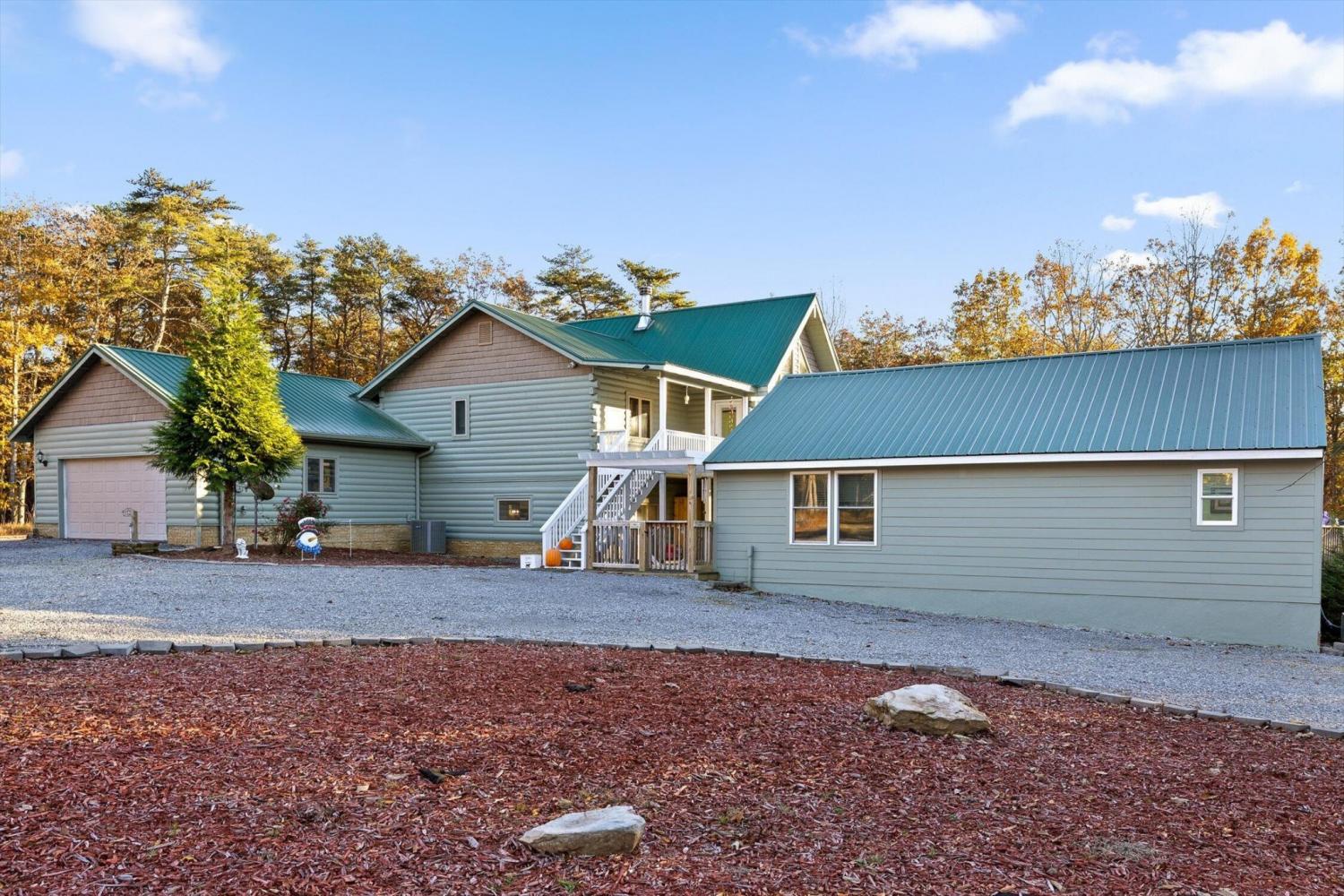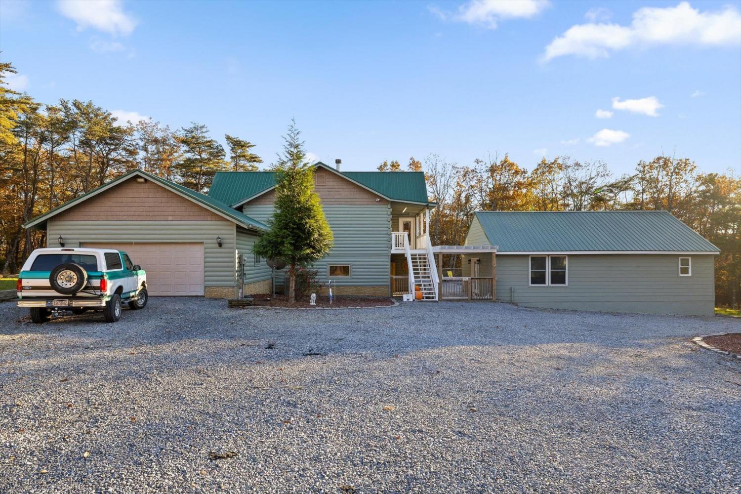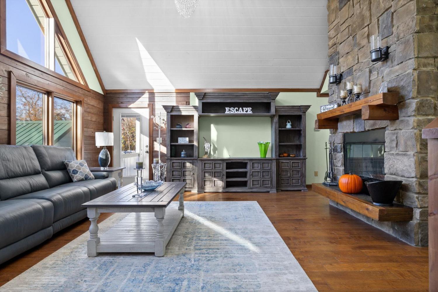 Welcome to 504 Wolf Run, a breathtaking A-frame stone and hardwood log cabin nestled in the sought-after Lookout Highlands community. Set on just under 5.5 acres, this property blends rustic craftsmanship with modern versatility—perfect for multi-family living or a beautiful residential retreat. The main home features five bedrooms and four bathrooms, showcasing warm wood finishes, vaulted ceilings, and the timeless charm of exposed beams. With three full kitchens, the layout offers incredible flexibility for hosting, extended family, or rental opportunities. Multiple expansive decks provide ideal spaces for outdoor living, while the in-ground pool, just needing a quick refresh, is ready to shine again. A separate guest house or living space adds even more value, offering privacy for visitors or potential income. Located within Lookout Highlands, residents enjoy a peaceful, gated mountain community with access to lakes for fishing and kayaking, scenic hiking trails leading to waterfalls, and a community pavilion for gatherings and events—all surrounded by natural beauty and modern conveniences like high-speed fiber internet. With its timeless log cabin design, flexible living spaces, and access to some of the area's most stunning scenery, 504 Wolf Run is more than a home—it's a lifestyle of comfort, connection, and mountain elegance.
