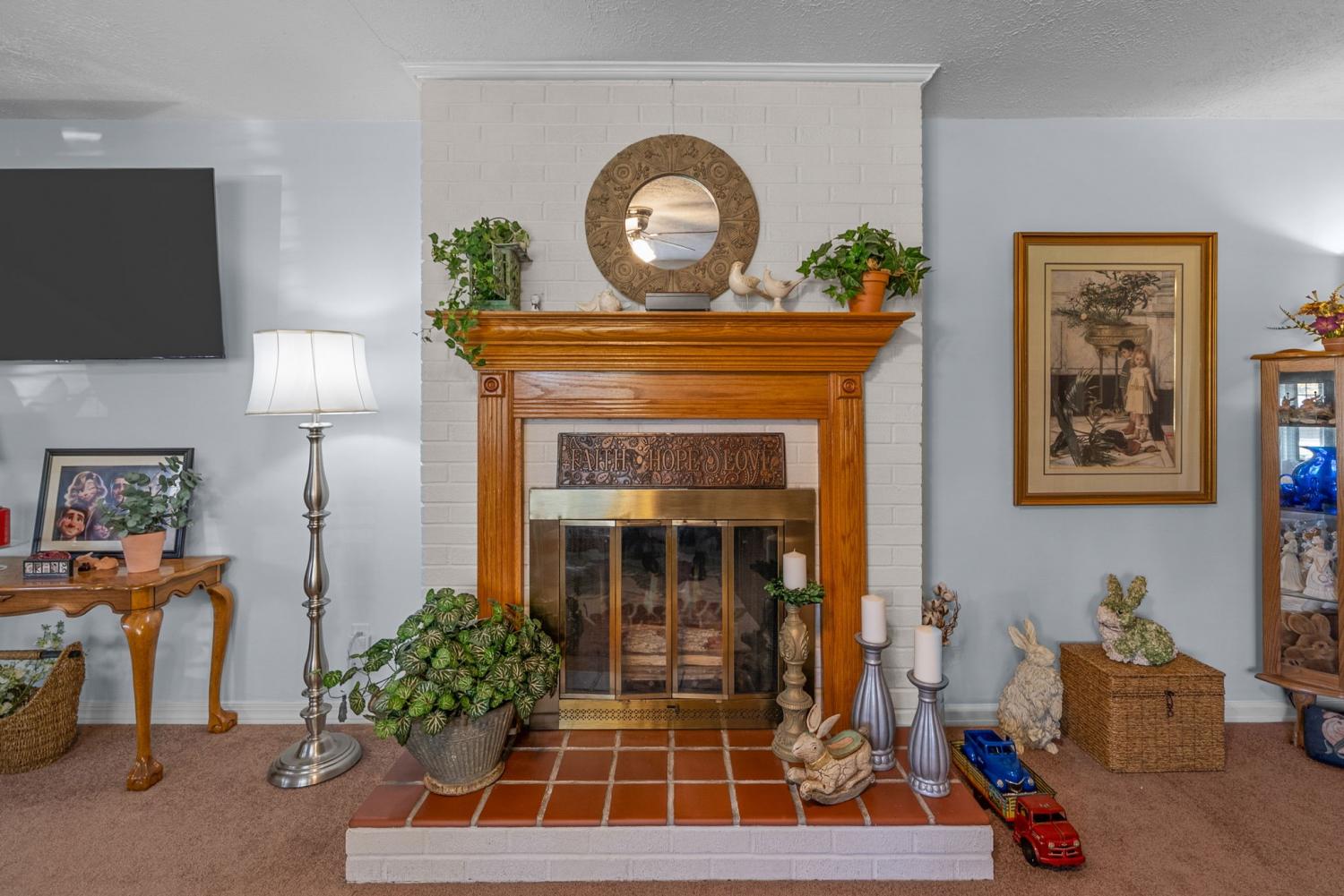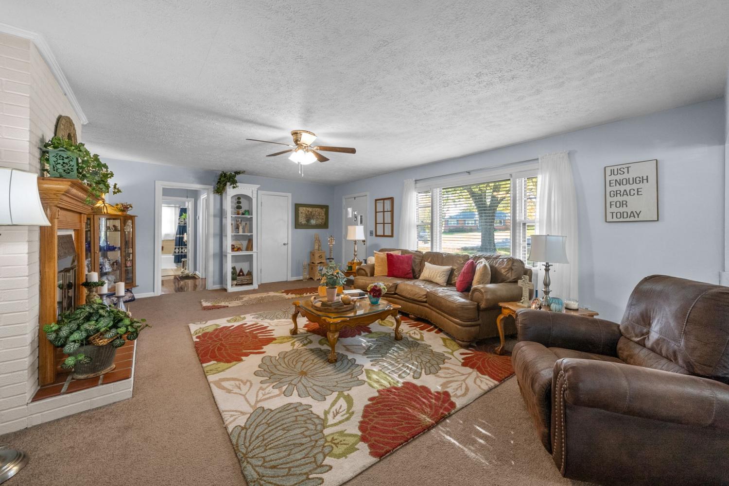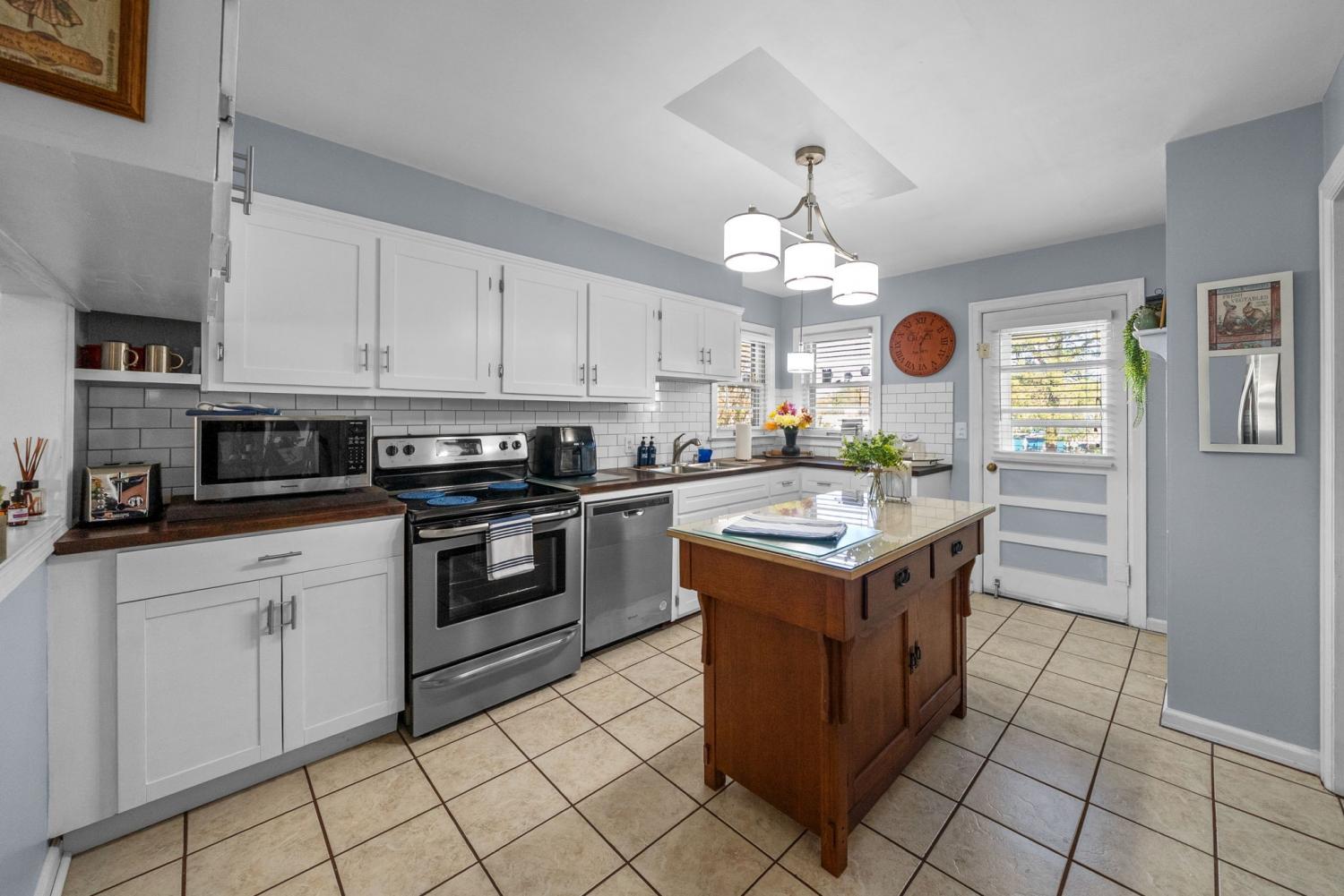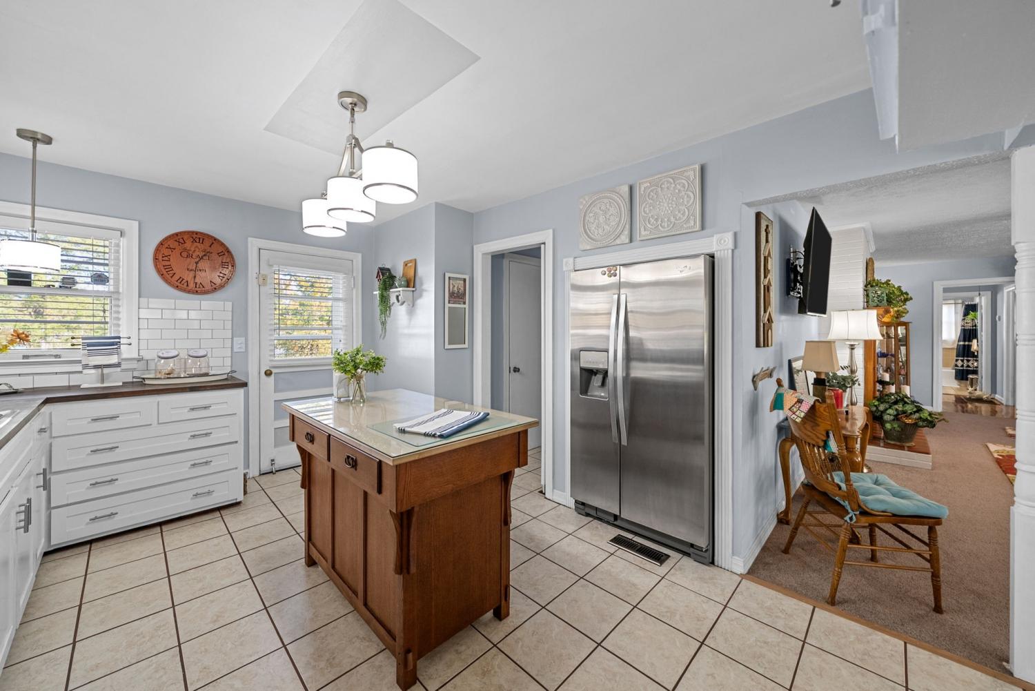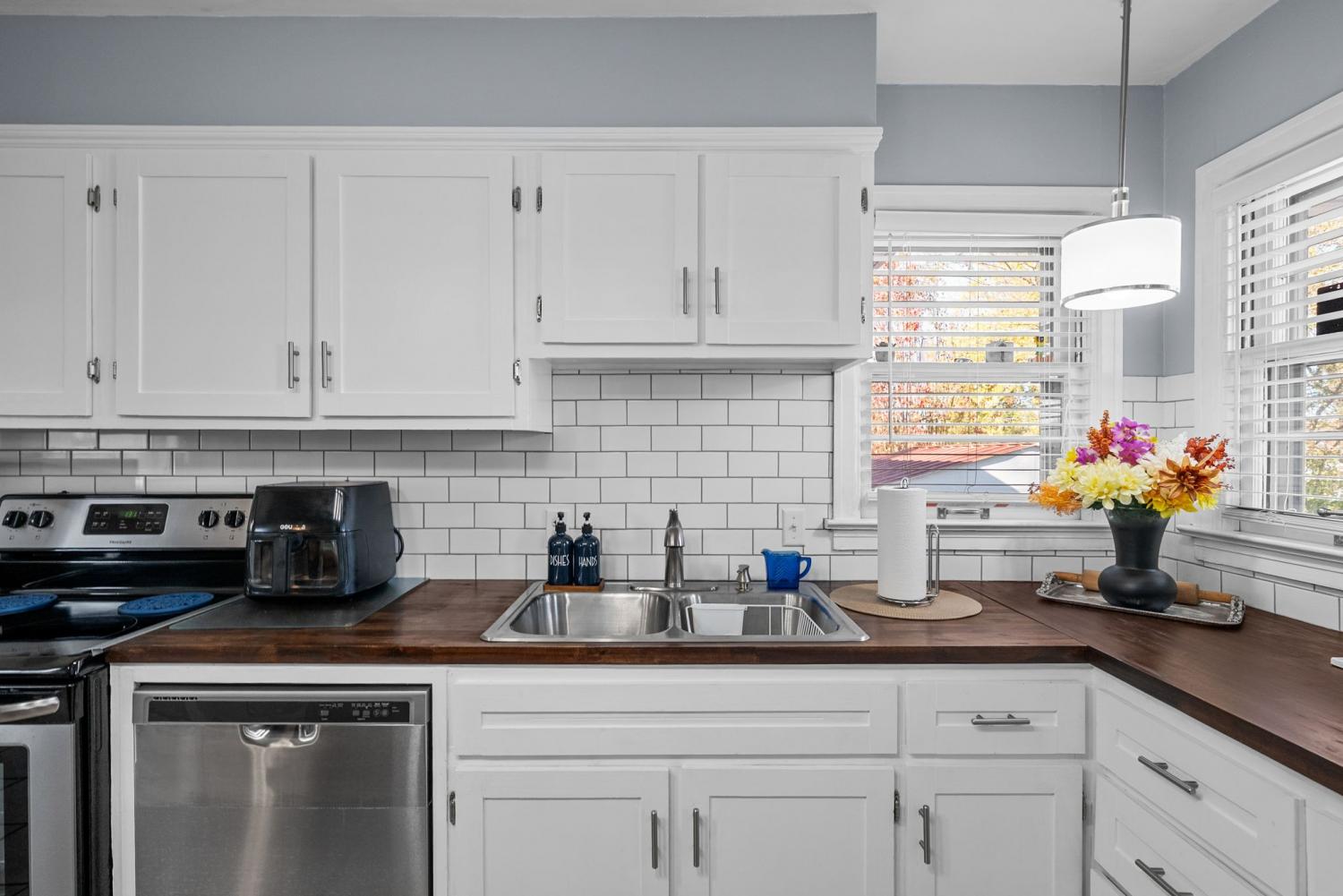 This beautifully maintained 3-bedroom, 1-bath brick home offers a functional layout and plenty of character. Enjoy cozy evenings by the fireplace and cook with style in the kitchen featuring wood countertops and classic subway tile. The home includes a mix of hardwood and tile flooring throughout. Step outside to a spacious deck perfect for entertaining, plus a storage building for extra space. Additional highlights include a concrete driveway and a convenient garage. Move-in ready and full of charm!