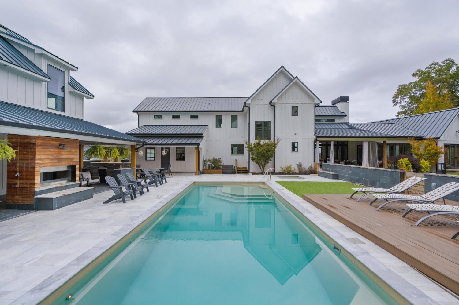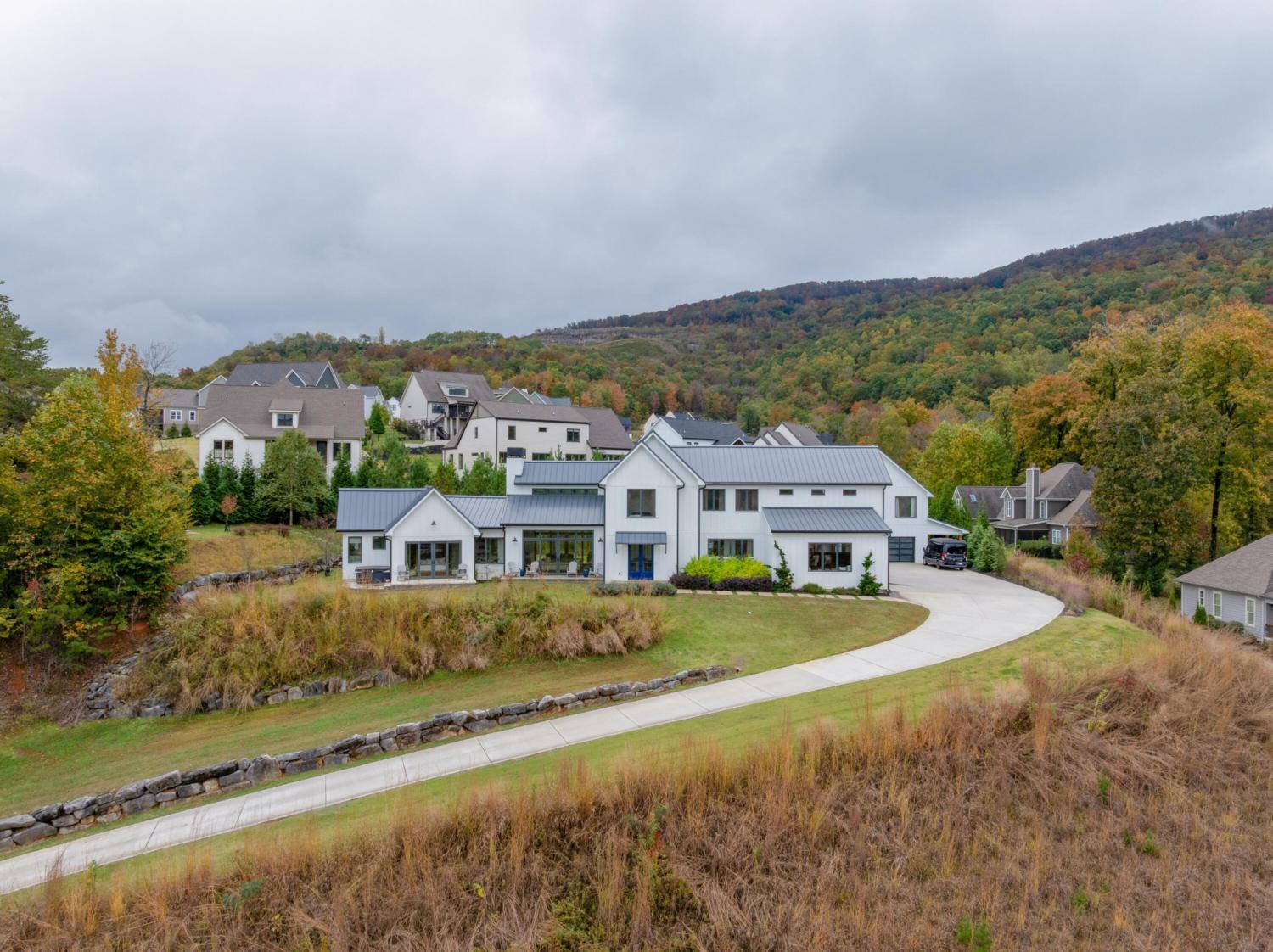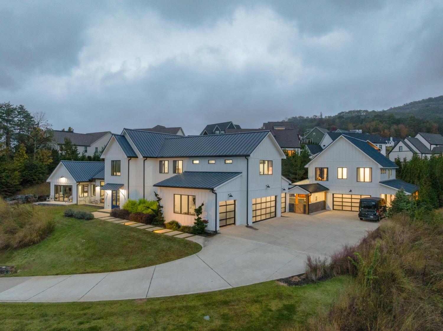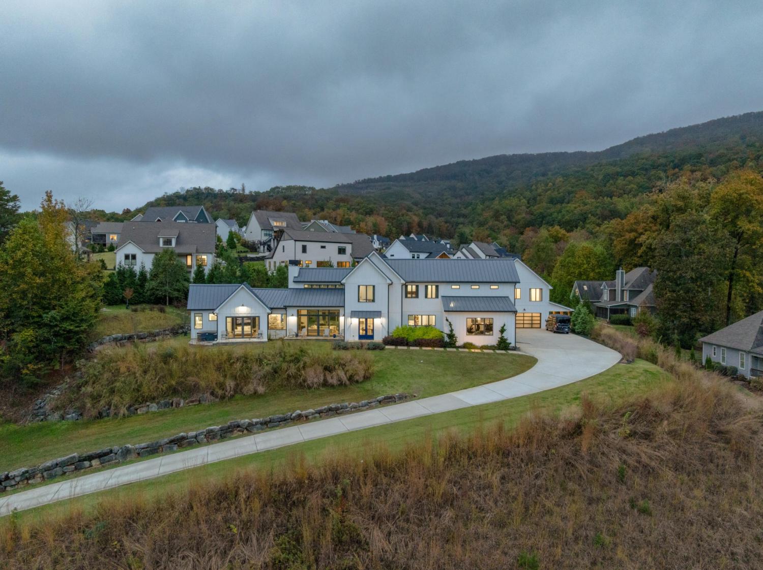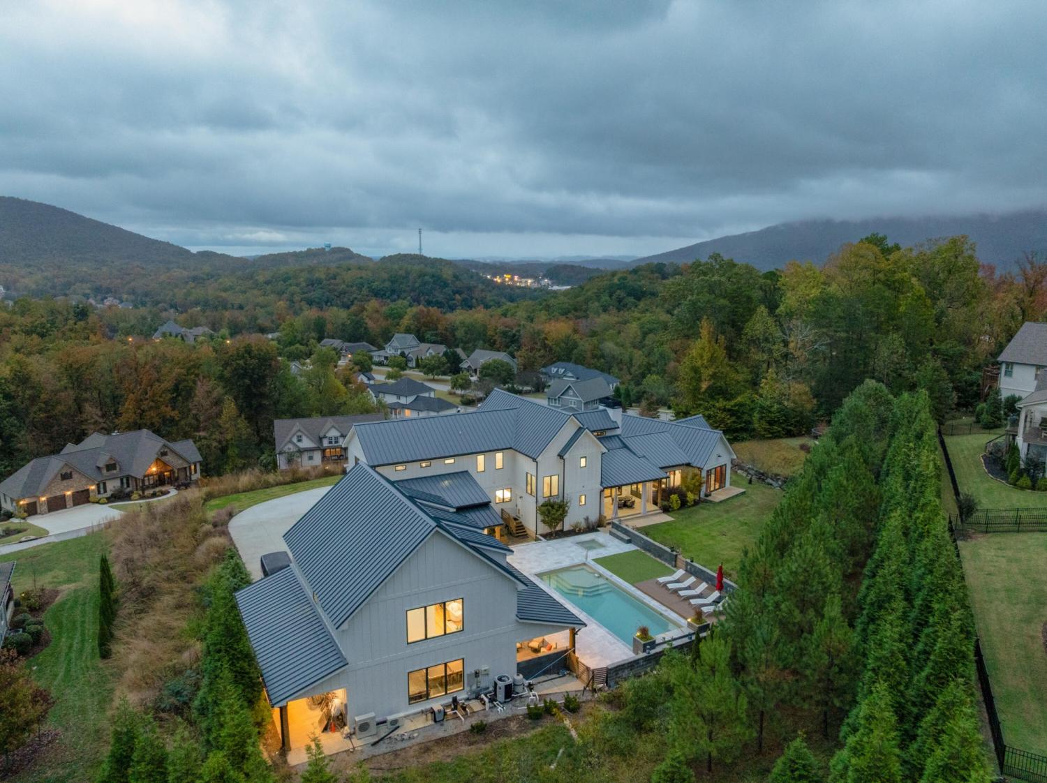 Truly spectacular modern farmhouse strategically positioned on a 1.76 +/- acre hilltop lot with a heated pool, guest house and stunning mountain views in the desirable Black Creek golf course community approximately 15 minutes to downtown Chattanooga. This well-designed home is loaded with amenities and fantastic outdoor living spaces and is truly meant for gathering and entertaining. The property features a 5 or 6 bedroom, 4.5 bath, 4,700 +/- sf main house with a 4-car garage, as well as a pool house with a rec room, kitchenette, double garage and a full pool bath on the main level, and a 2 bedroom, 1 bath guest apartment on the upper level, all connected via amazing outdoor living spaces. All of the garage doors are glass and provide both a modern look and great natural lighting atypical to most garages which allows for additional uses such as home gym in the pool house garage. As soon as you enter the main house, you will immediately note the wonderfully open living areas, including the kitchen, dining and great room, as well as the hardwood floors, shiplap accents walls and ceilings, and the oversized glass doors and windows with the colorful autumn views. The kitchen boasts a large center island with pendant lighting and an extra prep sink, custom cabinetry, stainless appliances, including 2 dishwashers, an under-counter microwave, an oversized built in refrigerator, and a Thor gas range with double ovens and convenient pot-filler. It also has a great workspace and a refreshment center with a sink, Bosch coffee maker and a beverage fridge with access to the mudroom/laundry with a pantry and access to the garage - perfect for loading and unloading. The center dining area has access to the powder room, staircase and a closet with access to a special room under the steps that leads to an exterior door which the sellers have utilized for their pets.