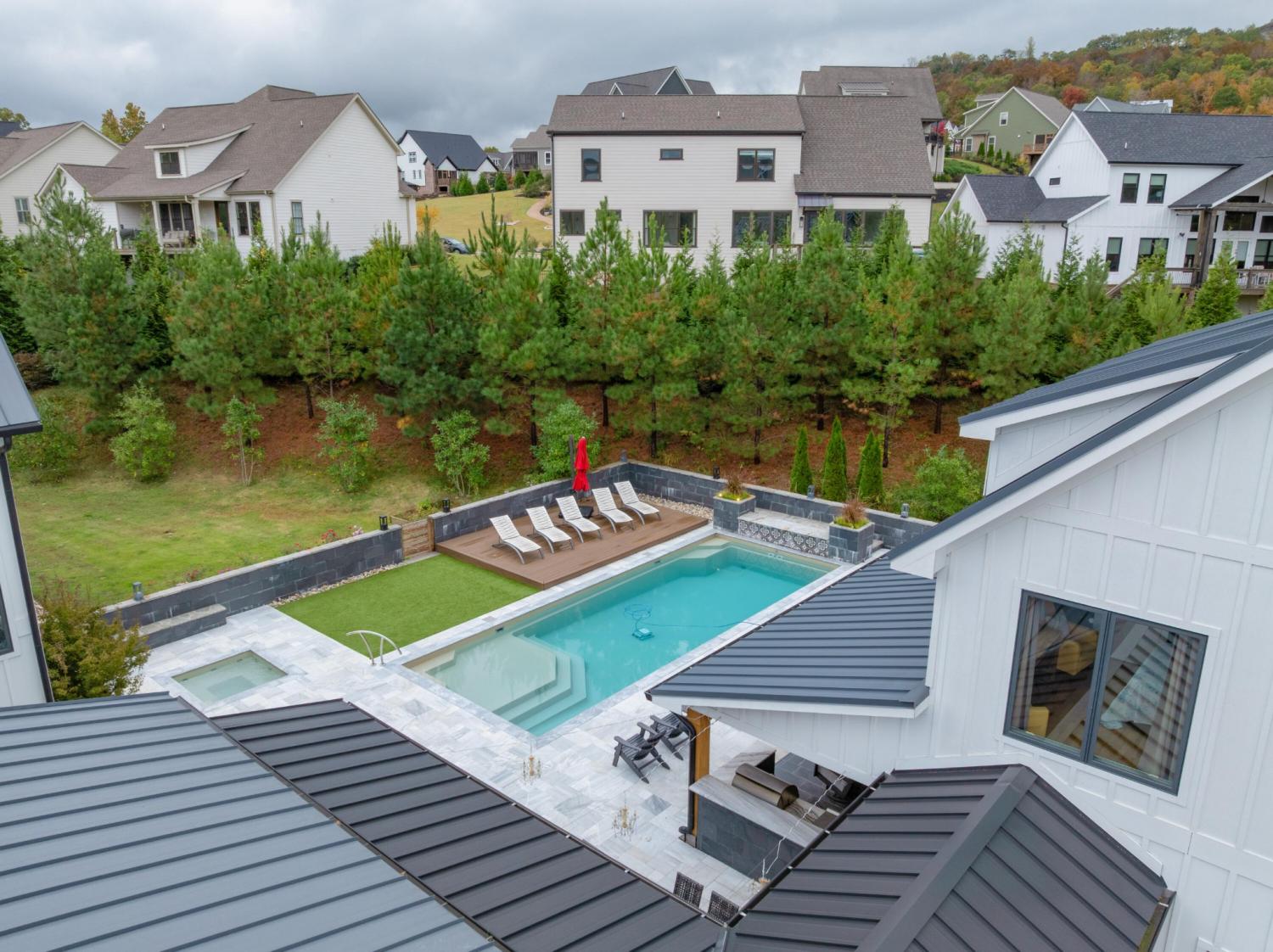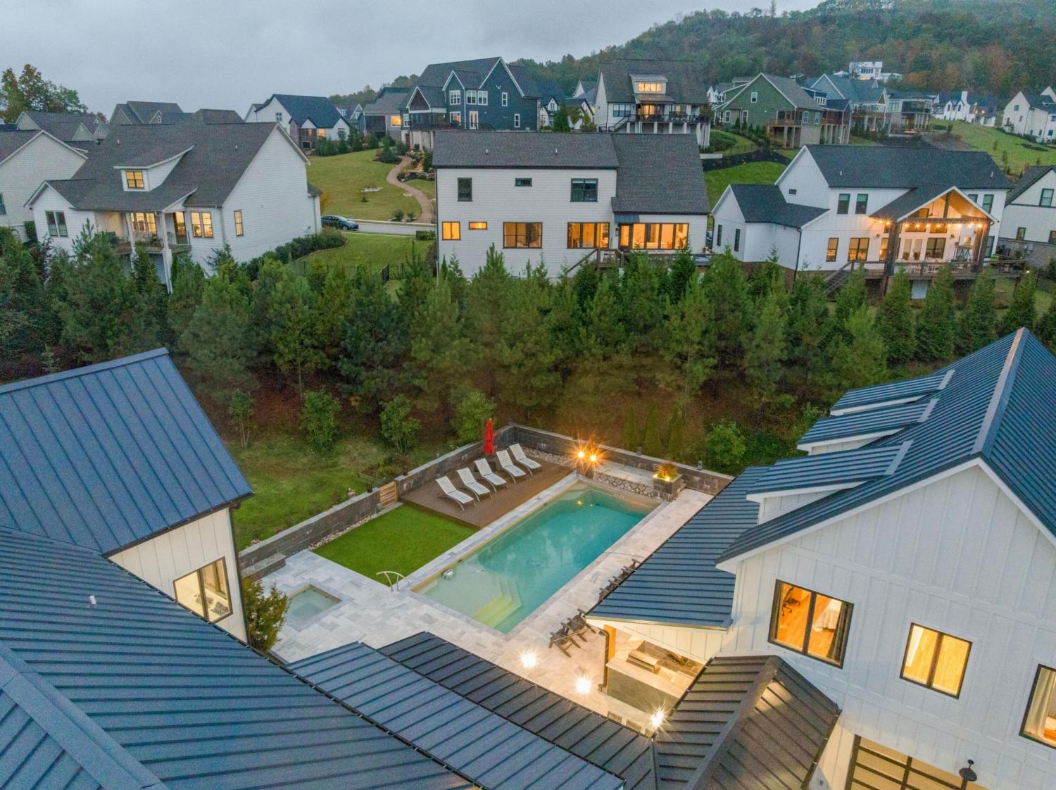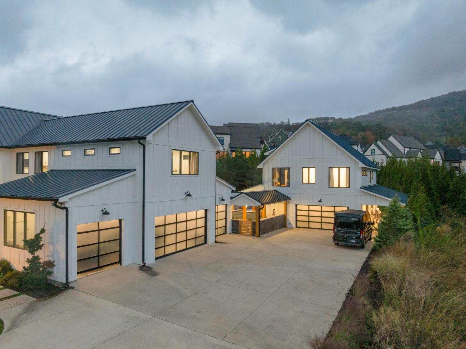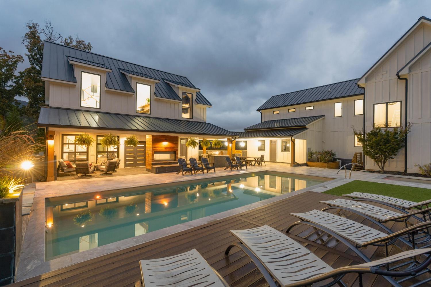 Truly spectacular modern farmhouse strategically positioned on a 1.76 +/- acre hilltop lot with a heated pool, guest house and stunning mountain views in the desirable Black Creek golf course community approximately 15 minutes to downtown Chattanooga. This well-designed home is loaded with amenities and fantastic outdoor living spaces and is truly meant for gathering and entertaining. The property features a 5 or 6 bedroom, 4.5 bath, 4,700 +/- sf main house with a 4-car garage, as well as a pool house with a rec room, kitchenette, double garage and a full pool bath on the main level, and a 2 bedroom, 1 bath guest apartment on the upper level, all connected via amazing outdoor living spaces. All of the garage doors are glass and provide both a modern look and great natural lighting atypical to most garages which allows for additional uses such as home gym in the pool house garage. As soon as you enter the main house, you will immediately note the wonderfully open living areas, including the kitchen, dining and great room, as well as the hardwood floors, shiplap accents walls and ceilings, and the oversized glass doors and windows with the colorful autumn views. The kitchen boasts a large center island with pendant lighting and an extra prep sink, custom cabinetry, stainless appliances, including 2 dishwashers, an under-counter microwave, an oversized built in refrigerator, and a Thor gas range with double ovens and convenient pot-filler. It also has a great workspace and a refreshment center with a sink, Bosch coffee maker and a beverage fridge with access to the mudroom/laundry with a pantry and access to the garage - perfect for loading and unloading. The center dining area has access to the powder room, staircase and a closet with access to a special room under the steps that leads to an exterior door which the sellers have utilized for their pets.