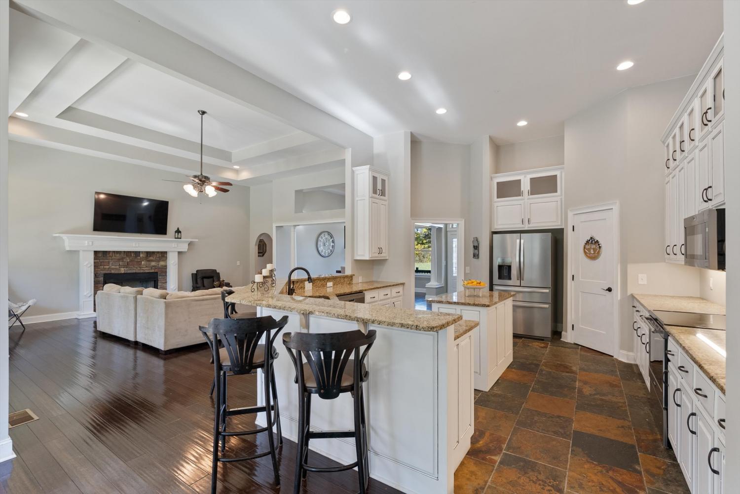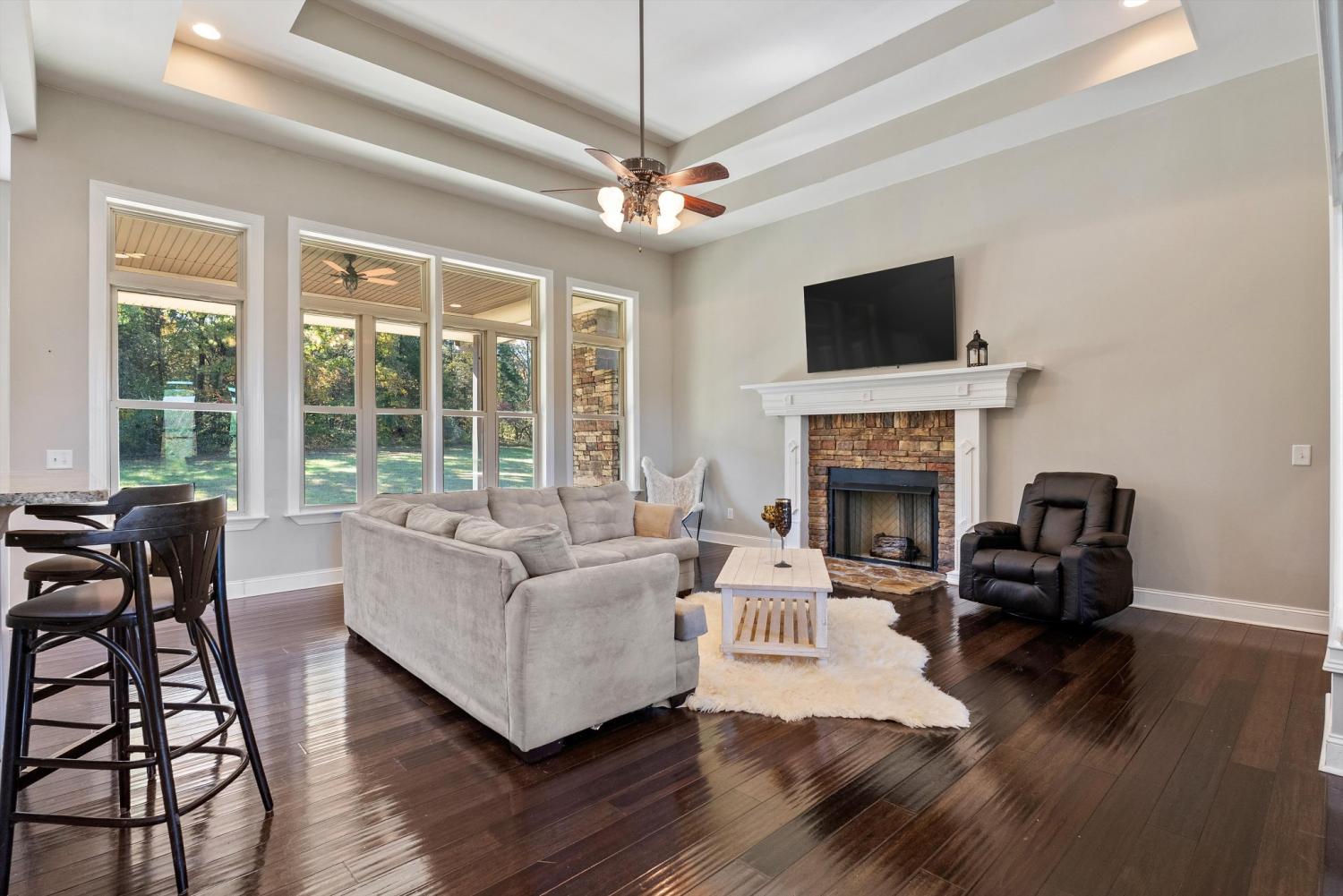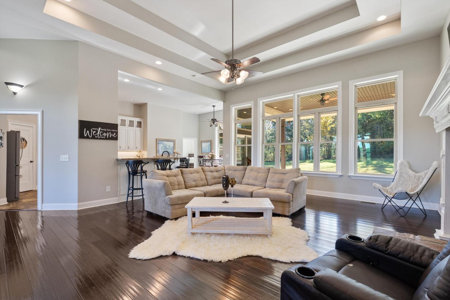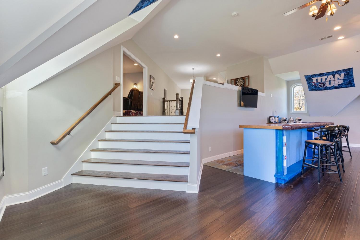 Welcome to 472 Parker Rd - The ultimate private retreat in Portland TN! Located at the true halfway point between Nashville and Bowling Green Kentucky, this luxurious gem sits on 5 pristine acres surrounded by mature trees and wide open green space. An additional 12-15 acres is also available for purchase, expanding the possibilities even further. Reach out for details on the additional acreage. Inside, the main floor delivers pristine luxury with an open living and kitchen layout ideal for everyday comfort and entertaining. Tall ceilings and a stunning stone fireplace anchor the living space, while massive windows flood the home with natural light. Standing in the kitchen, you get a sweeping view of the property, and it genuinely feels like the serenity of the outdoors flows right inside. The primary suite brings spa-level relaxation with dual sinks, a huge walk-in shower, and a jetted soaking tub. It also includes direct access to the back patio, giving you a private place to step out and unwind. Two additional main-floor bedrooms add convenience and flexibility. Hardwood floors run throughout these rooms, and every bedroom includes a ceiling fan. Upstairs, you step into a full entertainment zone with a full bar, shuffleboard, a pool table, and a dedicated movie theatre room. Furniture comes with the home if you'd like, and sports memorabilia are negotiable, making this a phenomenal turnkey setup. The outdoor potential is one of the biggest highlights. With 5 acres and the option to make it around 20 acres total, this property offers room for a future pool, horses, or a full garden setup. There is plenty of space to build out raised beds, plant fruit trees, or create your own small farm. A cleared walking trail is already in place for peaceful exploring. The back patio includes a large stone fireplace and overlooks the tranquil landscape. This home is the perfect blend of privacy, comfort, and luxury. You need to see this one in person to truly appreciate it!