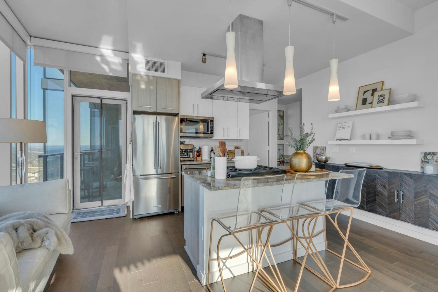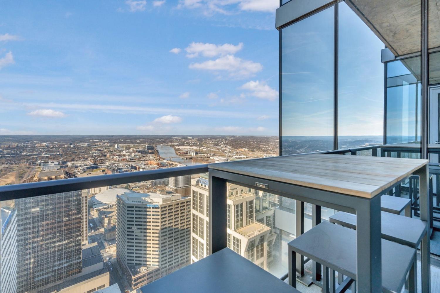 Wake up to skyline views and wind down with unforgettable sunsets in this stylish high-rise corner condo in the heart of downtown Nashville. Floor-to-ceiling windows and a private balcony bring the city to you — from the twinkle of Broadway lights to the fireworks at First Tennessee Park to the quiet beauty of the Cumberland at dusk. Designed for easy, elevated living, this home offers open spaces, modern finishes, and a seamless flow from kitchen to living to balcony. Enjoy the full Nashville lifestyle with on-site amenities that make every day feel like a staycation — a resort-style pool with cabanas, state of the art fitness center, tennis and pickleball courts, a catering kitchen, and chic social lounges perfect for entertaining friends before a night out. Step outside and you’re moments from The Ryman, Bridgestone Arena, Nashville Yards, The Pinnacle, First TN Park, and 5th & Broad — where music, dining, and entertainment are at your doorstep. Your private underground “rockstar” parking space (with EV charger) adds convenience, with optional storage and valet parking available. Where vibrant skyline views meet the magic of Nashville — this is downtown living at its best.
