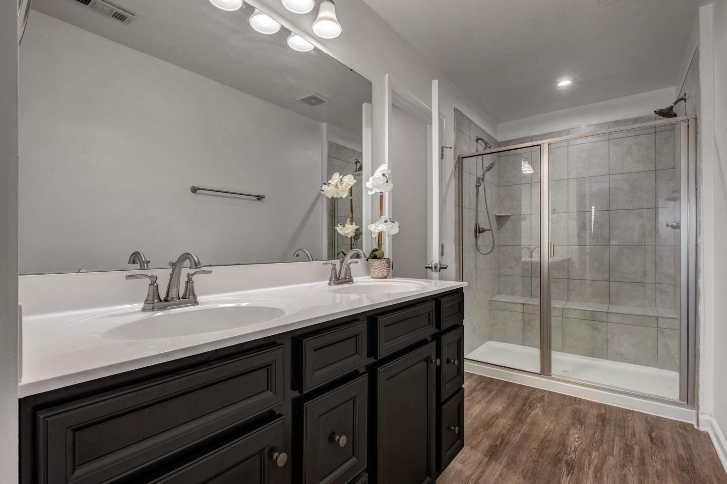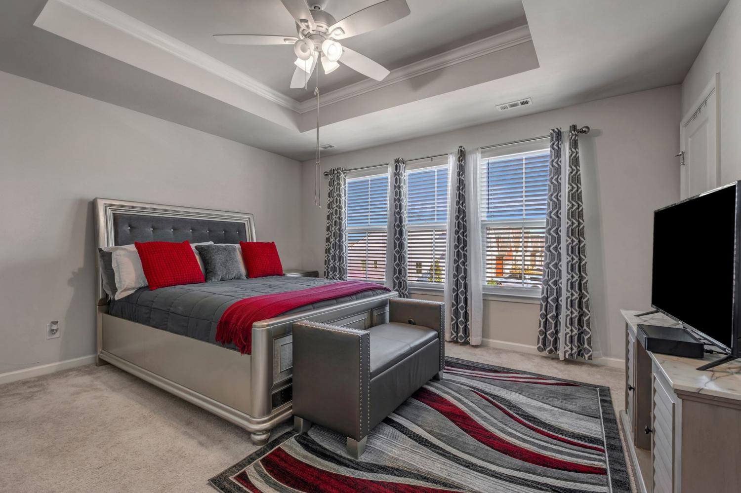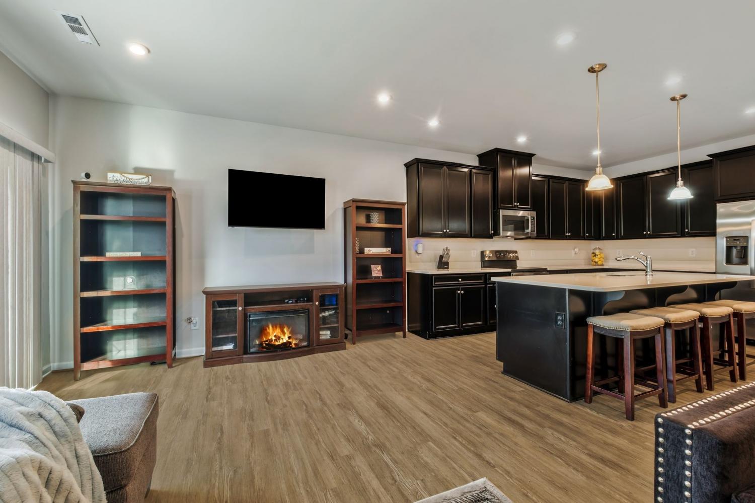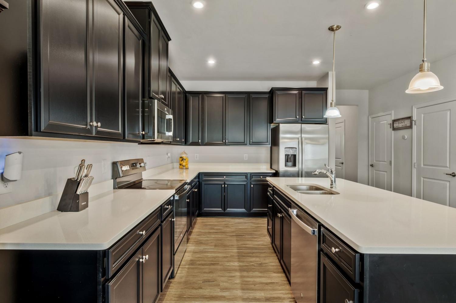 Gorgeous Roxbury floor plan featuring a 6-ft patio extension and a private backdrop of mature trees. This spacious home offers 3 bedrooms, 2.5 bathrooms, and a 1-car attached garage. The open-concept layout includes hard-surface flooring throughout and an exceptional kitchen with 42-inch black cabinets, a large island, stainless steel appliances, and quartz . countertops. The owner’s suite showcases a tray ceiling, double vanity, a dual-head Roman tile shower with bench, and separate walk-in closets. Secondary bedrooms are generously sized and also feature walk-in closets. Also take advantage of this home’s assumable interest rate.