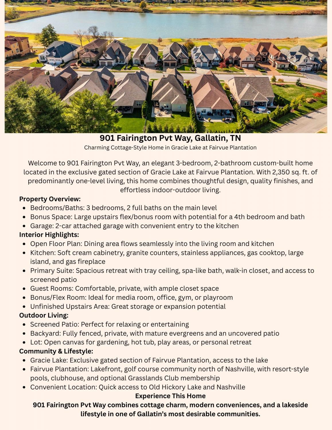Welcome to Gracie Lake, an exclusive gated section within the sought-after Fairvue Plantation — a premier lakefront and golf course community on Old Hickory Lake just north of Nashville, TN. This custom-built home offers 2,350 square feet of predominantly one-level living with timeless craftsmanship, elegant finishes, and a thoughtful floor plan designed for both comfort and entertaining. The main level features all three bedrooms and both full baths, along with your main living spaces. A designated dining area sits at the front of the home and flows seamlessly into the open living room and kitchen. The kitchen is a true centerpiece with soft cream cabinetry, stainless steel appliances including a gas cooktop, granite countertops, and a large island perfect for prep, serving, or casual dining. A cozy gas fireplace adds warmth and charm, while easy access to the outdoor living spaces makes it perfect for gatherings or quiet evenings at home. The private primary suite is tucked away at the back of the home and offers access to the screened patio — the perfect spot for morning coffee or evening relaxation. The spa-like bath features double sinks, a soaking tub, separate shower, and a spacious walk-in closet. Two additional bedrooms are thoughtfully positioned on each side of the guest bath, offering comfort and privacy for family or guests. Upstairs, a large bonus/flex room offers endless possibilities — a media room, office, playroom, or fitness space. Need more room? There’s an unfinished area that’s ideal for storage or future expansion, with potential for a fourth bedroom and third bath. Living in Gracie Lake offers the perfect balance of privacy and community. Residents can choose whether to join the The Grasslands Club at Fairvue, offering flexibility to enjoy the golf course, pools, clubhouse dining, fitness center, and more. Nestled along the shores of Old Hickory Lake, this home captures the best of lakeside living, and convenience in one perfect setting.