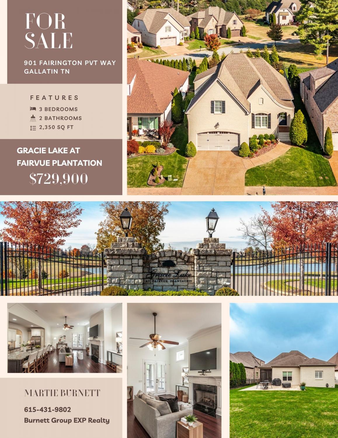 Take I-65 N to TN 386 To Exit 9 . Merge onto 31E for 3.4 miles turn right onto Plantation Blvd. for 1.1 miles. At the stop sign turn left onto Browns Lane, then turn left on Fairington Way to gated entrance. Home will be on the right