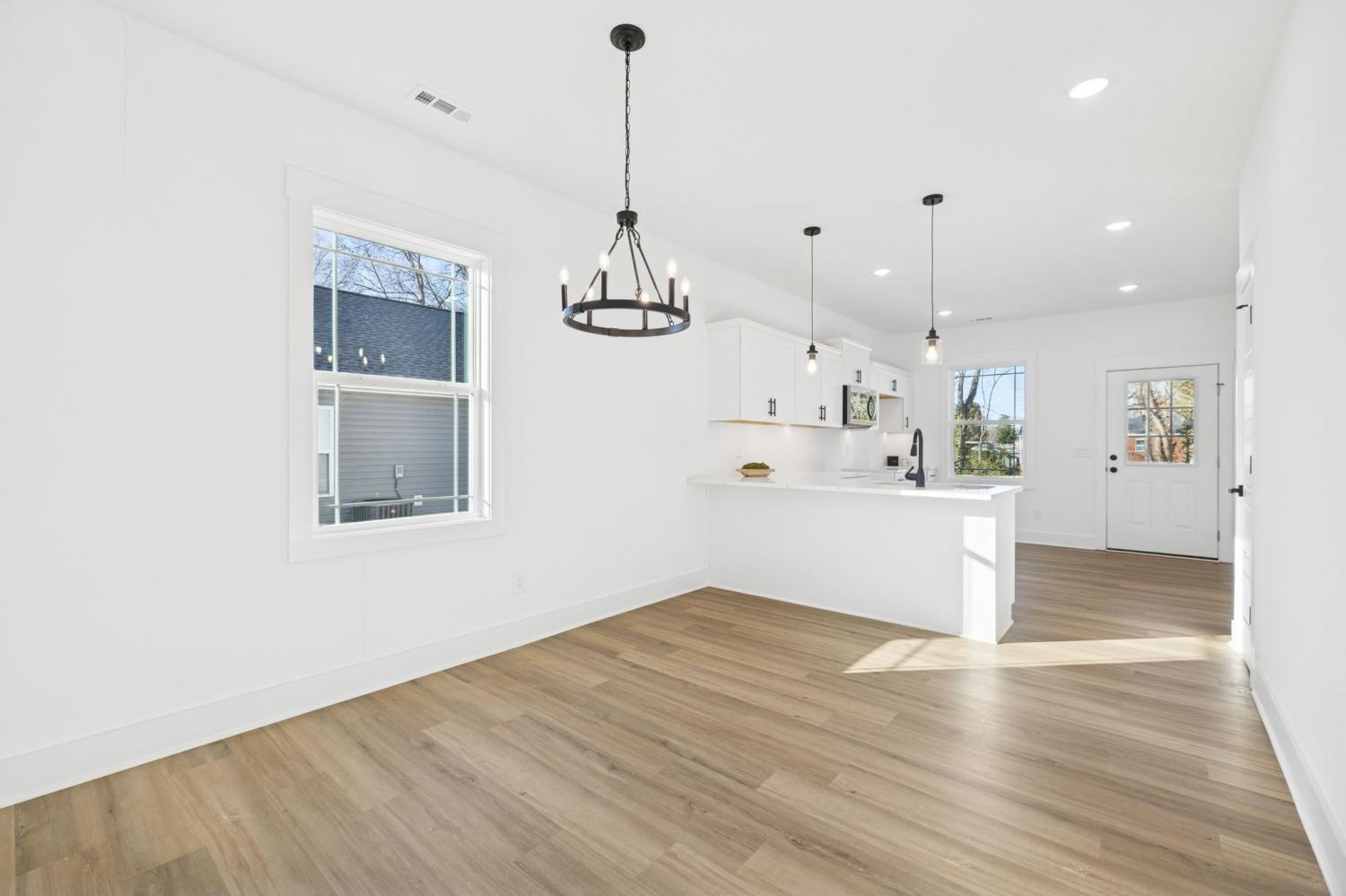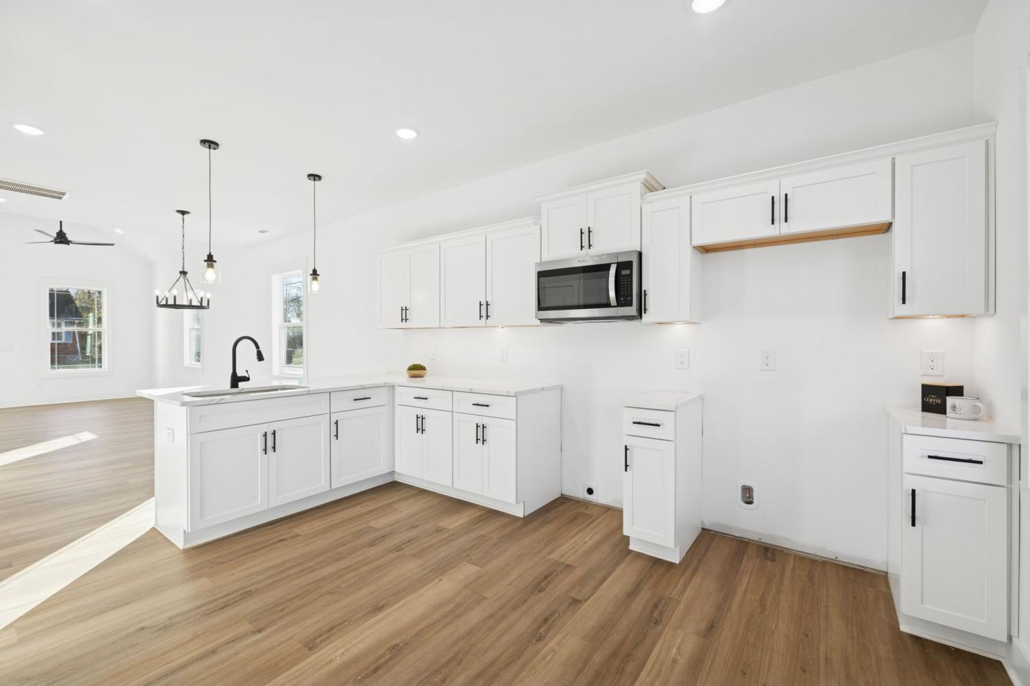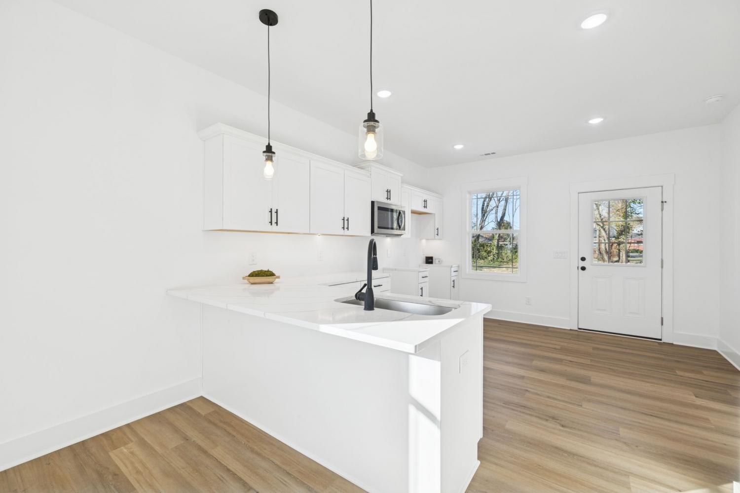 New construction in Springfield with thoughtful finishes and a functional layout. This home offers an open living area filled with natural light, vaulted ceilings with an exposed beam, and a spacious kitchen with white cabinetry, quartz countertops, under cabinet lighting and modern black fixtures. The primary suite features its own vaulted ceiling, a bathroom with quartz counters, gold fixtures, and a tub-shower combo. The guest bath includes matching finishes for a cohesive feel. Enjoy a covered front porch with a beautiful gable detail and a covered back patio overlooking a level, tree-lined backyard. Conveniently located close to schools, parks, and downtown Springfield. Move-in ready!
