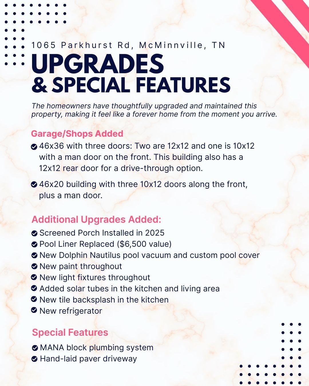 Set on more than 5 peaceful acres, this property combines thoughtful updates with the quiet charm of country living. From the moment you arrive, the hand-laid paver driveway sets the tone—crafted from start to finish with precision and the quality and character of true pavers./// Two newly built garage buildings: 46x36 with 3 doors: Two are 12x12 and one is 10x12 with a man door on the front. This building also has a 1x12 rear entrance for a drive-through option. The 46x20 building has 3 10x12 doors along the front with a man door. These offer incredible space for vehicles, tools, or hobbies, each featuring durable construction designed for everyday use. /// The backyard is made for relaxing and entertaining with a 15x30 in-ground pool, new liner, custom cover, freshly sealed brickwork, and a covered screened porch for shaded enjoyment by the water. A new Dolphin Nautilus pool vacuum is included for easy upkeep./// Inside, the home feels fresh and welcoming with new paint throughout, new light fixtures, a brand new refrigerator, and a stylish tile backsplash in the kitchen. The kitchen and living room flow together with ease, creating a functional open space that works well for gatherings and casual daily living. All kitchen appliances remain, and the MANA block plumbing system adds a touch of modern convenience./// The land is fenced on three sides and used for hay production, giving open, usable acreage that feels both purposeful and peaceful, a setting that adds to the comfort you feel the moment you pull into the driveway. /// Every upgrade reflects care, pride, and purpose, a house that feels good to come home to at the end of the day.///