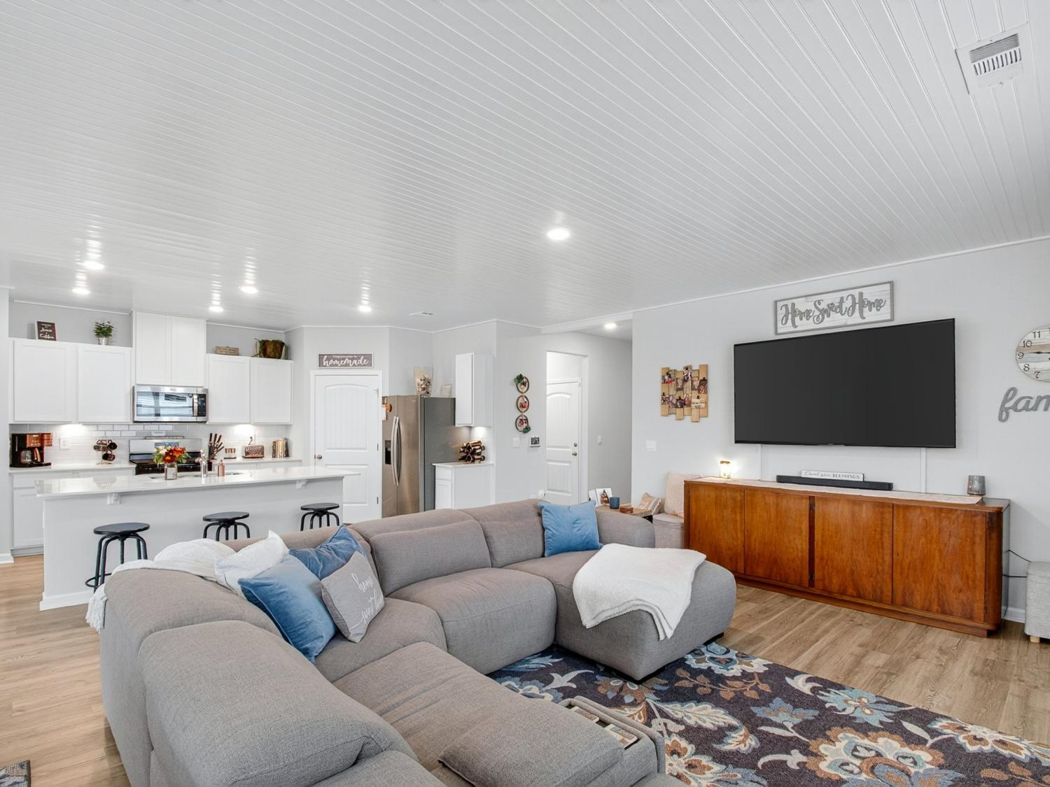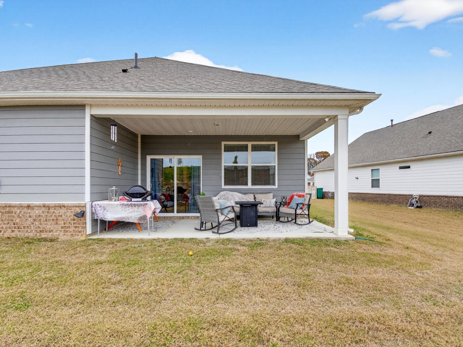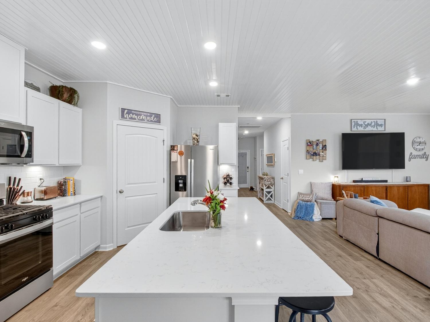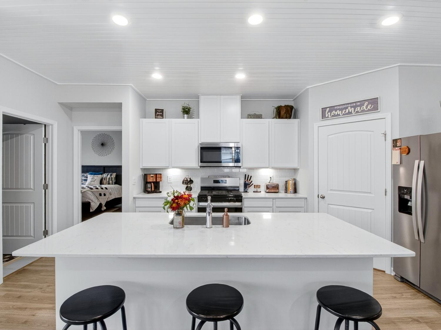 Get up to 1% towards closing with use of preferred lender (ask for details). Welcome to this stunning one-level home offering the perfect blend of modern design and everyday comfort—just 30 minutes north of downtown Nashville and 30 minutes south of the Kentucky boarder. Built in 2024, this residence features 3 bedrooms, 2 full baths, and 1,796 square feet of beautifully crafted living space. Step inside to discover a bright, open-concept floor plan with beautiful wood floors and designer finishes throughout, including a new custom ceiling. The spacious living area flows seamlessly into the kitchen showcasing quartz countertops, stainless steel appliances, and a large center island—ideal for entertaining or enjoying family meals. The owner’s suite provides a private retreat with two walk-in closets and a luxurious en-suite bath complete with modern fixtures and finishes. Two additional bedrooms offer ample space for family, guests, or a home office. Outside on your back patio you can enjoy your privacy with no backyard neighbors. Additional highlights include a 2-car garage, a built-in security system with smart cameras, and window sensors for added peace of mind and convenience. Located in one of White House’s most desirable communities, Legacy Farms, this home combines small-town charm with quick access to shopping, dining, and major highways for an easy Nashville commute. Experience modern maintenance-free living at its best—schedule your private showing today!