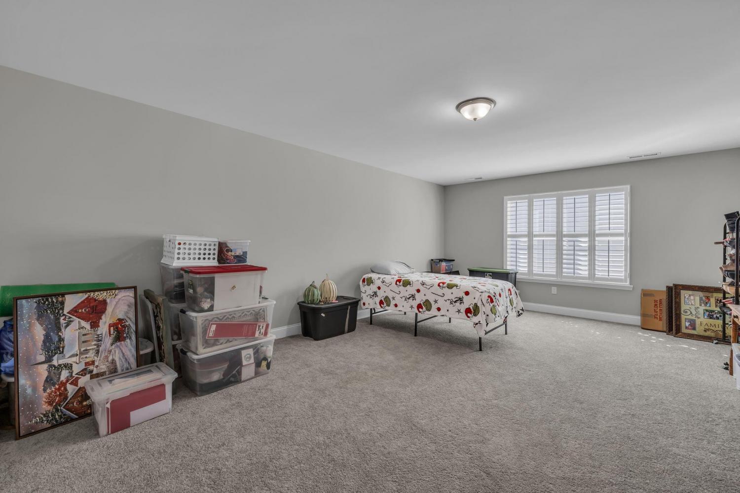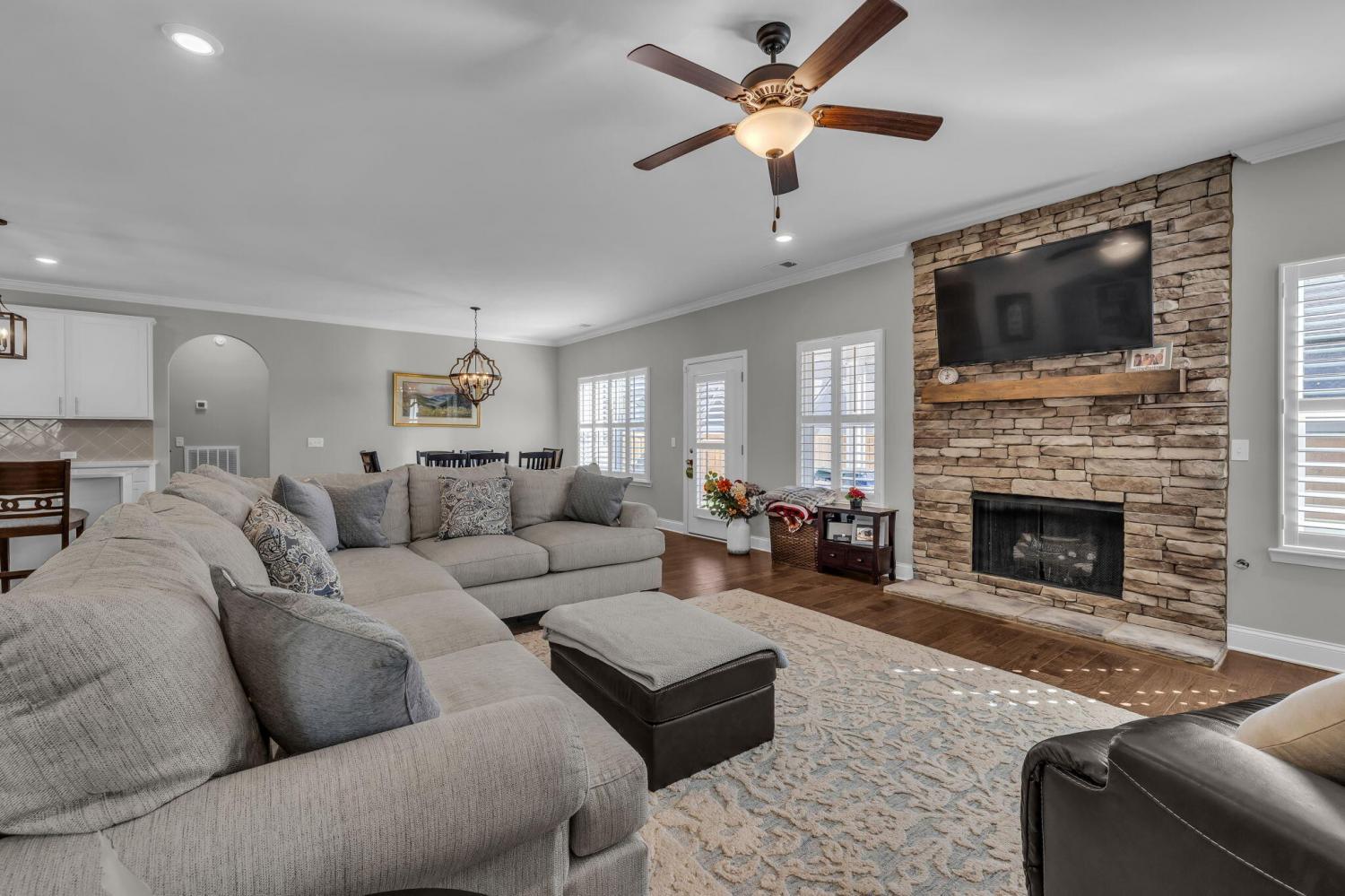 From the moment you arrive, you'll be captivated by this home's timeless character and curb appeal. Step inside and you'll immediately notice the thoughtful details throughout — graceful arched entryways, elegant crown molding, recessed lighting, and classic plantation shutters. The kitchen is truly a dream, featuring beautiful granite countertops, a large eat-at island, a spacious pantry, stylish tile backsplash, stainless steel appliances, and an abundance of cabinet and counter space — perfect for cooking or gathering with friends and family. The open great room offers tall ceilings and a stunning stacked-stone fireplace, seamlessly flowing into the dining area for easy entertaining. A formal dining room provides the perfect space for hosting special meals and celebrations. The split-bedroom floor plan ensures privacy, with a generous primary suite that includes a large walk-in closet and a beautifully designed bath with tile flooring, a roomy tiled shower, and dual sinks. The additional bedrooms are large and bright, offering plenty of space for family or guests along with excellent closet storage. Upstairs, you'll find a versatile bonus room that could be used as a 4th bedroom, media room, or playroom, along with a third full bath and convenient walk-out storage. Step outside to your covered back patio — the perfect spot to relax and enjoy the level, fenced backyard. This home truly combines comfort, charm, and functionality in one beautiful package.