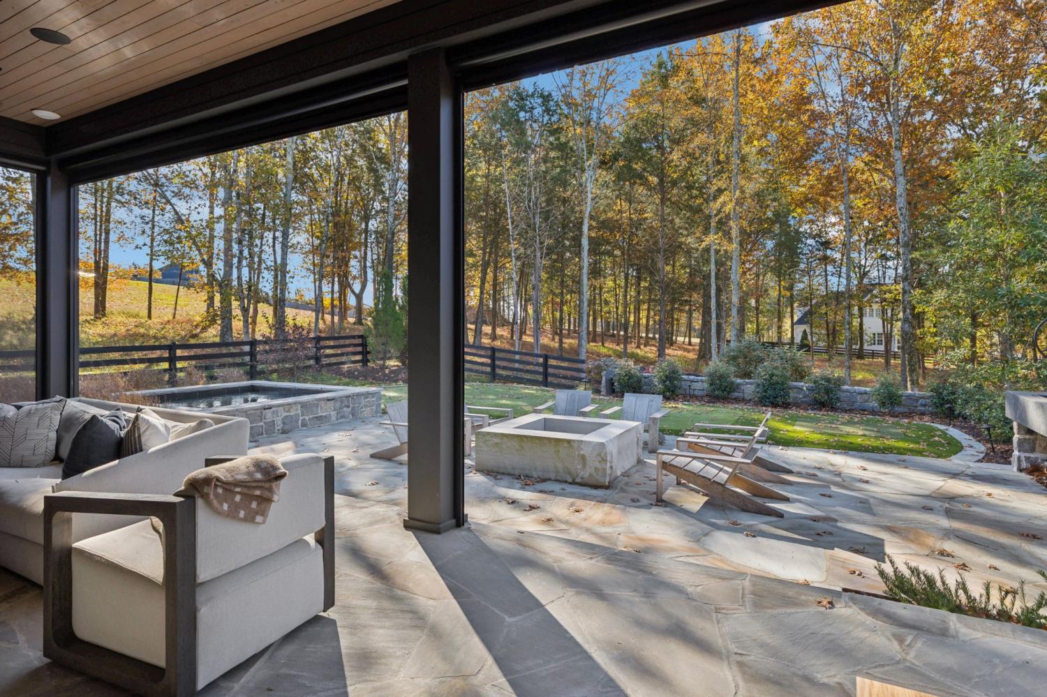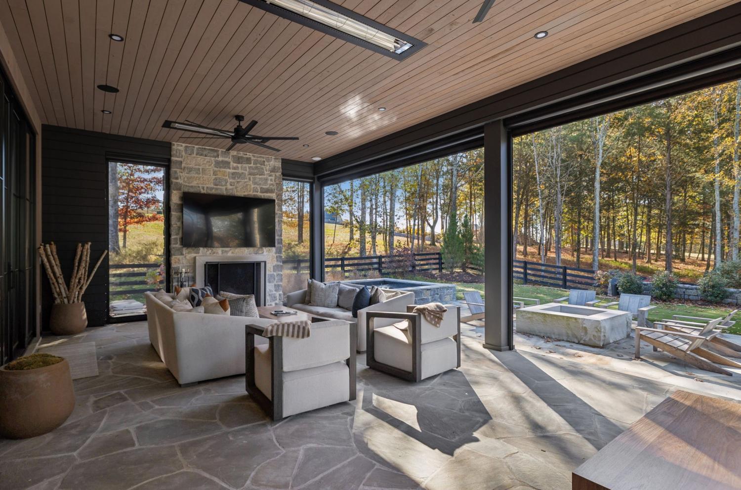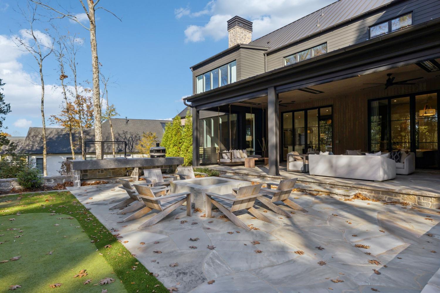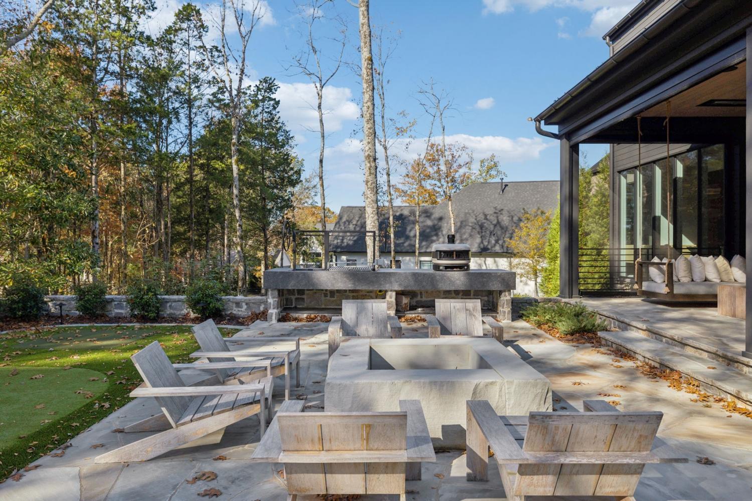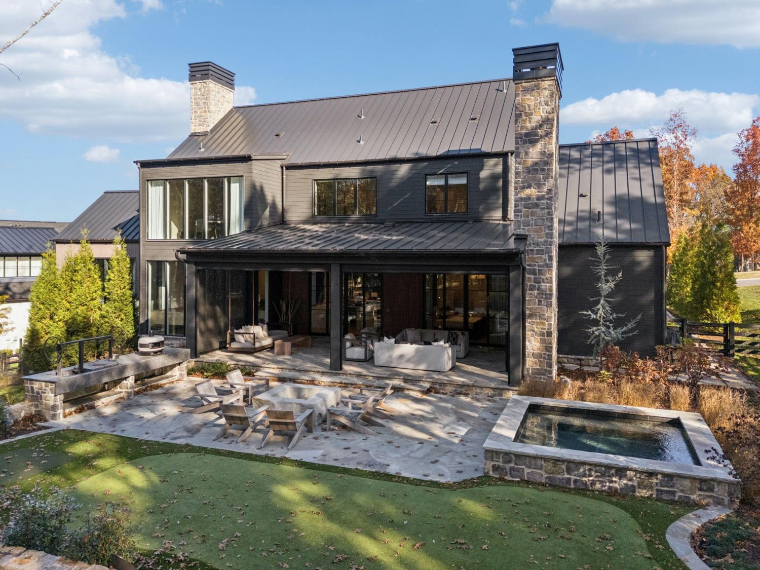Nestled in one of the area’s most prestigious neighborhoods, this architectural masterpiece blends sleek sophistication with warm, natural elements. From the moment you step through the dramatic steel-framed entry door, you’re greeted by soaring ceilings, expansive windows, and an open layout that floods the home with natural light. The heart of the home is a chef’s dream kitchen featuring dual waterfall islands, custom black cabinetry, integrated appliances, and designer lighting—perfect for both intimate gatherings and grand entertaining. Flowing seamlessly from the kitchen, the living space boasts a striking floor-to-ceiling fireplace and panoramic views of the wooded surroundings. Retreat to the serene primary suite, where vaulted ceilings, a statement chandelier, and a wall of glass create a private sanctuary. Every detail—from the wide-plank hardwood floors to the curated finishes—reflects uncompromising quality and style. Step outside to experience an entertainer’s paradise. A stunning covered patio with stone flooring and a cozy lounge area overlooks a beautifully landscaped backyard framed by mature trees. Enjoy evenings around the custom firepit or host unforgettable gatherings with the built-in outdoor kitchen and grilling station. For recreation and relaxation, the backyard features a professional-grade golf putting green for perfecting your short game and a spa-style plunge pool designed for ultimate tranquility. This outdoor oasis offers the perfect blend of leisure, luxury, and sophistication. Outside, the modern farmhouse-inspired exterior combines natural wood siding with bold black accents, setting the tone for refined elegance. This home offers not just a place to live, but a lifestyle defined by luxury, comfort, and connection to nature. Offering fantastic value for the neighborhood, this home is being sold fully furnished—inviting you to discover a world where every detail is designed for indulgence.
