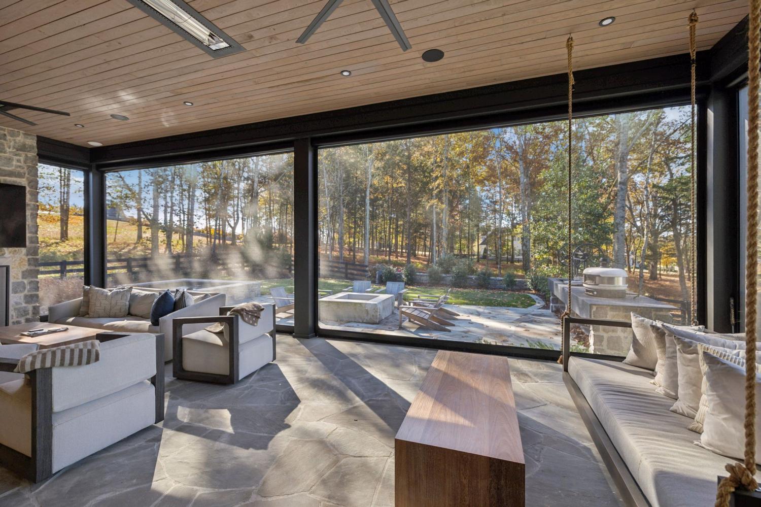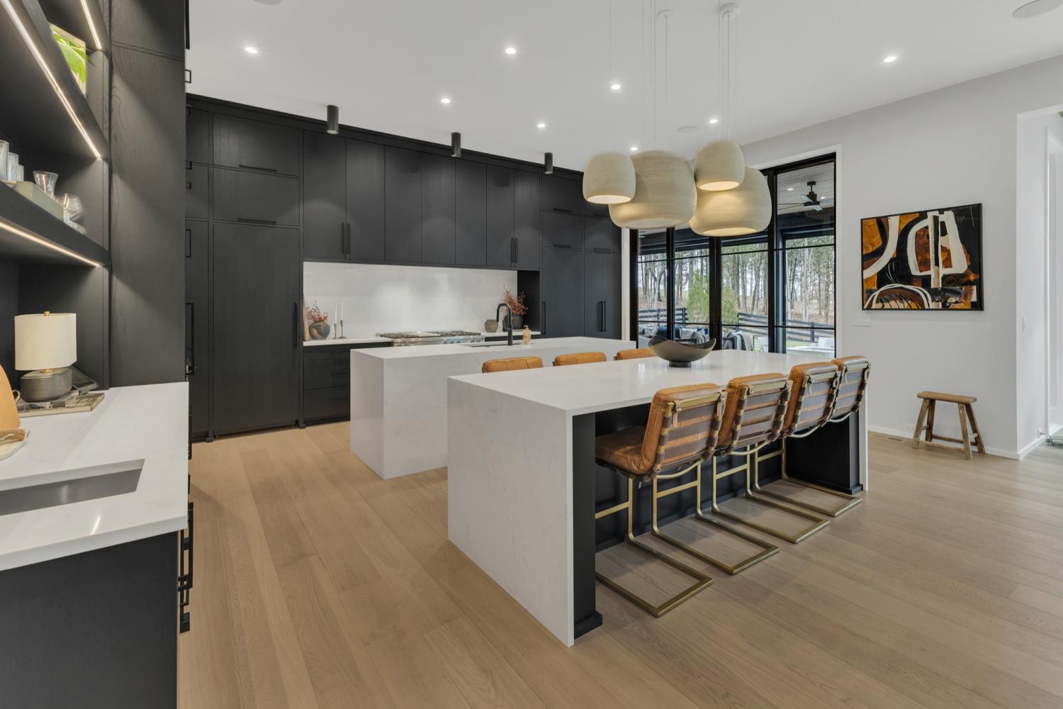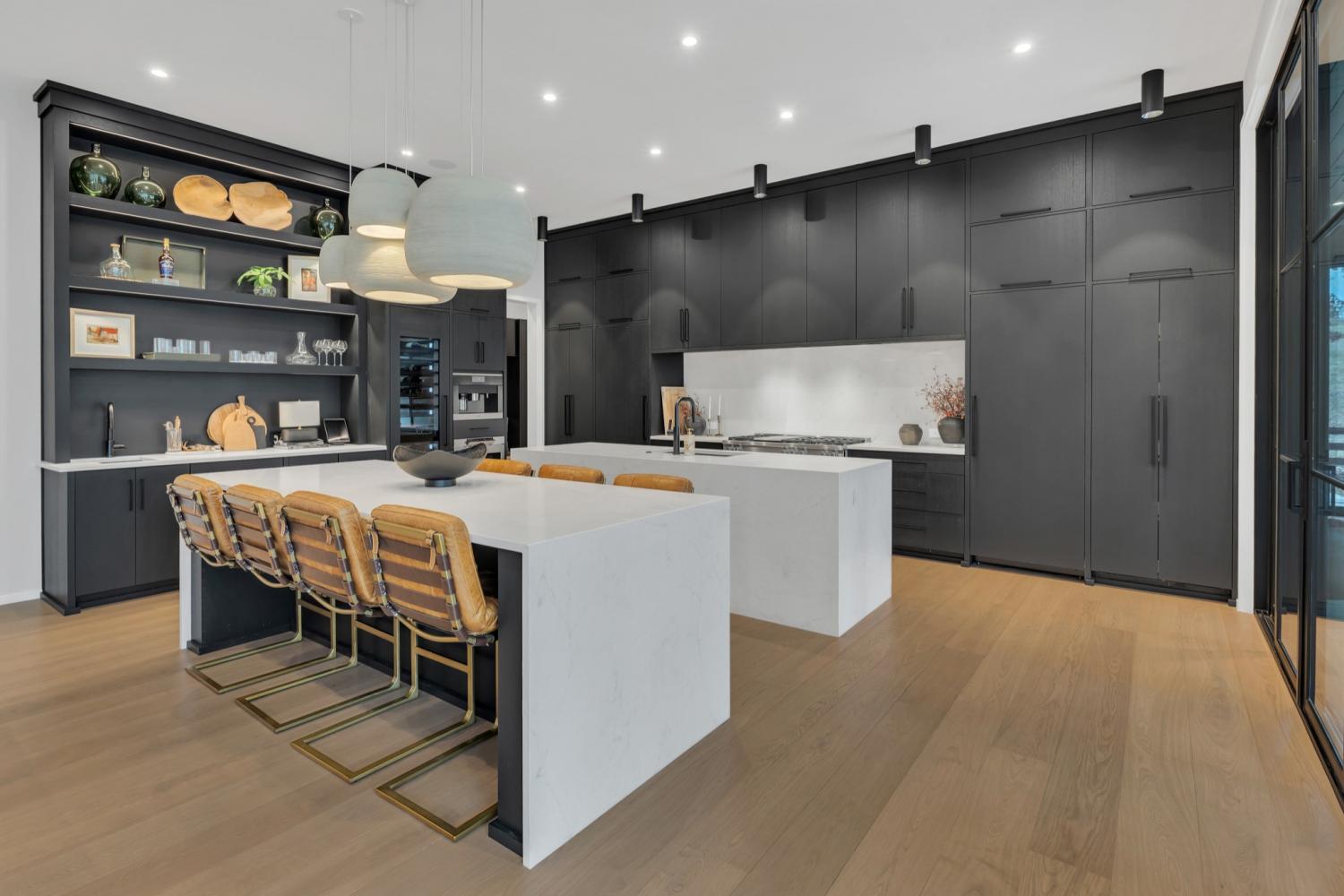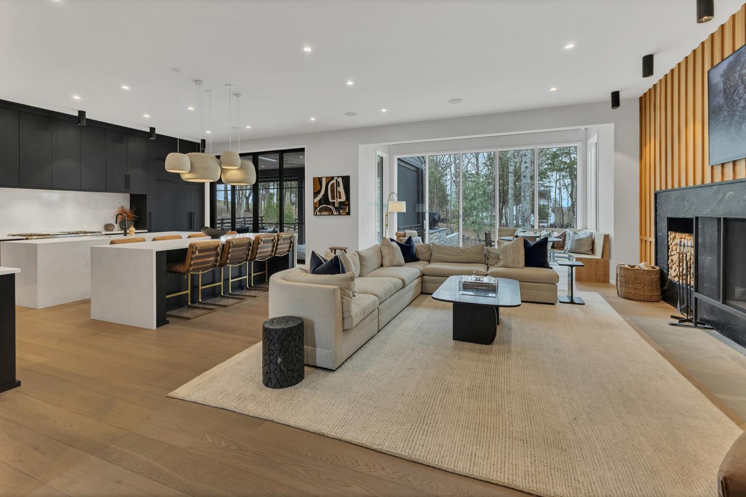 Nestled in one of the area’s most prestigious neighborhoods, this architectural masterpiece blends sleek sophistication with warm, natural elements. From the moment you step through the dramatic steel-framed entry door, you’re greeted by soaring ceilings, expansive windows, and an open layout that floods the home with natural light. The heart of the home is a chef’s dream kitchen featuring dual waterfall islands, custom black cabinetry, integrated appliances, and designer lighting—perfect for both intimate gatherings and grand entertaining. Flowing seamlessly from the kitchen, the living space boasts a striking floor-to-ceiling fireplace and panoramic views of the wooded surroundings. Retreat to the serene primary suite, where vaulted ceilings, a statement chandelier, and a wall of glass create a private sanctuary. Every detail—from the wide-plank hardwood floors to the curated finishes—reflects uncompromising quality and style. Step outside to experience an entertainer’s paradise. A stunning covered patio with stone flooring and a cozy lounge area overlooks a beautifully landscaped backyard framed by mature trees. Enjoy evenings around the custom firepit or host unforgettable gatherings with the built-in outdoor kitchen and grilling station. For recreation and relaxation, the backyard features a professional-grade golf putting green for perfecting your short game and a spa-style plunge pool designed for ultimate tranquility. This outdoor oasis offers the perfect blend of leisure, luxury, and sophistication. Outside, the modern farmhouse-inspired exterior combines natural wood siding with bold black accents, setting the tone for refined elegance. This home offers not just a place to live, but a lifestyle defined by luxury, comfort, and connection to nature. Offering fantastic value for the neighborhood, this home is being sold fully furnished—inviting you to discover a world where every detail is designed for indulgence.