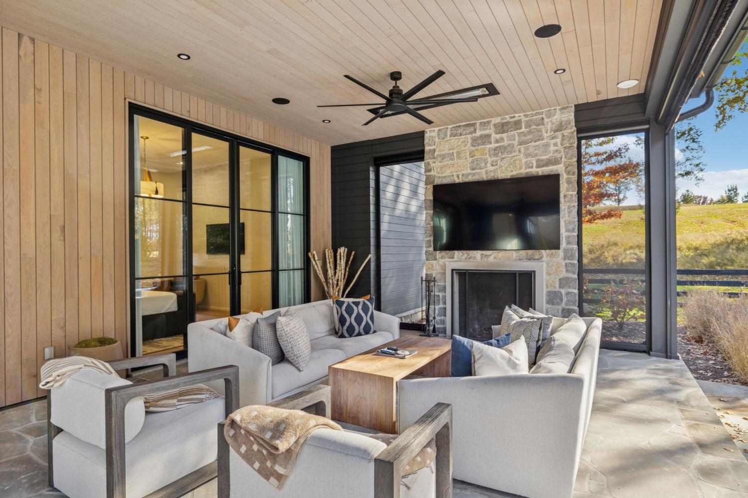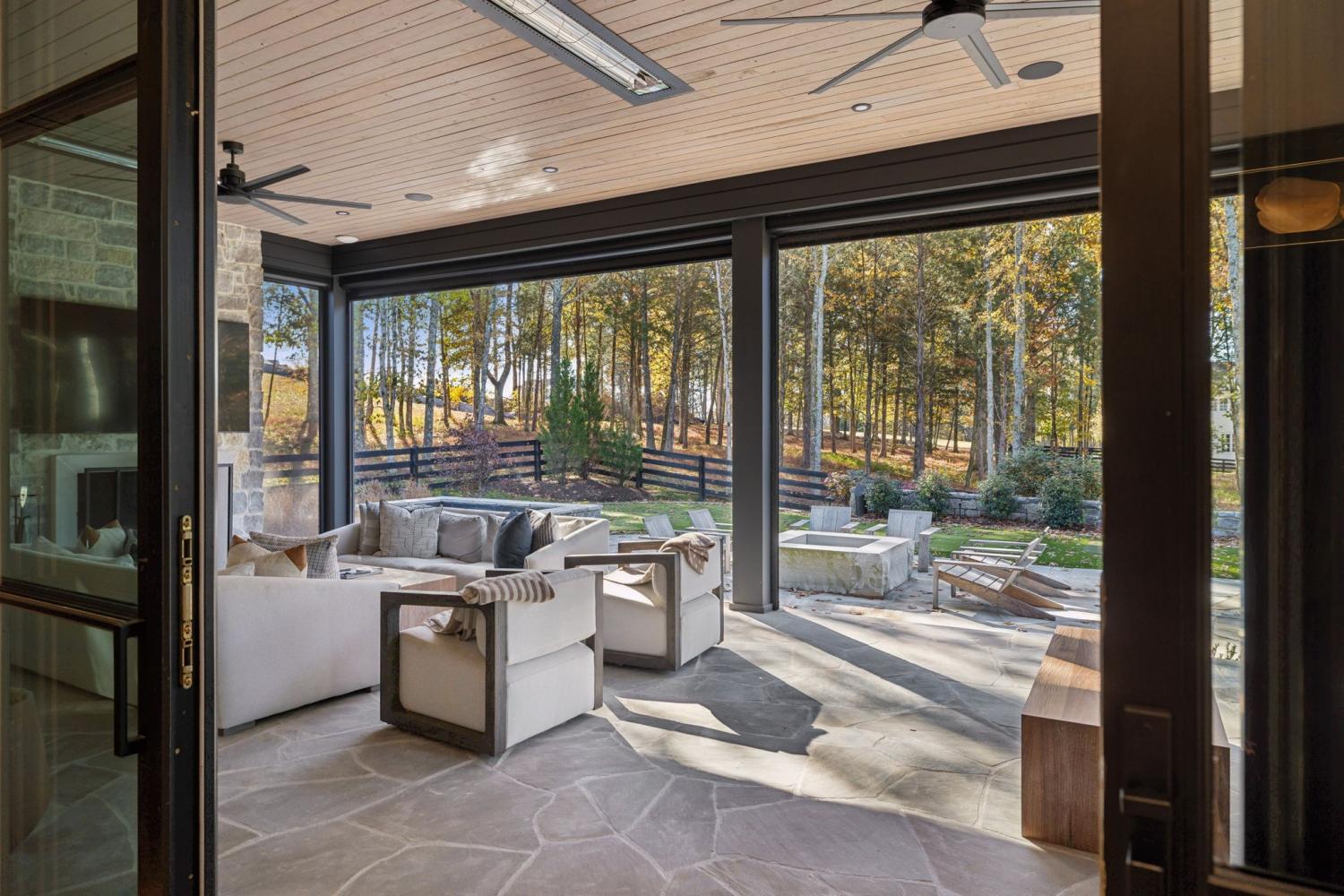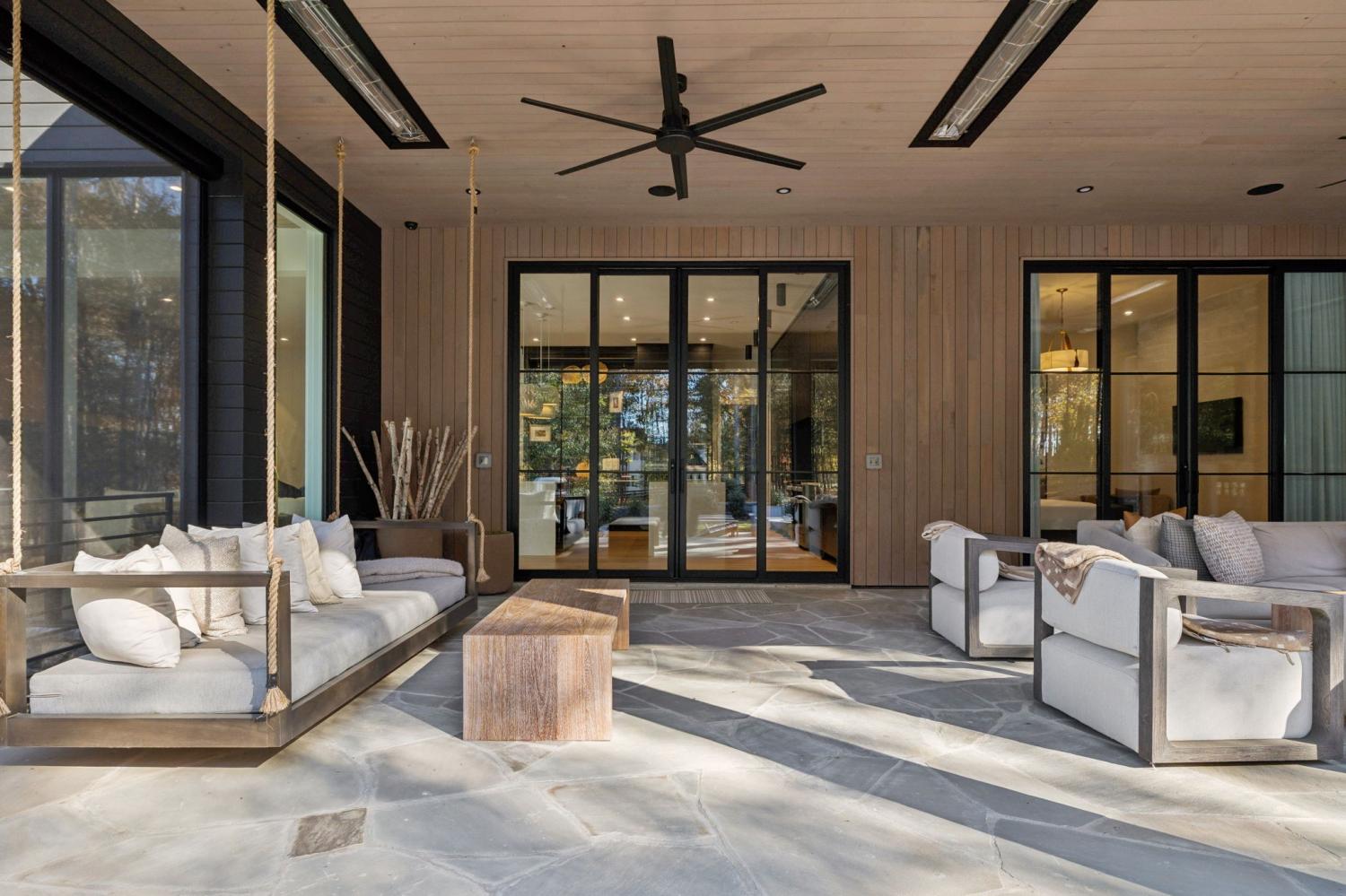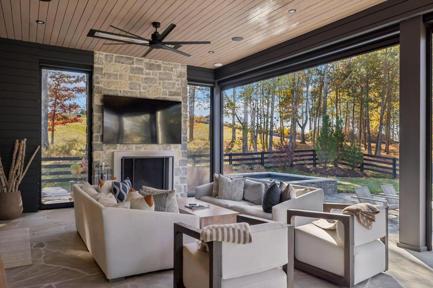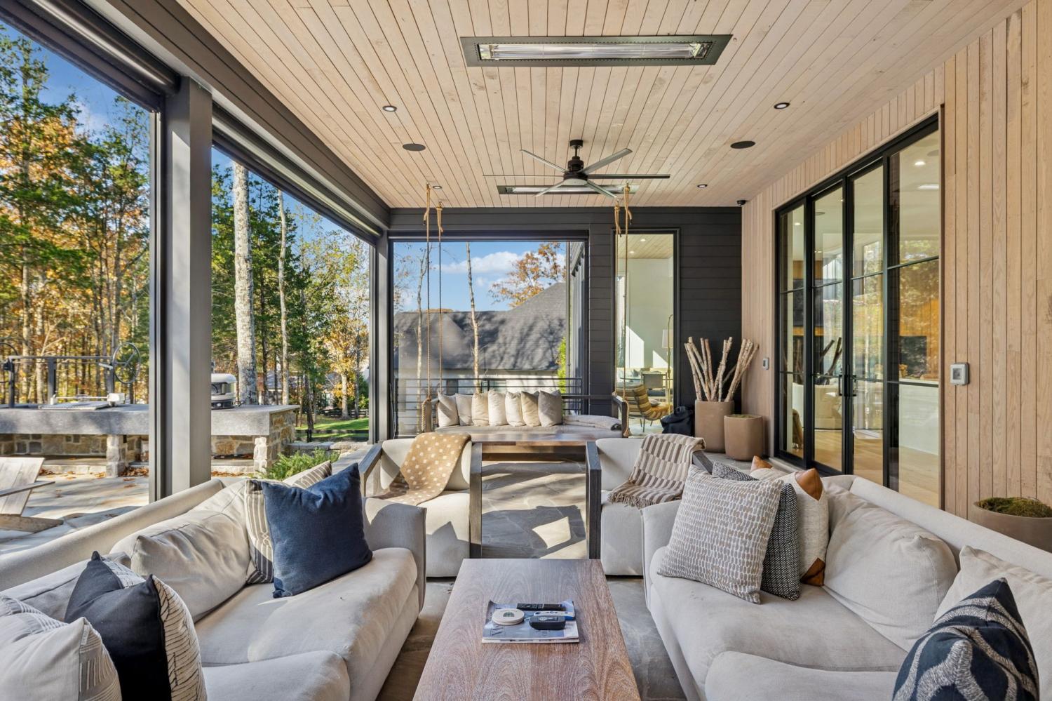 Nestled in one of the area’s most prestigious neighborhoods, this architectural masterpiece blends sleek sophistication with warm, natural elements. From the moment you step through the dramatic steel-framed entry door, you’re greeted by soaring ceilings, expansive windows, and an open layout that floods the home with natural light. The heart of the home is a chef’s dream kitchen featuring dual waterfall islands, custom black cabinetry, integrated appliances, and designer lighting—perfect for both intimate gatherings and grand entertaining. Flowing seamlessly from the kitchen, the living space boasts a striking floor-to-ceiling fireplace and panoramic views of the wooded surroundings. Retreat to the serene primary suite, where vaulted ceilings, a statement chandelier, and a wall of glass create a private sanctuary. Every detail—from the wide-plank hardwood floors to the curated finishes—reflects uncompromising quality and style. Step outside to experience an entertainer’s paradise. A stunning covered patio with stone flooring and a cozy lounge area overlooks a beautifully landscaped backyard framed by mature trees. Enjoy evenings around the custom firepit or host unforgettable gatherings with the built-in outdoor kitchen and grilling station. For recreation and relaxation, the backyard features a professional-grade golf putting green for perfecting your short game and a spa-style plunge pool designed for ultimate tranquility. This outdoor oasis offers the perfect blend of leisure, luxury, and sophistication. Outside, the modern farmhouse-inspired exterior combines natural wood siding with bold black accents, setting the tone for refined elegance. This home offers not just a place to live, but a lifestyle defined by luxury, comfort, and connection to nature. Offering fantastic value for the neighborhood, this home is being sold fully furnished—inviting you to discover a world where every detail is designed for indulgence.