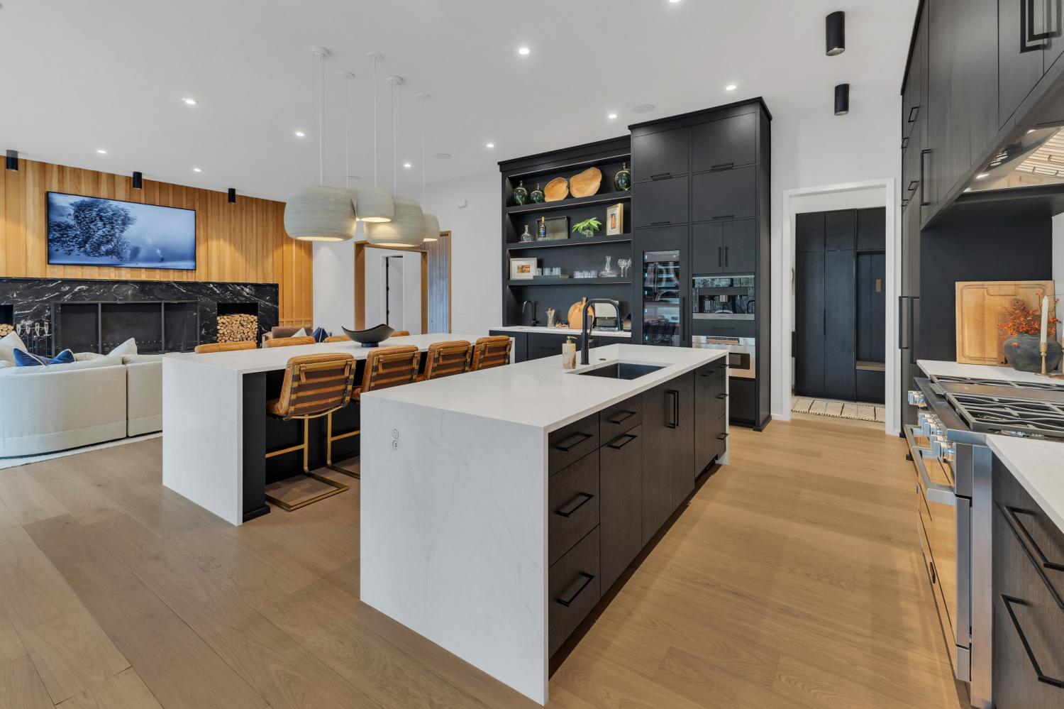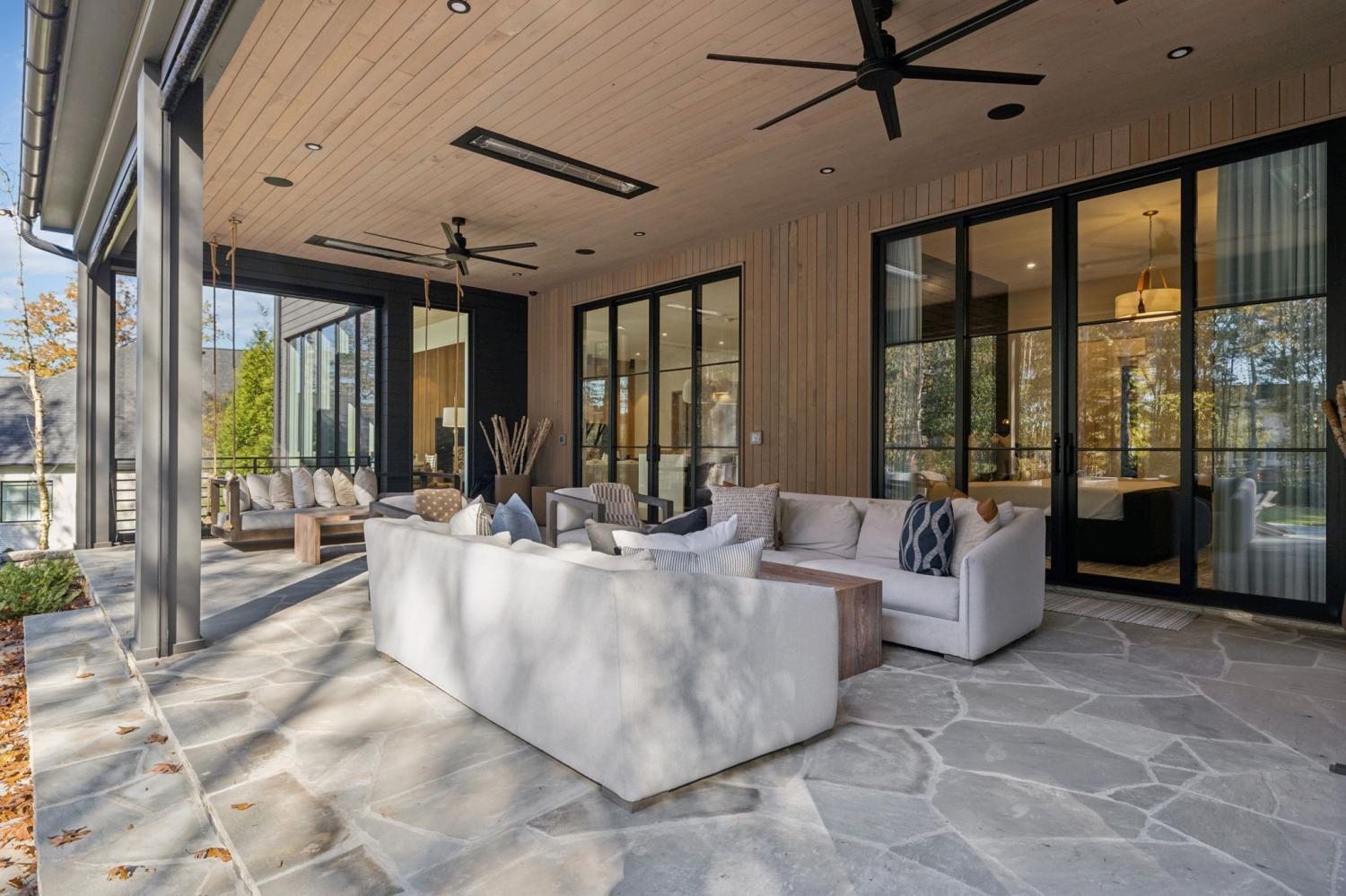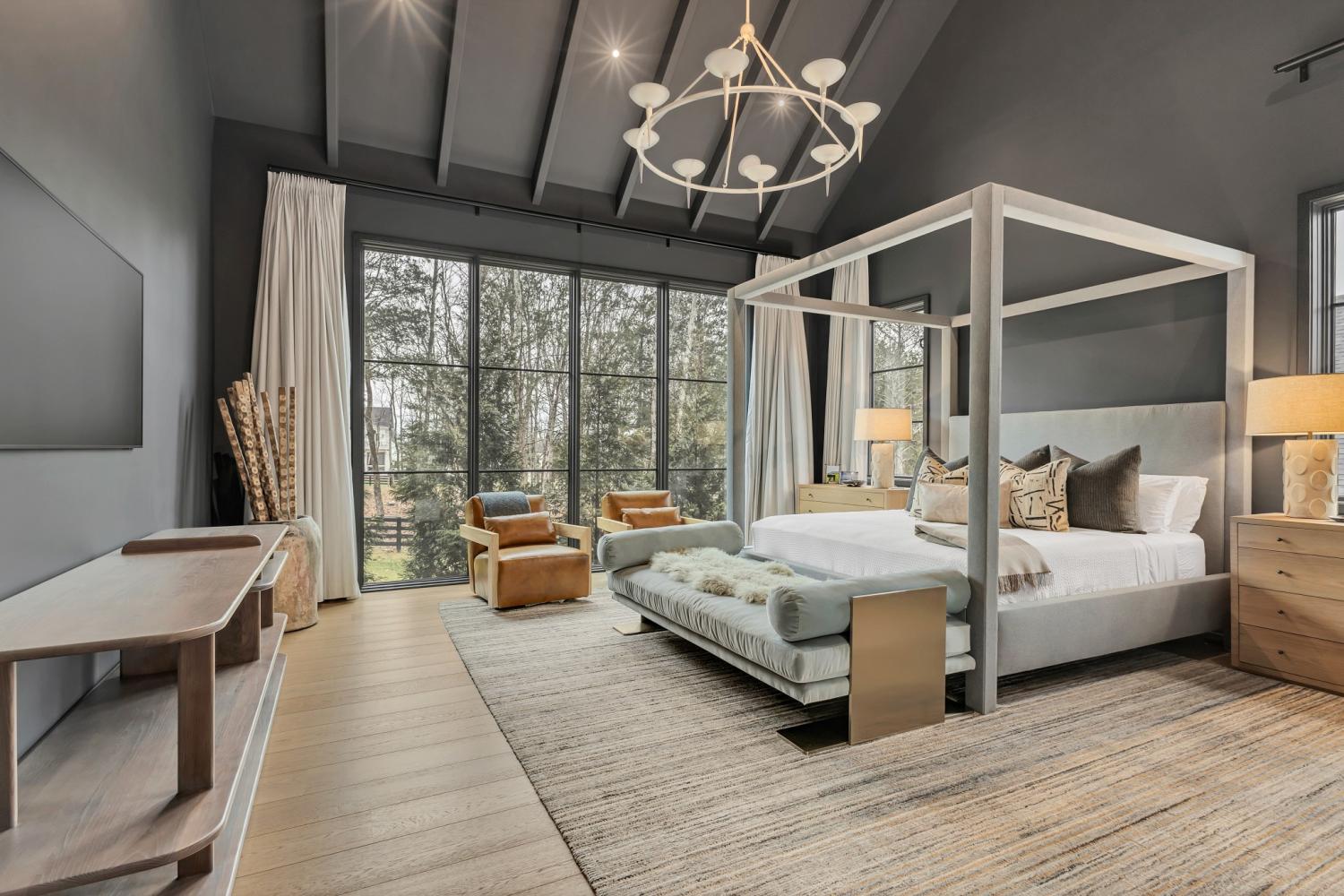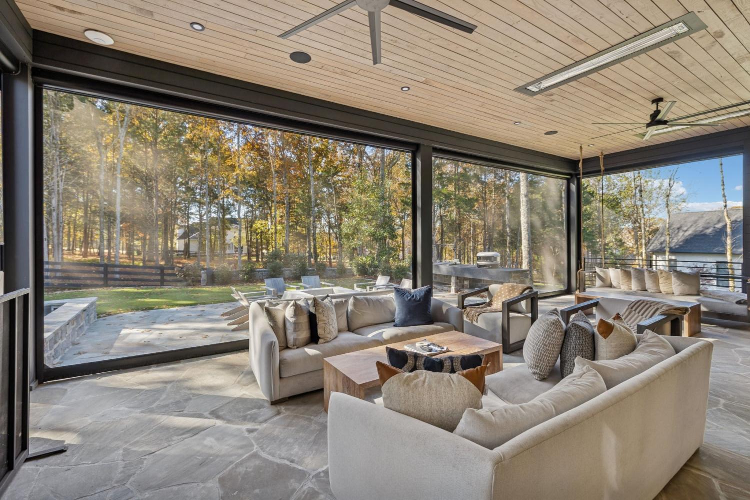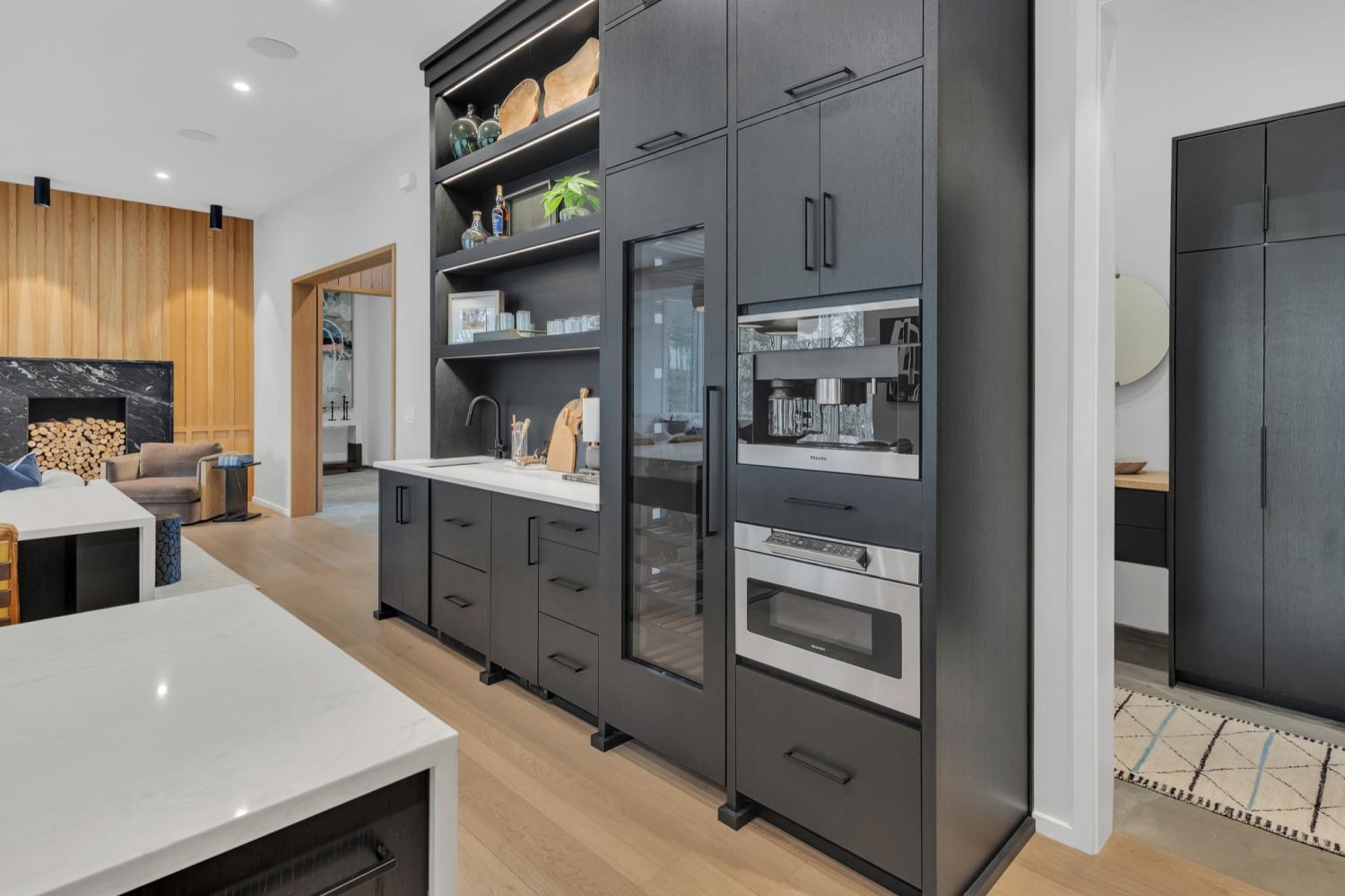 Nestled in one of the area’s most prestigious neighborhoods, this architectural masterpiece blends sleek sophistication with warm, natural elements. From the moment you step through the dramatic steel-framed entry door, you’re greeted by soaring ceilings, expansive windows, and an open layout that floods the home with natural light. The heart of the home is a chef’s dream kitchen featuring dual waterfall islands, custom black cabinetry, integrated appliances, and designer lighting—perfect for both intimate gatherings and grand entertaining. Flowing seamlessly from the kitchen, the living space boasts a striking floor-to-ceiling fireplace and panoramic views of the wooded surroundings. Retreat to the serene primary suite, where vaulted ceilings, a statement chandelier, and a wall of glass create a private sanctuary. Every detail—from the wide-plank hardwood floors to the curated finishes—reflects uncompromising quality and style. Step outside to experience an entertainer’s paradise. A stunning covered patio with stone flooring and a cozy lounge area overlooks a beautifully landscaped backyard framed by mature trees. Enjoy evenings around the custom firepit or host unforgettable gatherings with the built-in outdoor kitchen and grilling station. For recreation and relaxation, the backyard features a professional-grade golf putting green for perfecting your short game and a spa-style plunge pool designed for ultimate tranquility. This outdoor oasis offers the perfect blend of leisure, luxury, and sophistication. Outside, the modern farmhouse-inspired exterior combines natural wood siding with bold black accents, setting the tone for refined elegance. This home offers not just a place to live, but a lifestyle defined by luxury, comfort, and connection to nature. Offering fantastic value for the neighborhood, this home is being sold fully furnished—inviting you to discover a world where every detail is designed for indulgence.