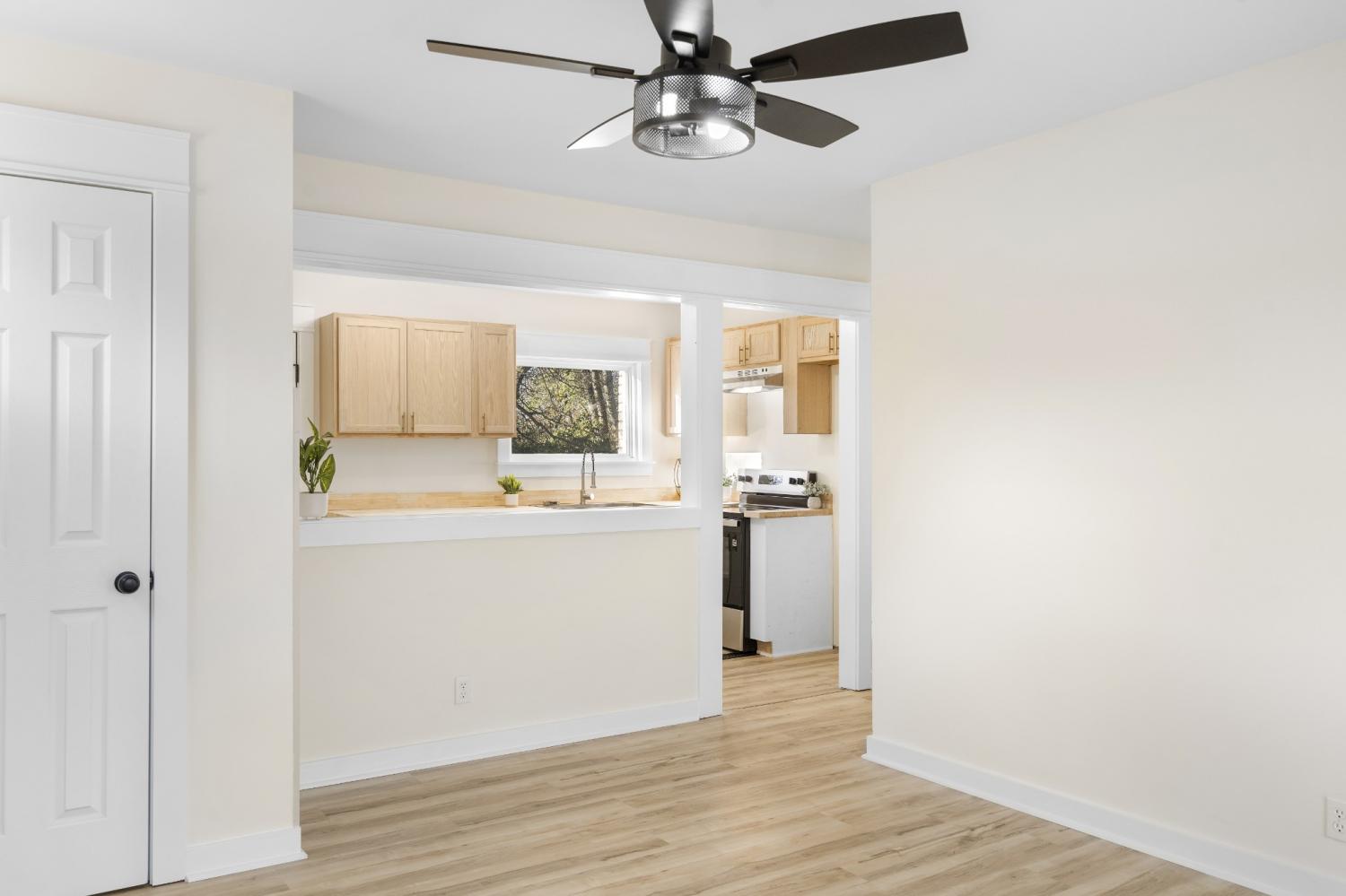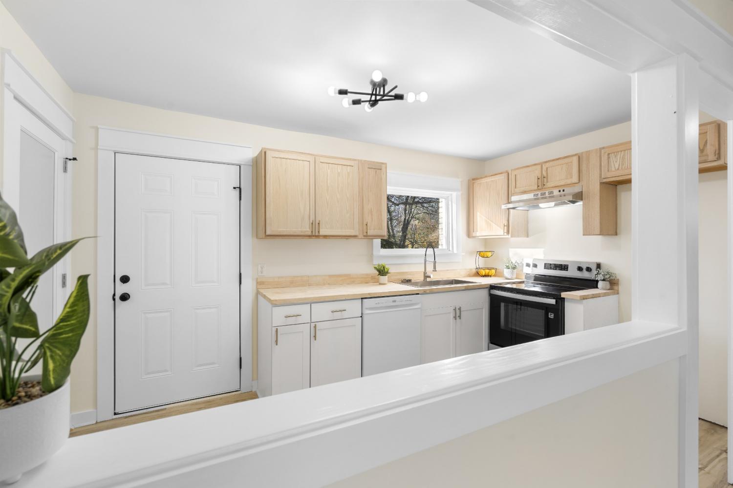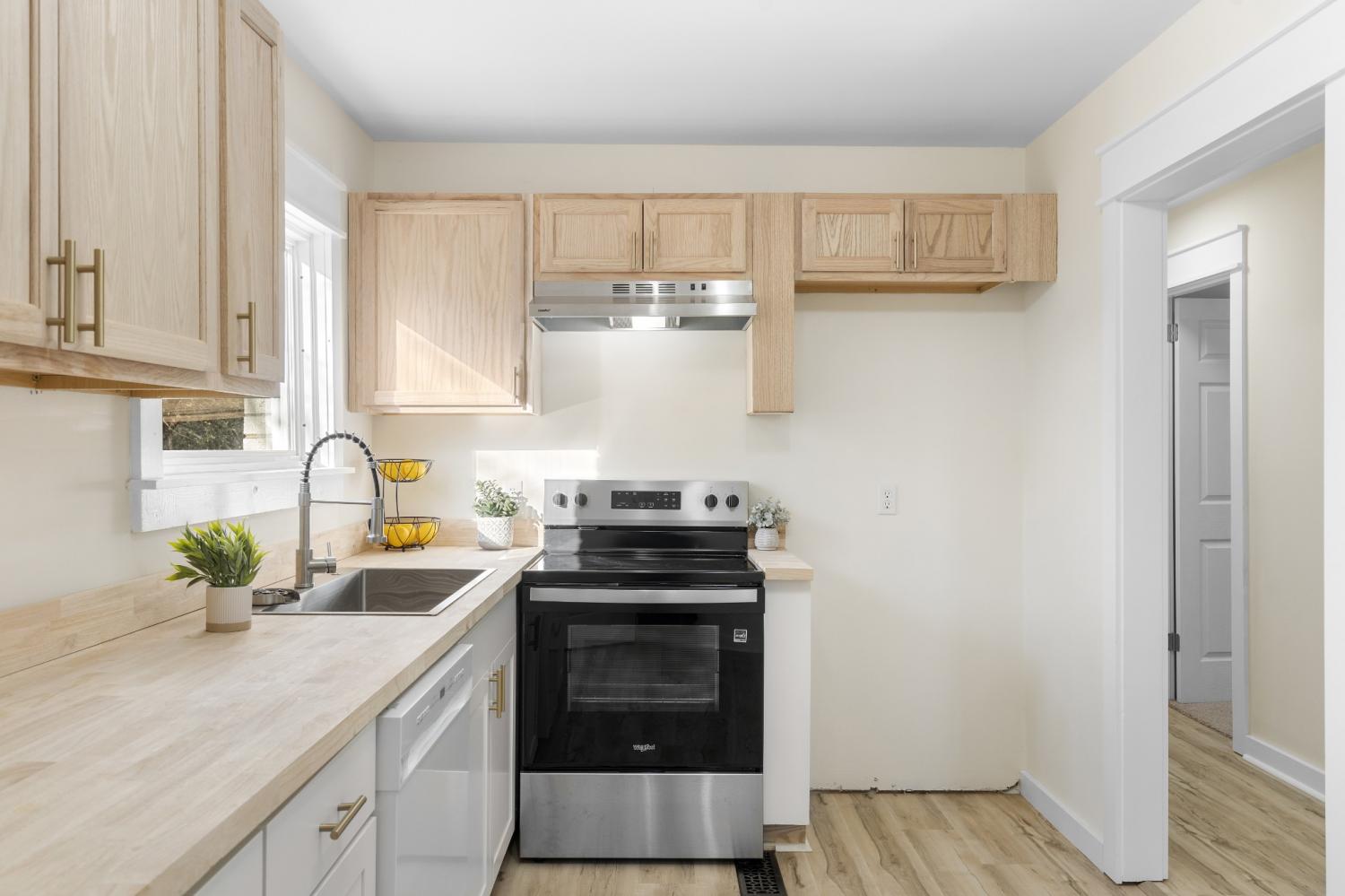 Fully renovated and move-in ready! This home features an updated brick exterior with fresh curb appeal, a brand-new roof, new cedar shutters, and two newly built decks perfect for outdoor entertainment. Inside, you'll find fresh paint, new trim, upgraded lighting, and all-new windows, along with new LVP flooring and carpet throughout. The fully remodeled kitchen offers two-tone cabinets with gold finishes, new butcher block countertops, a deep single-basin sink with upgraded faucet and cup washer, new appliances, and a ventless hood. The bathroom includes a wood-tone vanity with a marble top, updated plumbing fixtures, and a vent/light combo with Bluetooth stereo and LED lighting. All three bedrooms have been refreshed with new carpet, fresh paint, new trim, and upgraded lighting, creating bright and comfortable spaces throughout the home. Major system upgrades include all-new plumbing, a new water heater, new interior and exterior doors, and a new 2.5-ton split system with new ductwork and a new return vent. The newly installed garage door is in the open basement offering flexible storage space, updated mechanicals, and convenient access to the main level. Exterior enhancements continue with fresh paint, charming wood details, and an open backyard with plenty of green space. Thoughtfully redesigned with modern style and everyday comfort in mind, this fully updated home is ready for its next chapter — just move right in and enjoy!