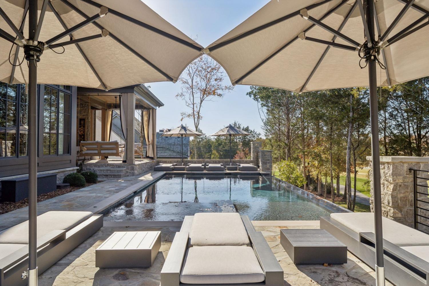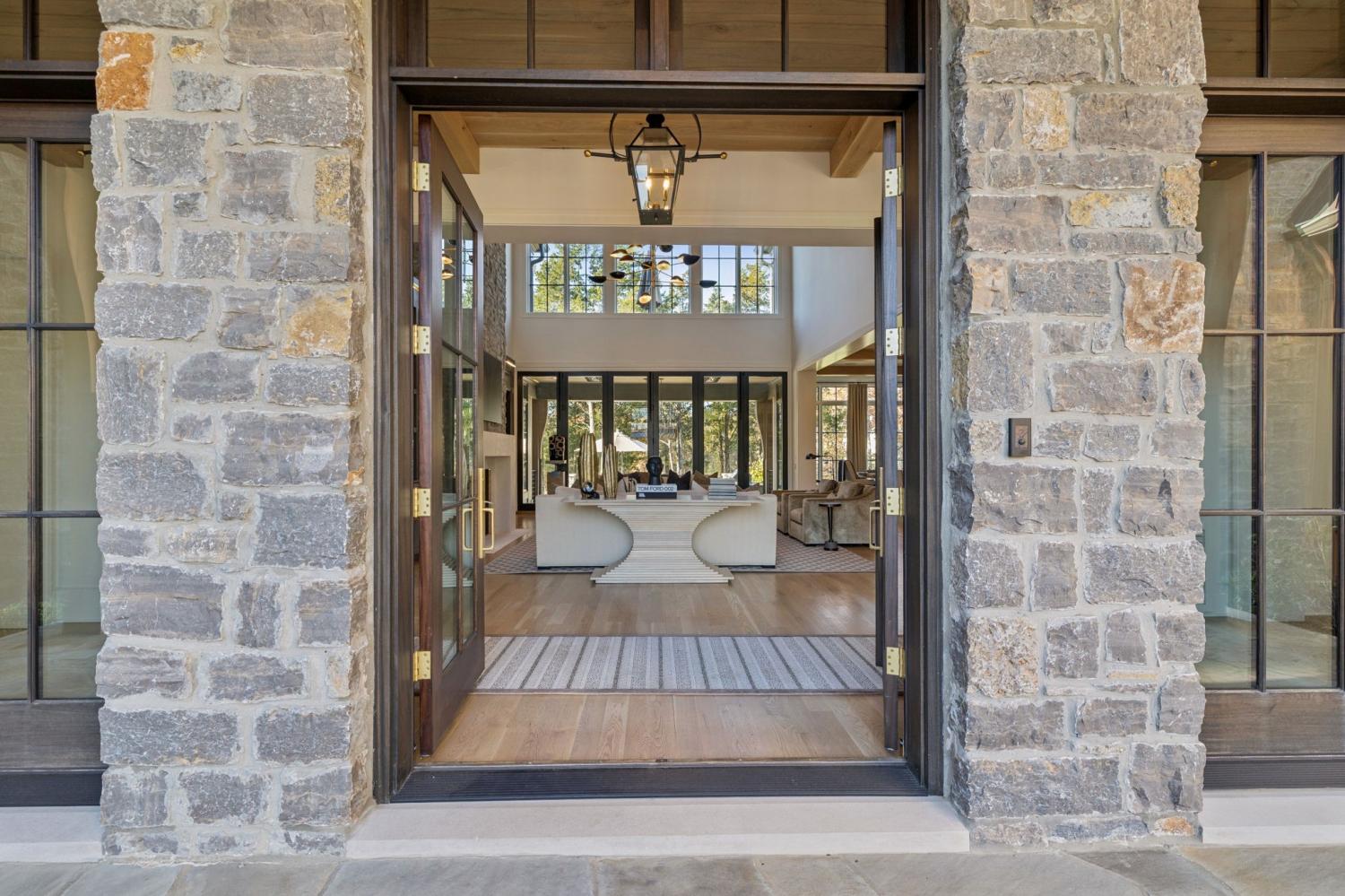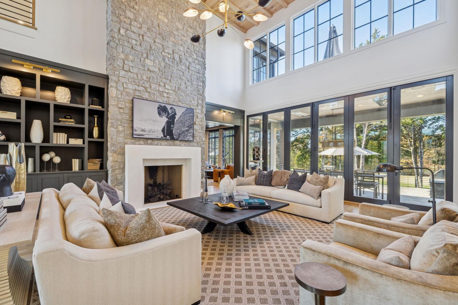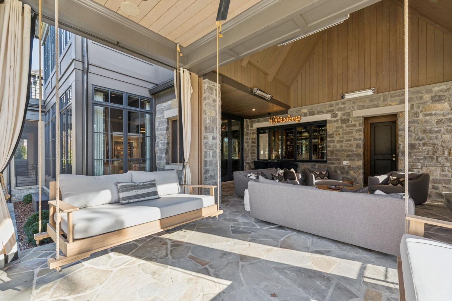 This extraordinary residence is a showcase of architectural brilliance and refined elegance. From its commanding exterior presence to its meticulously curated interiors, every detail has been designed to impress. Step into a private resort experience with an infinity-edge pool that mirrors the sunset sky, creating a breathtaking backdrop for relaxation and entertainment. Multiple terraces and lounging areas invite you to unwind, while a custom stone firepit and an outdoor kitchen with built-in grill make alfresco dining and gatherings unforgettable.The seamless integration of indoor and outdoor spaces ensures that every moment is elevated by panoramic views and impeccable design. Inside, soaring ceilings and walls of glass flood the home with natural light, highlighting the craftsmanship and luxurious finishes throughout. The grand living room features a dramatic stone fireplace and an open layout perfect for entertaining. The dining room, framed by floor-to-ceiling windows, offers an intimate yet airy setting for elegant meals. The chef’s kitchen is a masterpiece, boasting dual waterfall islands in striking marble, professional-grade appliances, and custom cabinetry. Just steps away, a bespoke bar area steals the show with its mirrored shelving, brass accents, and extensive wine storage. A walk-up window connects the bar to the outdoor lounge, creating a unique experience for serving guests indoors and out. The primary suite is a sanctuary of comfort and style, featuring a vaulted ceiling with exposed beams, a stone fireplace, and custom built-ins. The spa-inspired bathroom offers dual vanities, a freestanding soaking tub, and gold fixtures that exude elegance. Additional sitting rooms and bonus spaces provide versatility for relaxation or entertainment, each designed with rich textures and modern sophistication. From the infinity pool to the whiskey lounge, this estate is more than a home—it’s a statement of luxury living at its highest level.