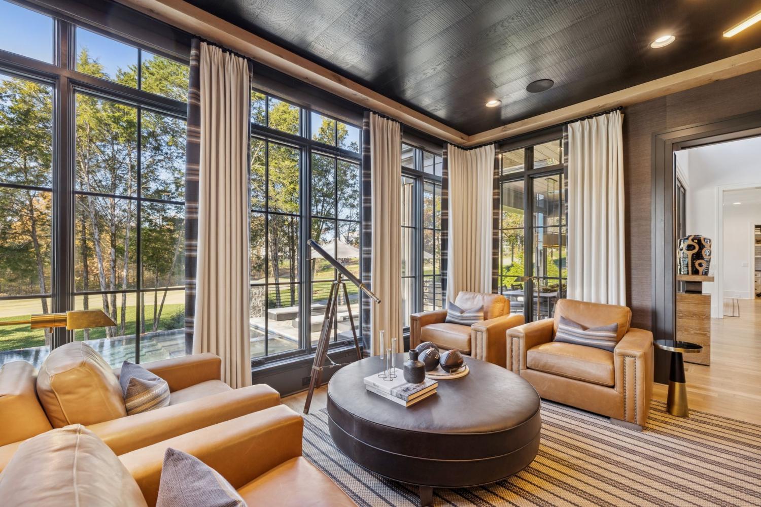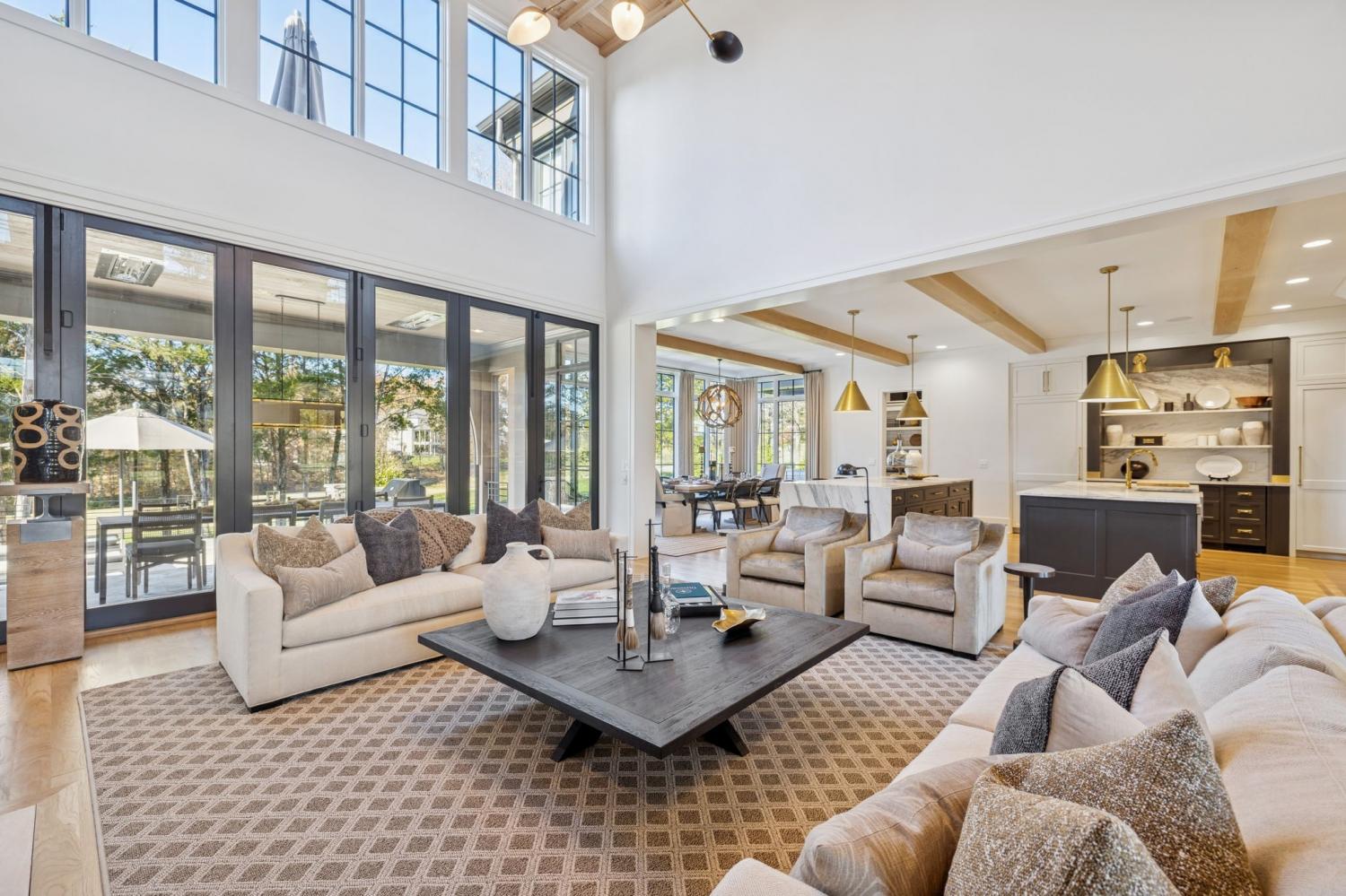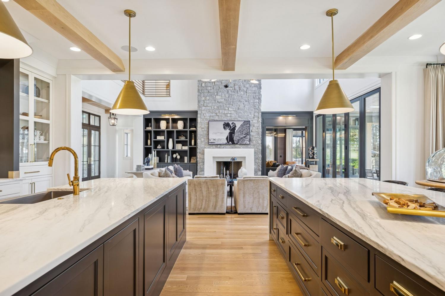 This extraordinary residence is a showcase of architectural brilliance and refined elegance. From its commanding exterior presence to its meticulously curated interiors, every detail has been designed to impress. Step into a private resort experience with an infinity-edge pool that mirrors the sunset sky, creating a breathtaking backdrop for relaxation and entertainment. Multiple terraces and lounging areas invite you to unwind, while a custom stone firepit and an outdoor kitchen with built-in grill make alfresco dining and gatherings unforgettable.The seamless integration of indoor and outdoor spaces ensures that every moment is elevated by panoramic views and impeccable design. Inside, soaring ceilings and walls of glass flood the home with natural light, highlighting the craftsmanship and luxurious finishes throughout. The grand living room features a dramatic stone fireplace and an open layout perfect for entertaining. The dining room, framed by floor-to-ceiling windows, offers an intimate yet airy setting for elegant meals. The chef’s kitchen is a masterpiece, boasting dual waterfall islands in striking marble, professional-grade appliances, and custom cabinetry. Just steps away, a bespoke bar area steals the show with its mirrored shelving, brass accents, and extensive wine storage. A walk-up window connects the bar to the outdoor lounge, creating a unique experience for serving guests indoors and out. The primary suite is a sanctuary of comfort and style, featuring a vaulted ceiling with exposed beams, a stone fireplace, and custom built-ins. The spa-inspired bathroom offers dual vanities, a freestanding soaking tub, and gold fixtures that exude elegance. Additional sitting rooms and bonus spaces provide versatility for relaxation or entertainment, each designed with rich textures and modern sophistication. From the infinity pool to the whiskey lounge, this estate is more than a home—it’s a statement of luxury living at its highest level.