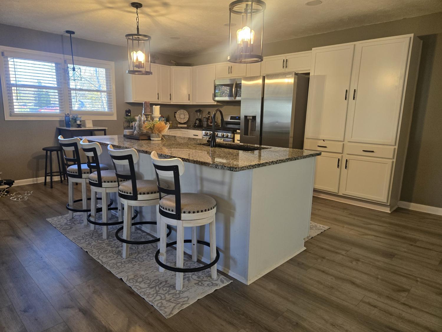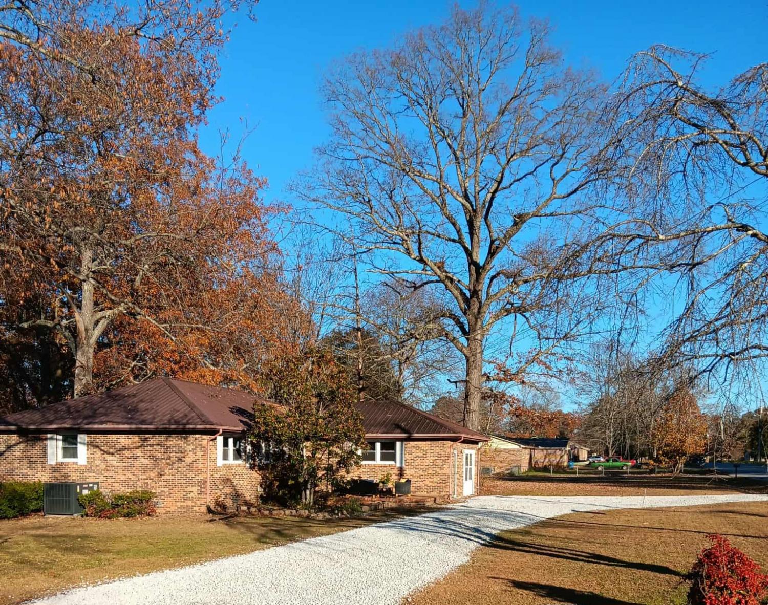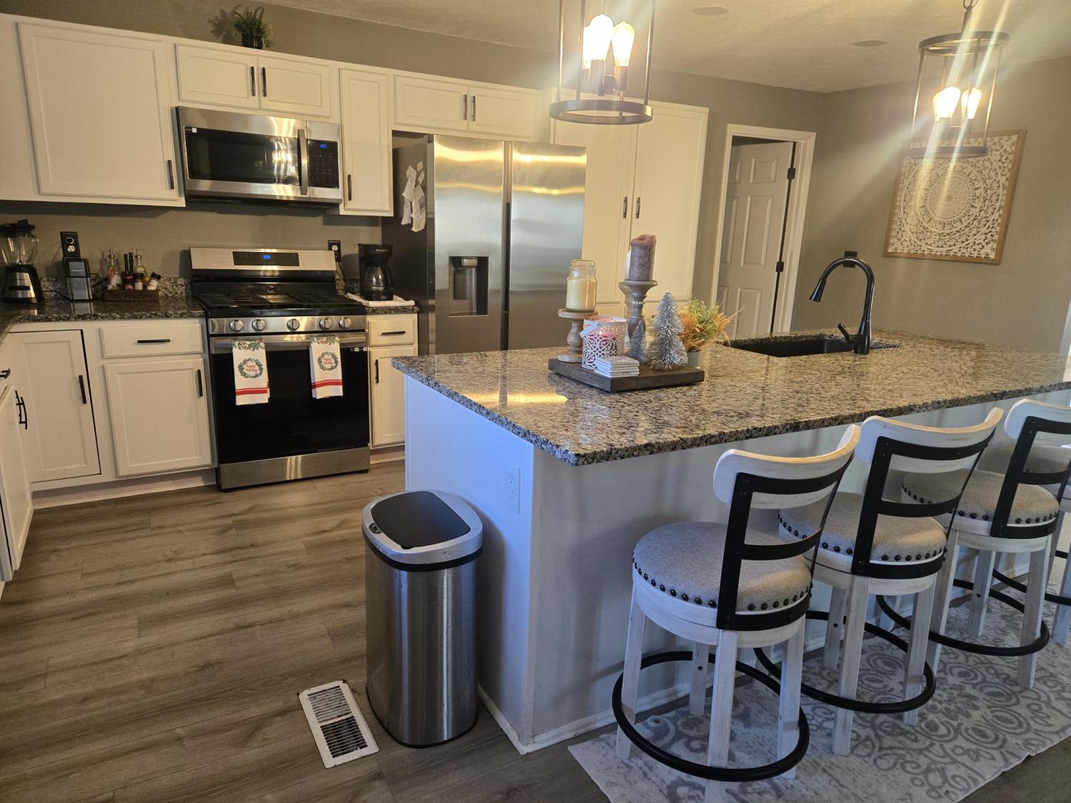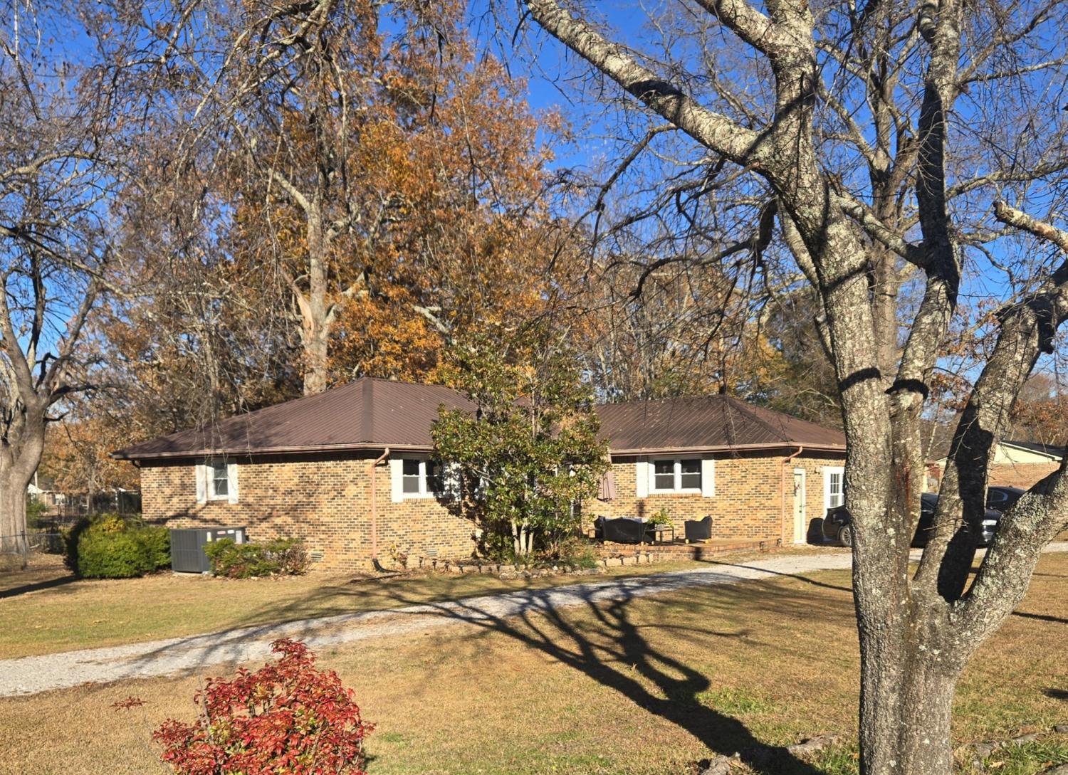 Beautifully renovated 4-bedroom, 2-bath brick home situated on a level 1-acre corner lot in a convenient Manchester location. This home has been thoughtfully updated from top to bottom, featuring a new split-unit HVAC system with natural gas heat, new plumbing, lighting, flooring, windows, front door, French doors, cabinets, and granite countertops. The newly opened floor plan creates an inviting flow from the fully remodeled, spacious kitchen into the living room—complete with a cozy electric fireplace—and the adjacent dining area. Metal roof is approximately 10 years old. Home includes new stainless steel appliances: refrigerator, gas range, and dishwasher. Outside, enjoy a fenced backyard with a storage shed. The former garage has been converted into the primary bedroom and could also function as an excellent bonus room, depending on your needs. The horse-shoe driveway provides plenty of parking and access to two separate streets. Move-in ready and beautifully updated—this one checks all the boxes!