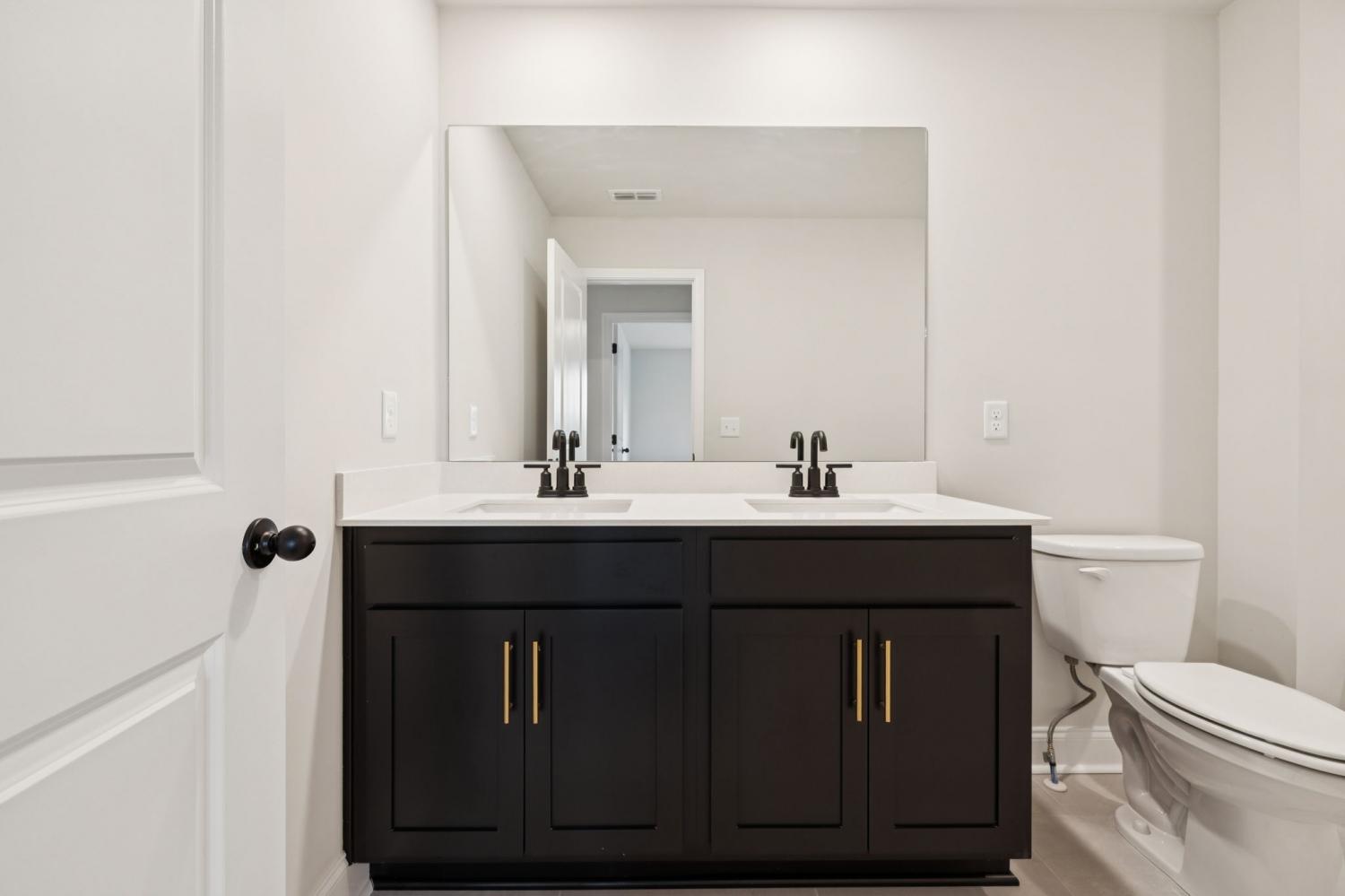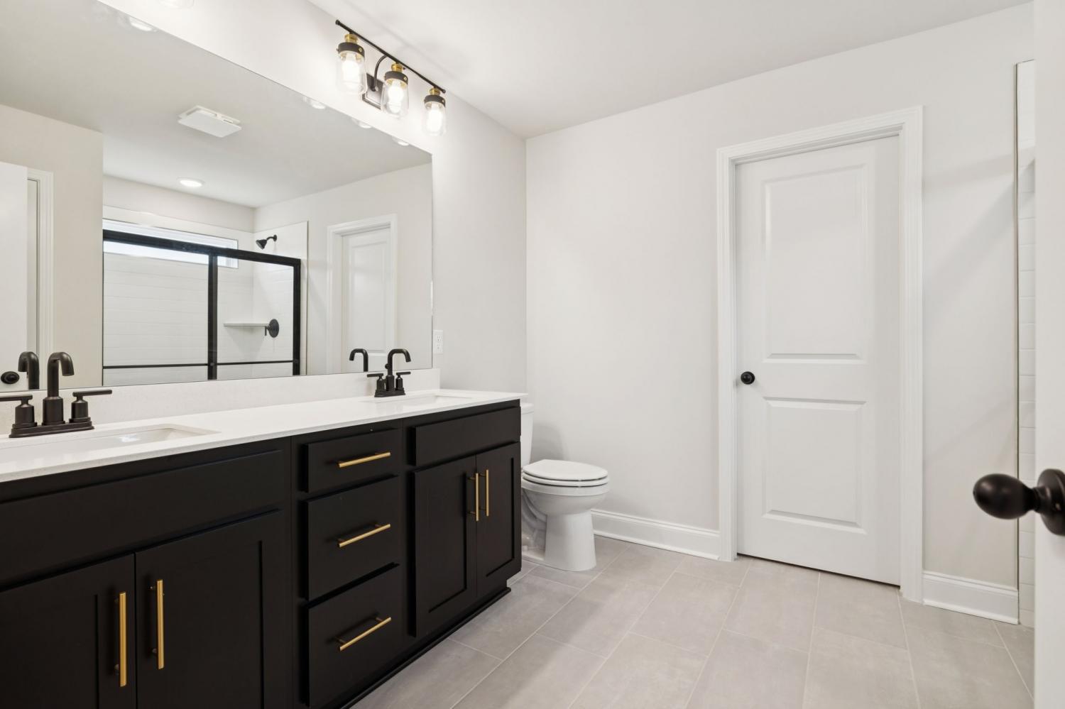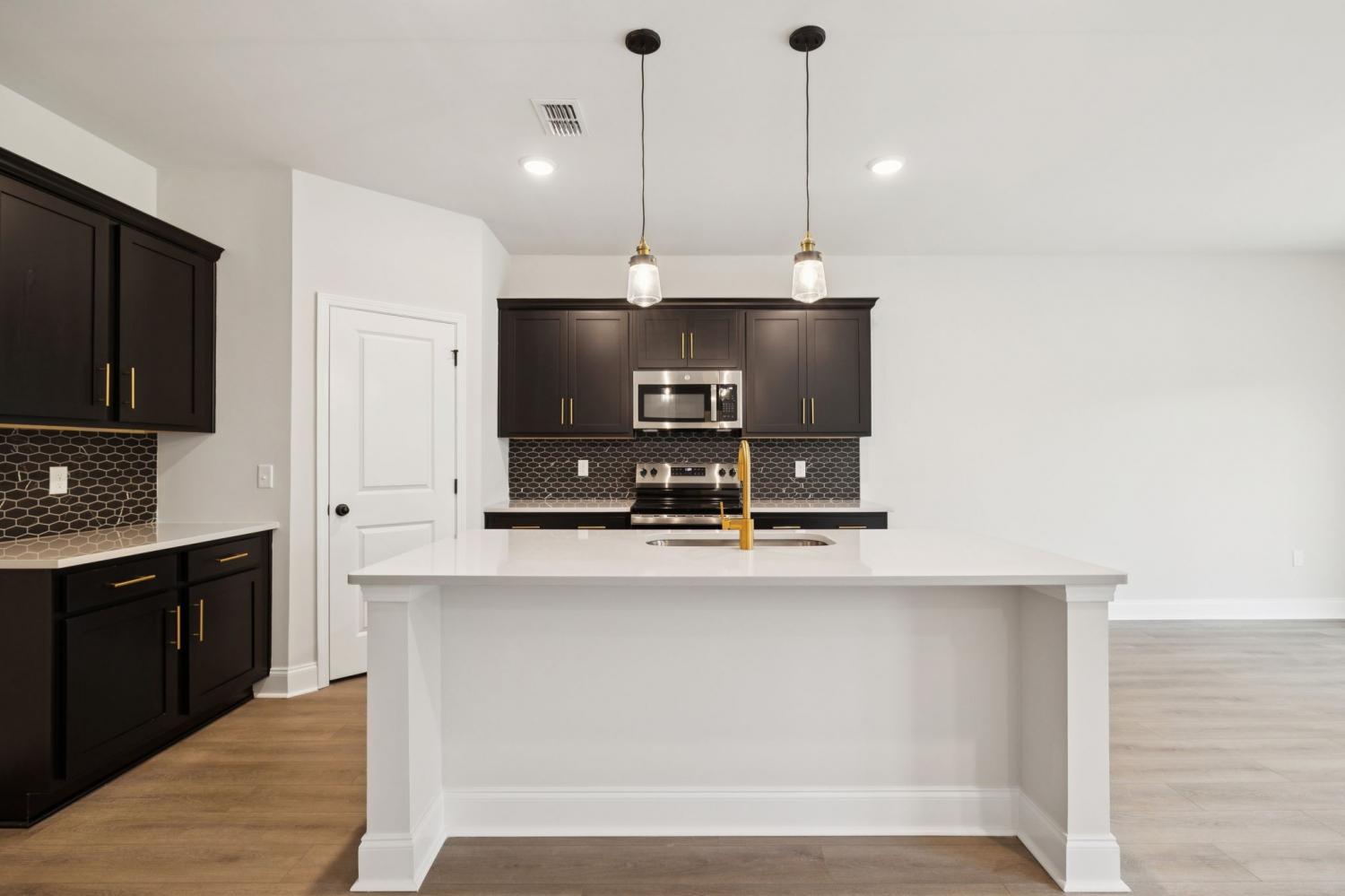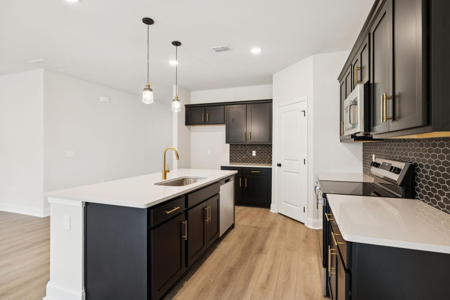 Lot 156. This open-concept Bartlett floorplan by Ashton Woods has spacious living areas ideal for entertaining. The L-shaped layout features the dining area adjacent to the kitchen which includes designer-curated finishes from the luxurious Noir Collection such as black and gold pendant lights, black tile backsplash, grey quartz counters, black cabinets with gold hardware, and a single-bowl stainless sink. Enjoy outdoor living on this wooded lot with a covered back porch. Flex room off the foyer is suitable for a home office, formal dining or sitting room. Upstairs you'll find a versatile loft space and oversized primary suite with large walk-in closet as well as three secondary bedrooms, additional full bath with dual vanity, and upstairs laundry room. See sales agent for amazing holiday incentives.